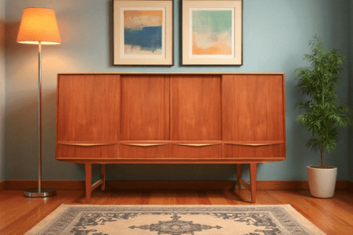 På ingång , ett vackert skåp i teak med lådor med handtag och skjutluckor med