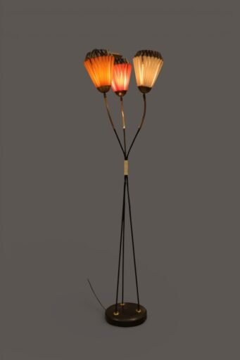En mycket stilren och samtidigt kaxig trearmad golvlampa från 1960-talet, som verkligen fångar ögat. Lampan