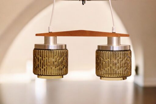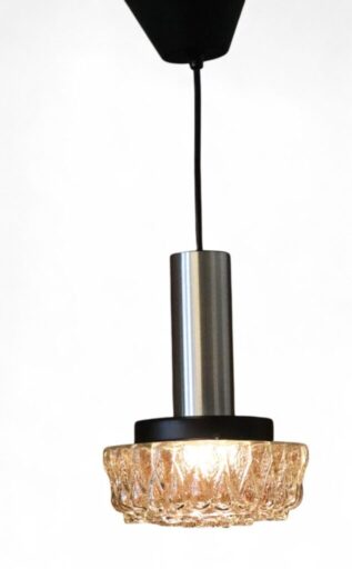 Läcker dansk taklampa med glas som har struktur. Lampfästet är i borstad samt svartlackerad metall.