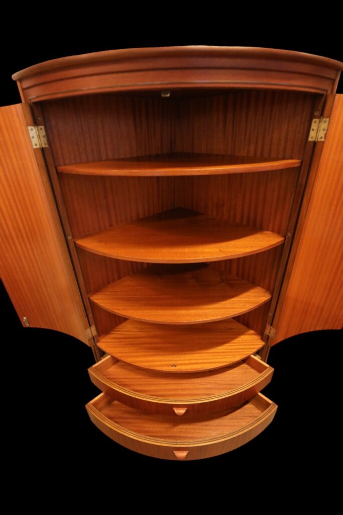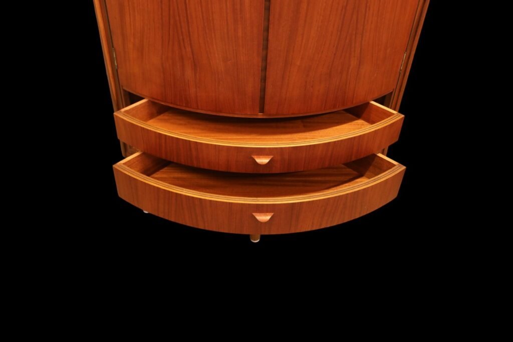 Fronten på skåpet är välvt och i skåpet finns tre hyllplan samt bottenhylla med mycket bra förvaringsmöjligheter. Under luckorna finns två lådor som liksom dörrarna har välvd front. Lådorna är kilformade och går på gejder med fin passform. På lådfronten finns smäckra handtag.