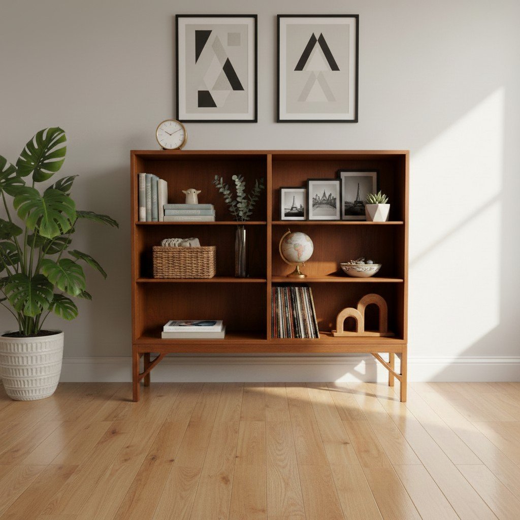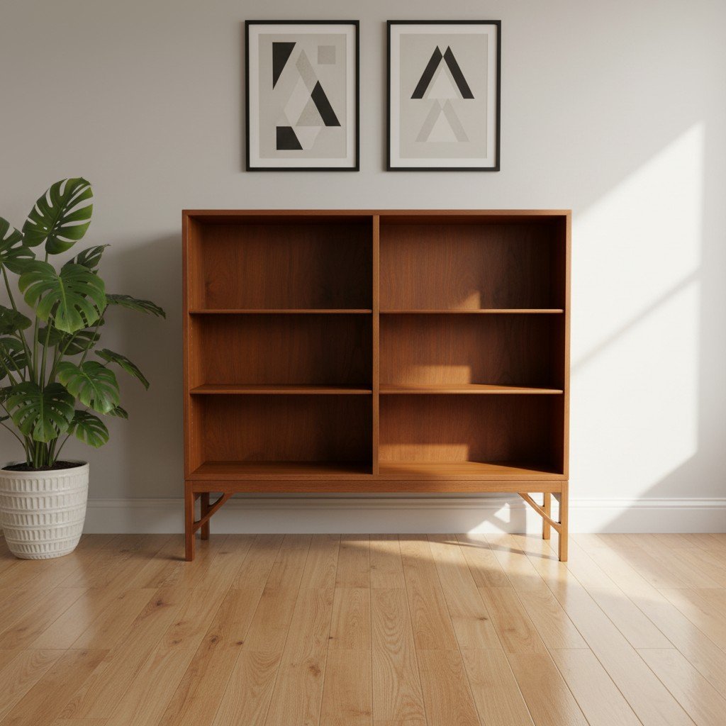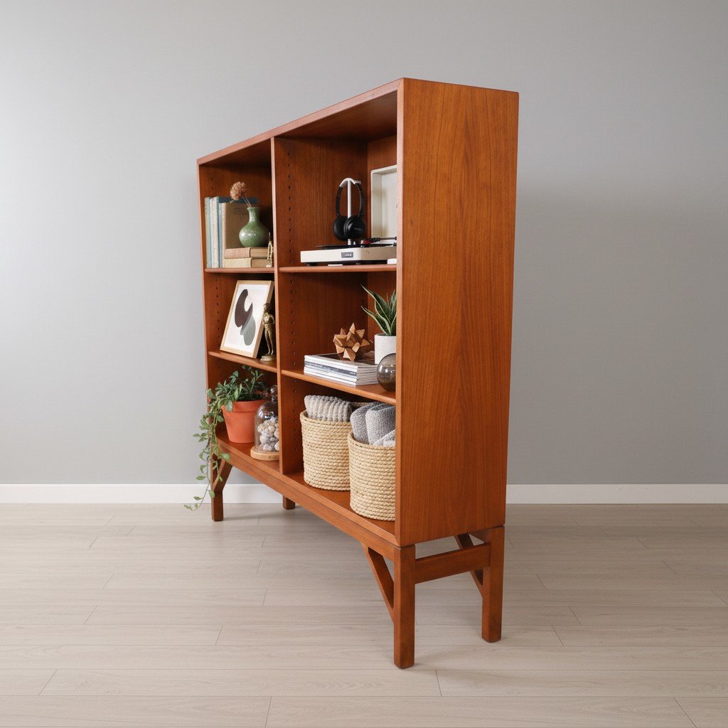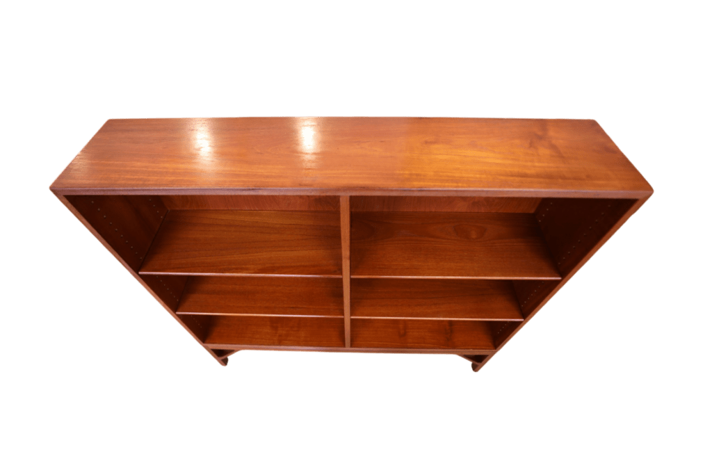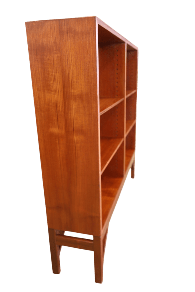 Hela bokhyllan, inklusive benen, är tillverkad i teak, vilket är relativt ovanlig och eftertraktat på marknaden! Benen är strategiskt placerade längst ut på hörnen och har de karaktäristiska snedställda ”stagen” som sträcker sig från sarg ner till ben, vilket är ett välkänt signum för den eleganta och tidlösa designen av Mogensens.