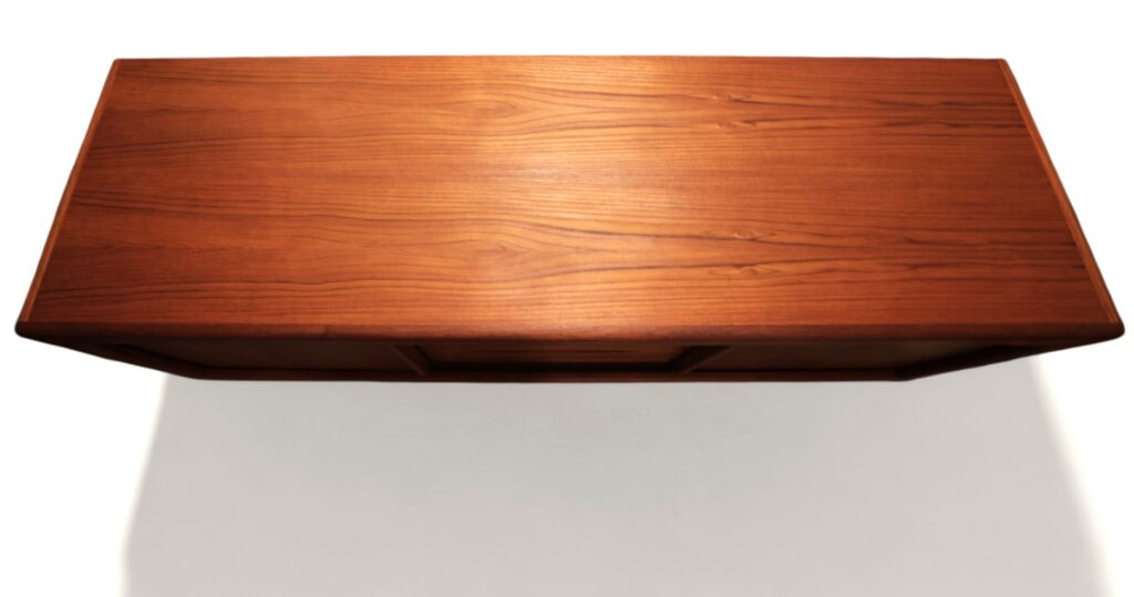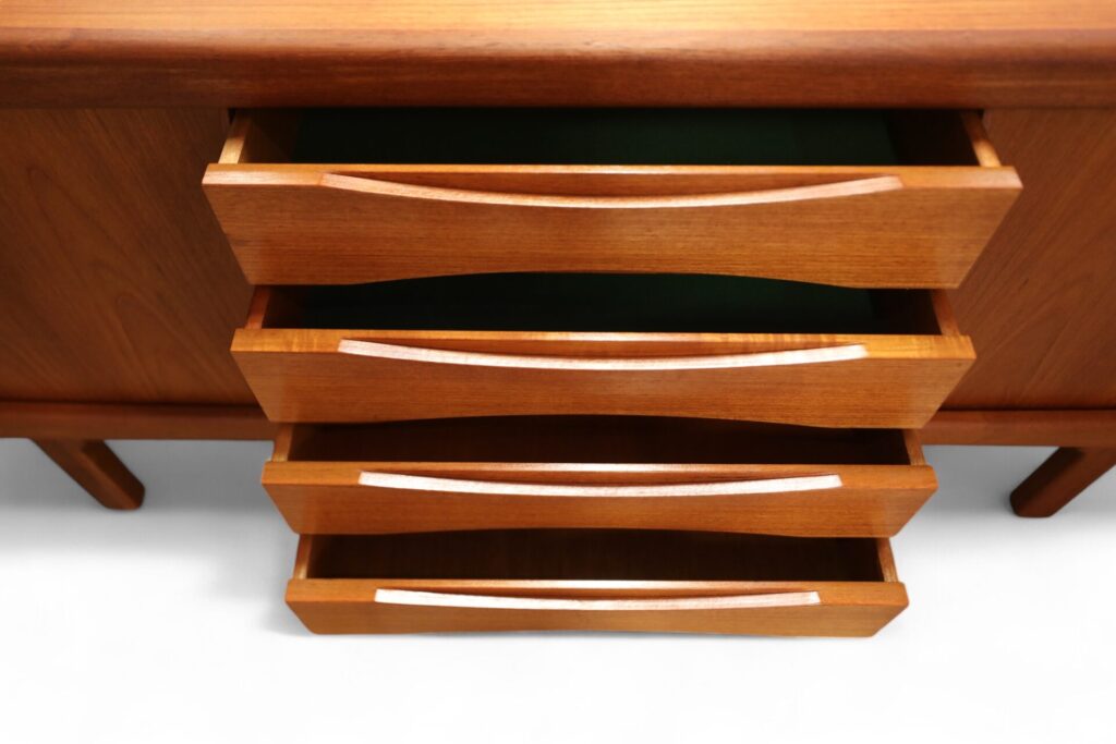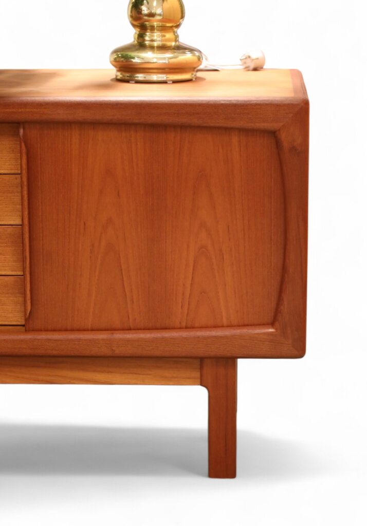 Hela sideboardet är i teak med mjuka kanter och former över hela möbeln. Det har två skjutluckor med fyra lådor i mitten och både skjutluckor samt lådor har eleganta handtag som blir en del av möbelns dekoration.