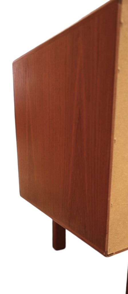 Bakom skjutluckorna finns ett hyllplan i varje skåp som båda är flytt- samt urtagbara efter eget önskemål. Även invändigt är möbeln påkostad med teak.