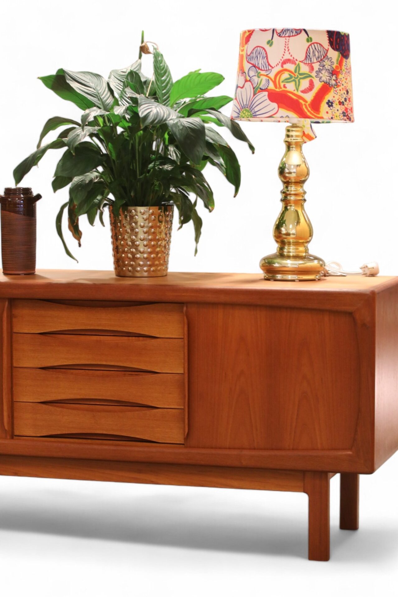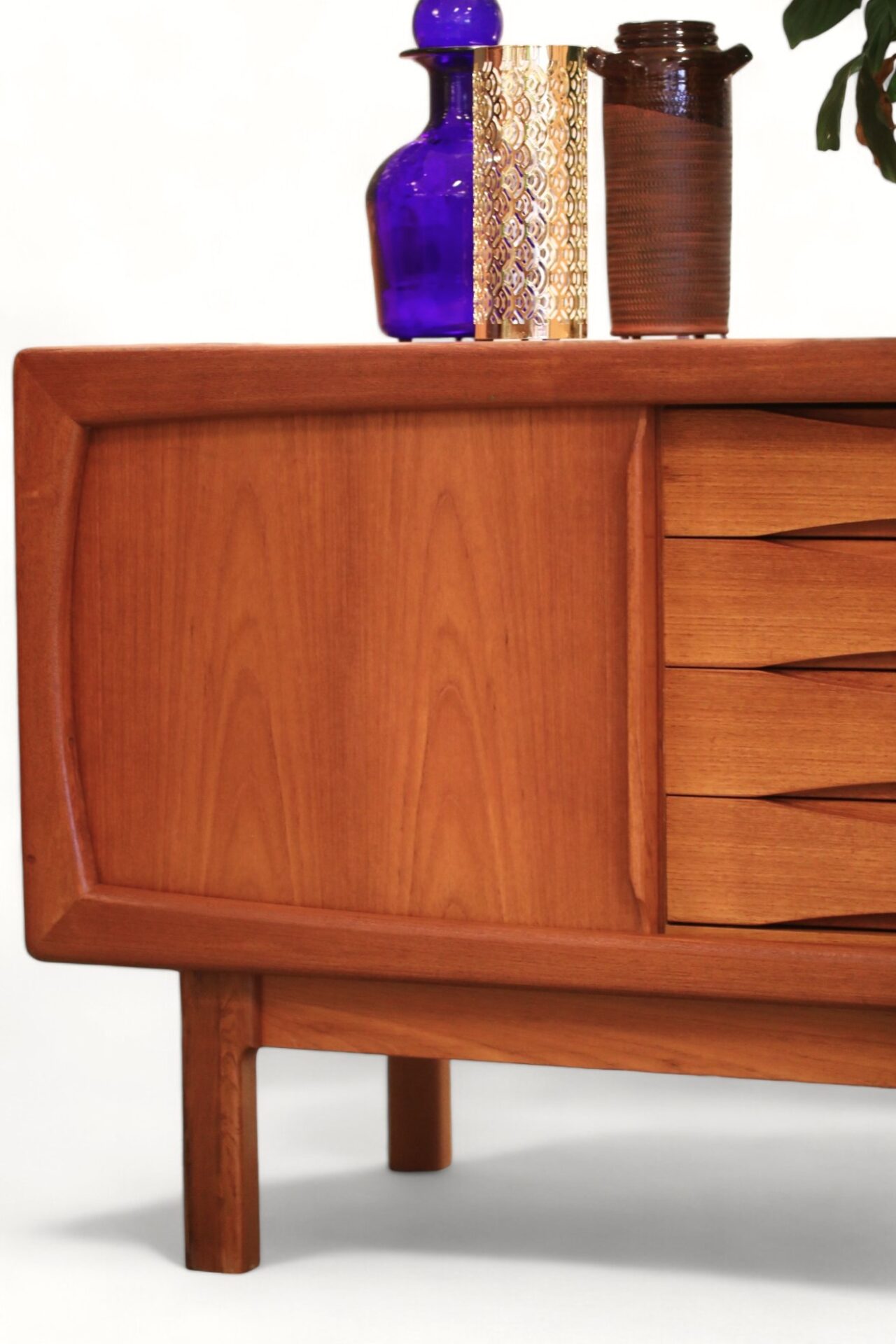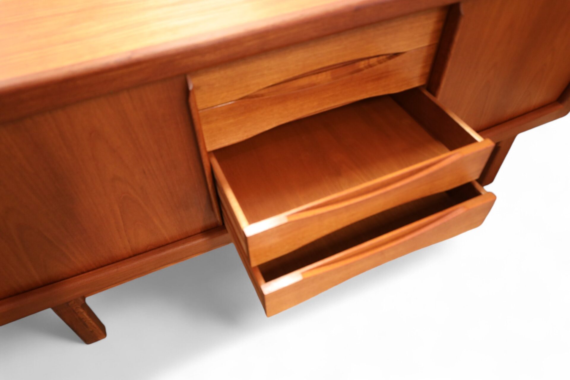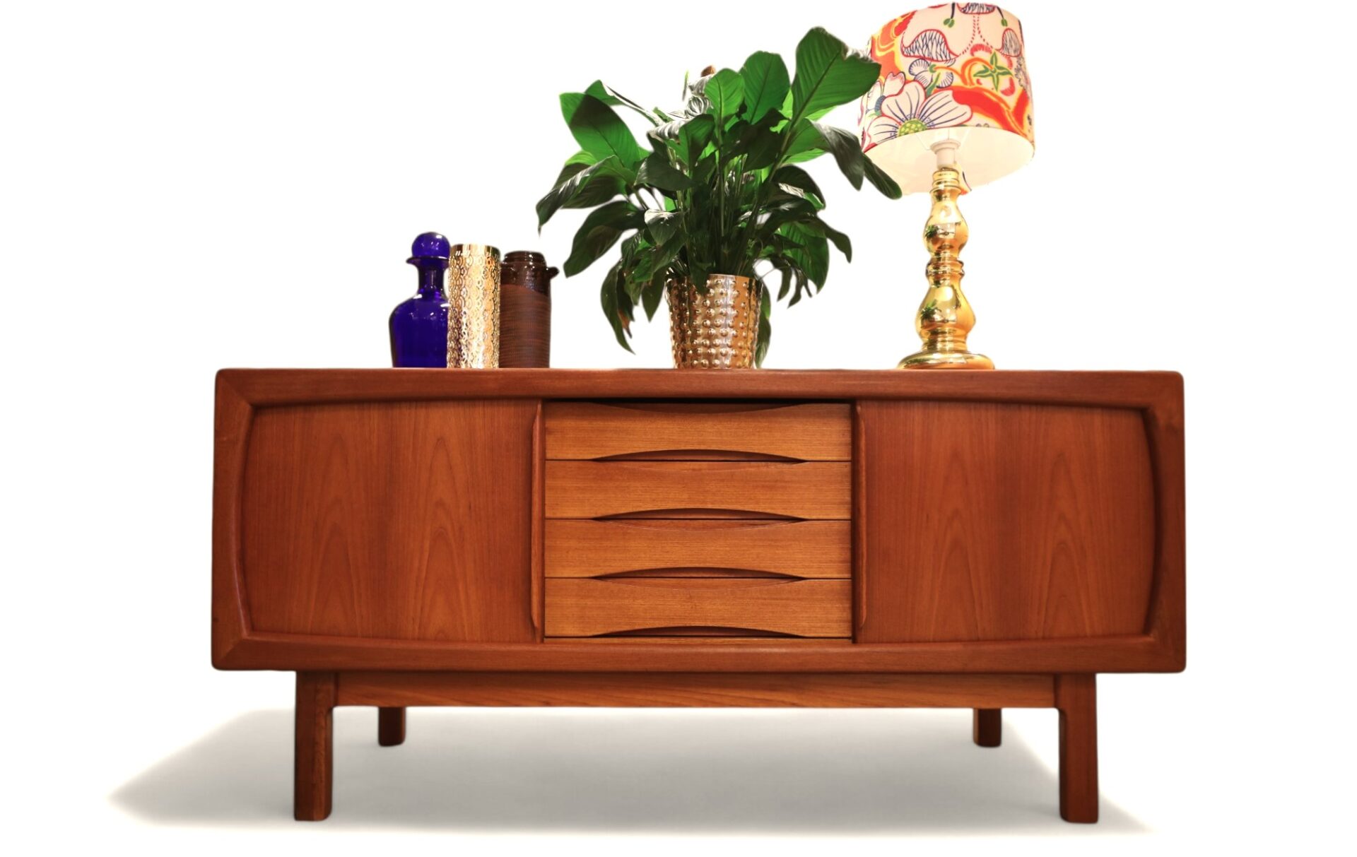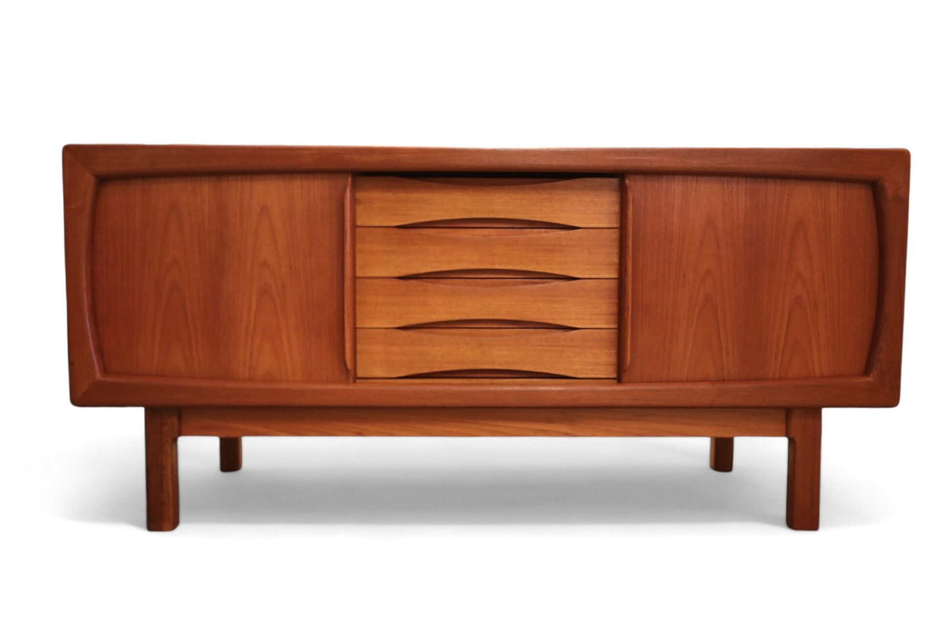 Hela sideboardet är i teak med mjuka kanter och former över hela möbeln. Det har två skjutluckor med fyra lådor i mitten och både skjutluckor samt lådor har eleganta handtag som blir en del av möbelns dekoration.