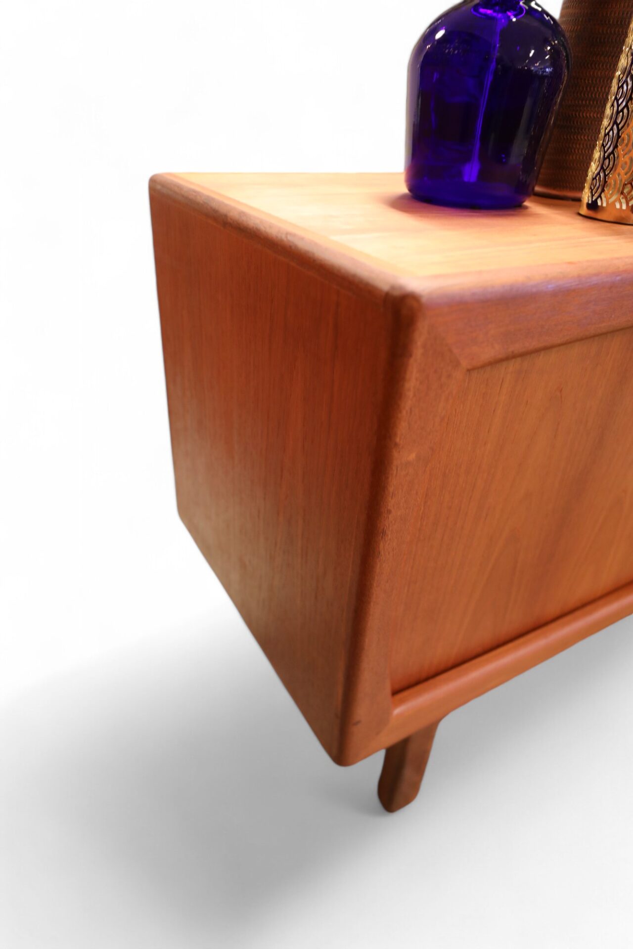 Bakom skjutluckorna finns ett hyllplan i varje skåp som båda är flytt- samt urtagbara efter eget önskemål. Även invändigt är möbeln påkostad med teak.