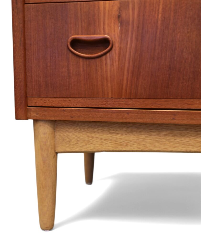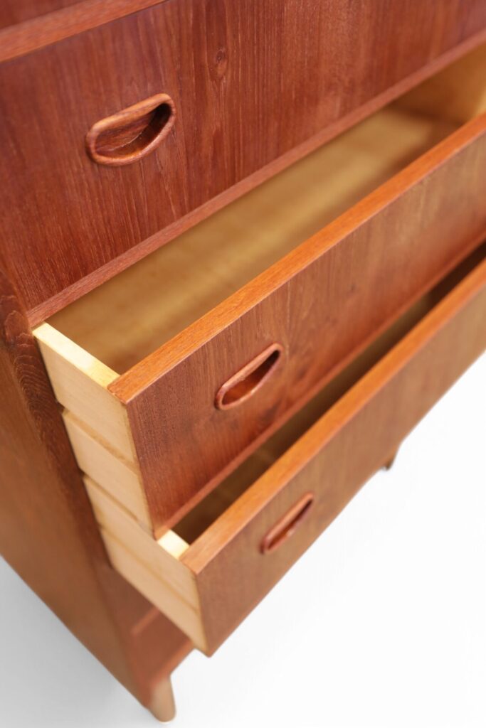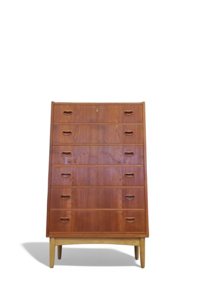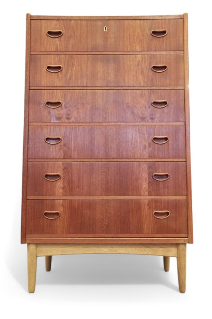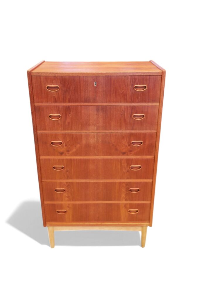 Byrån är tillverkad i teak med mycket fin ådring som verkligen framhäver träets naturliga skönhet. Den har sex lådor, och alla lådor är utrustade med eleganta, integrerade handtag för en stilren och modern look.
