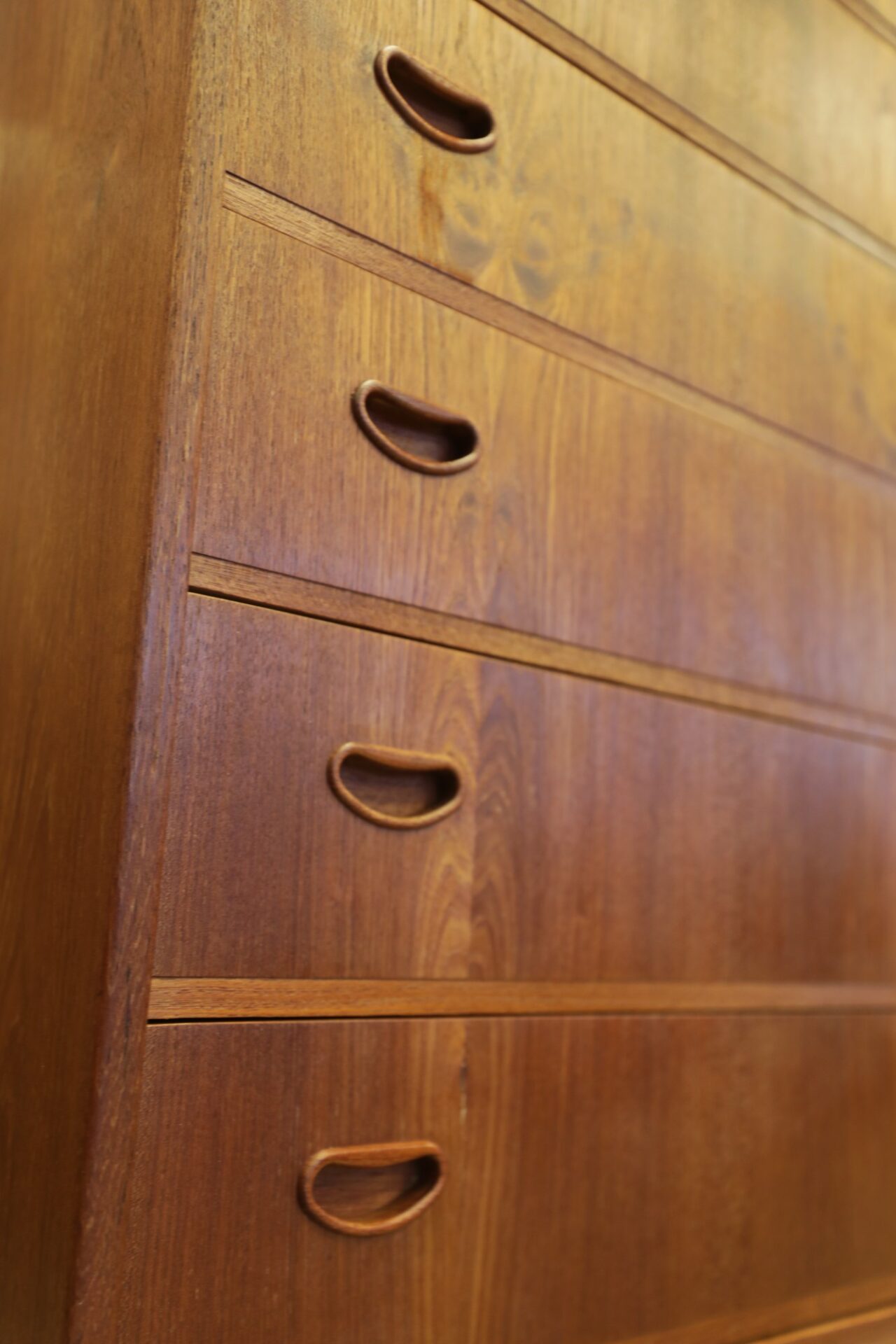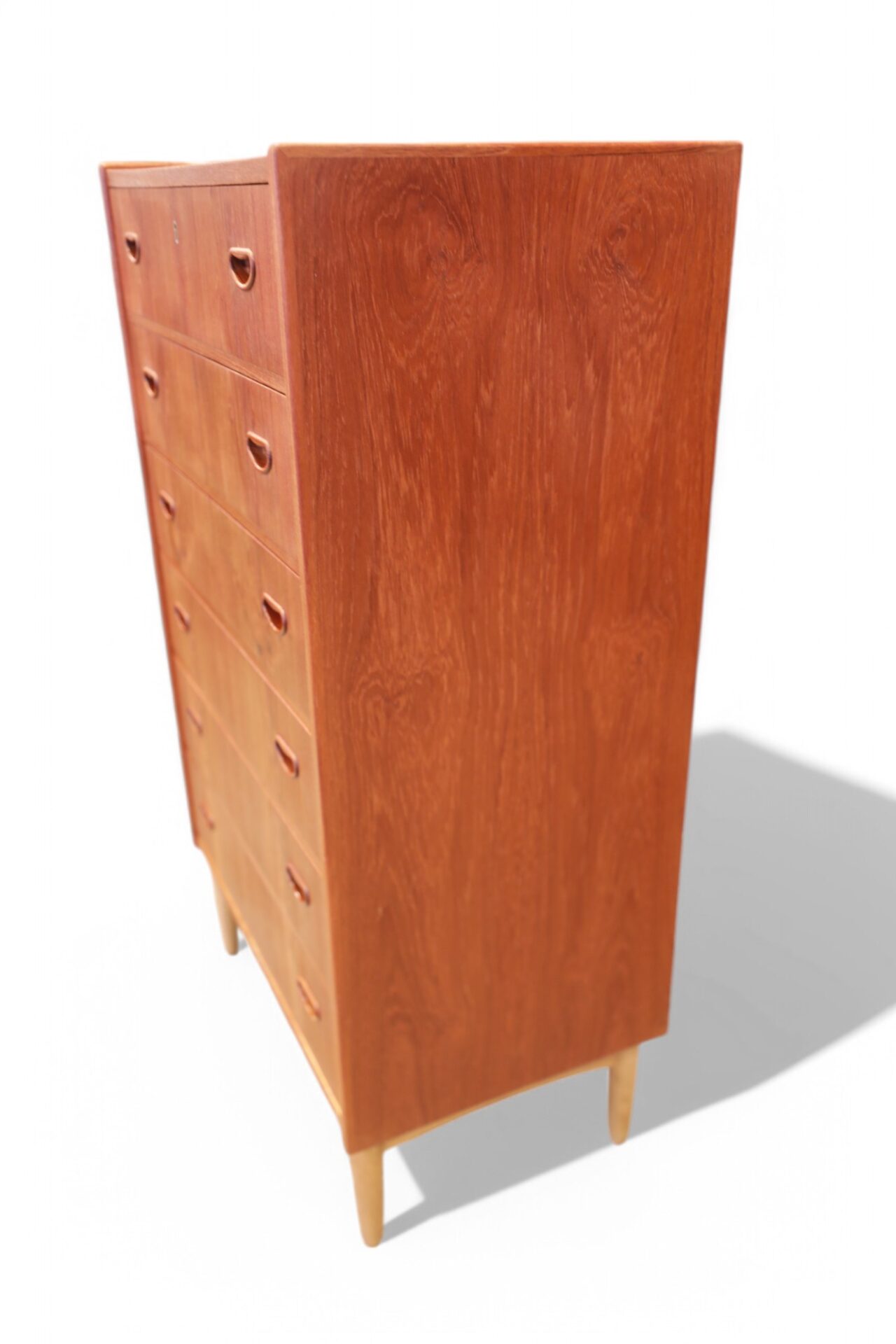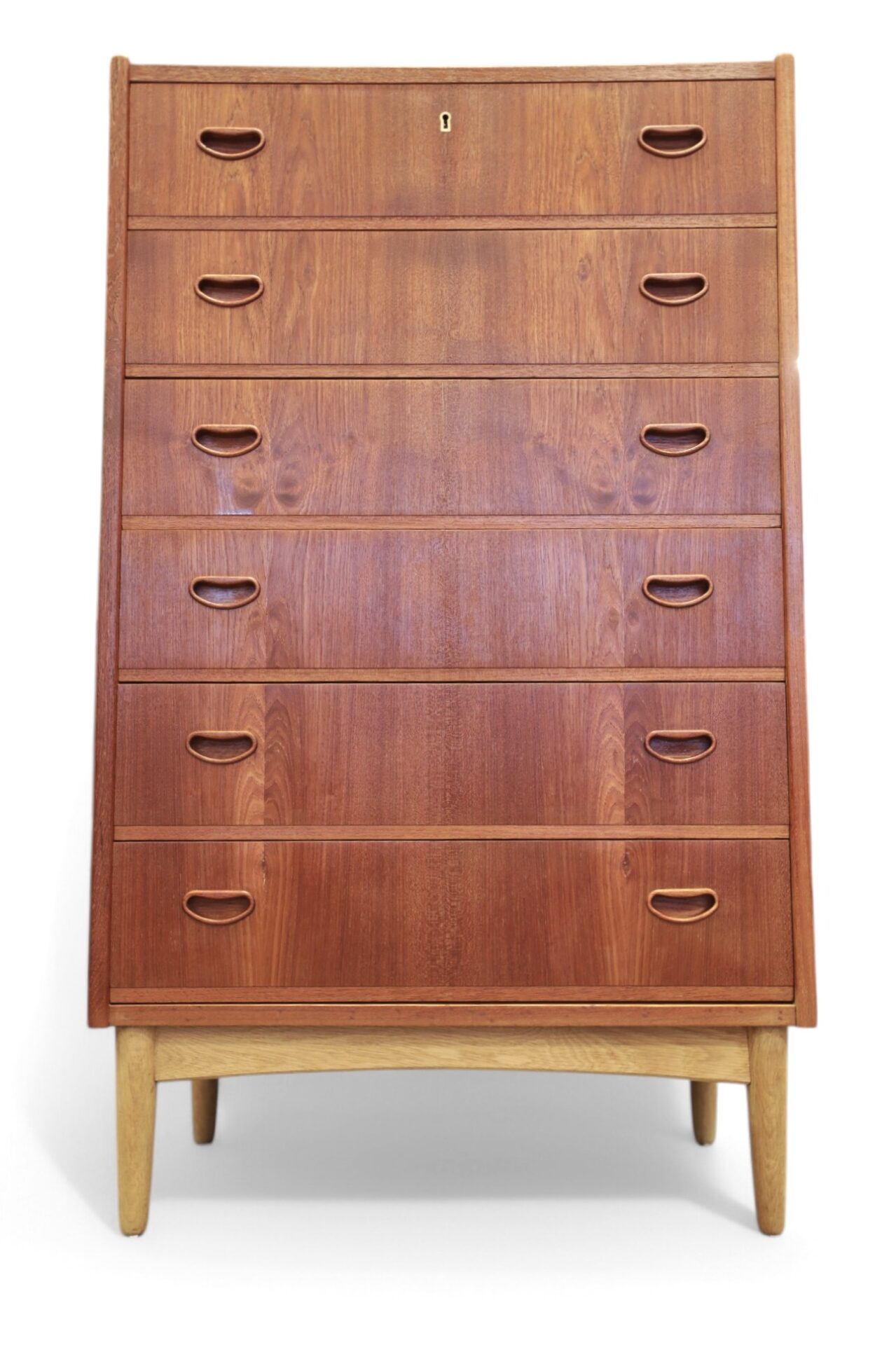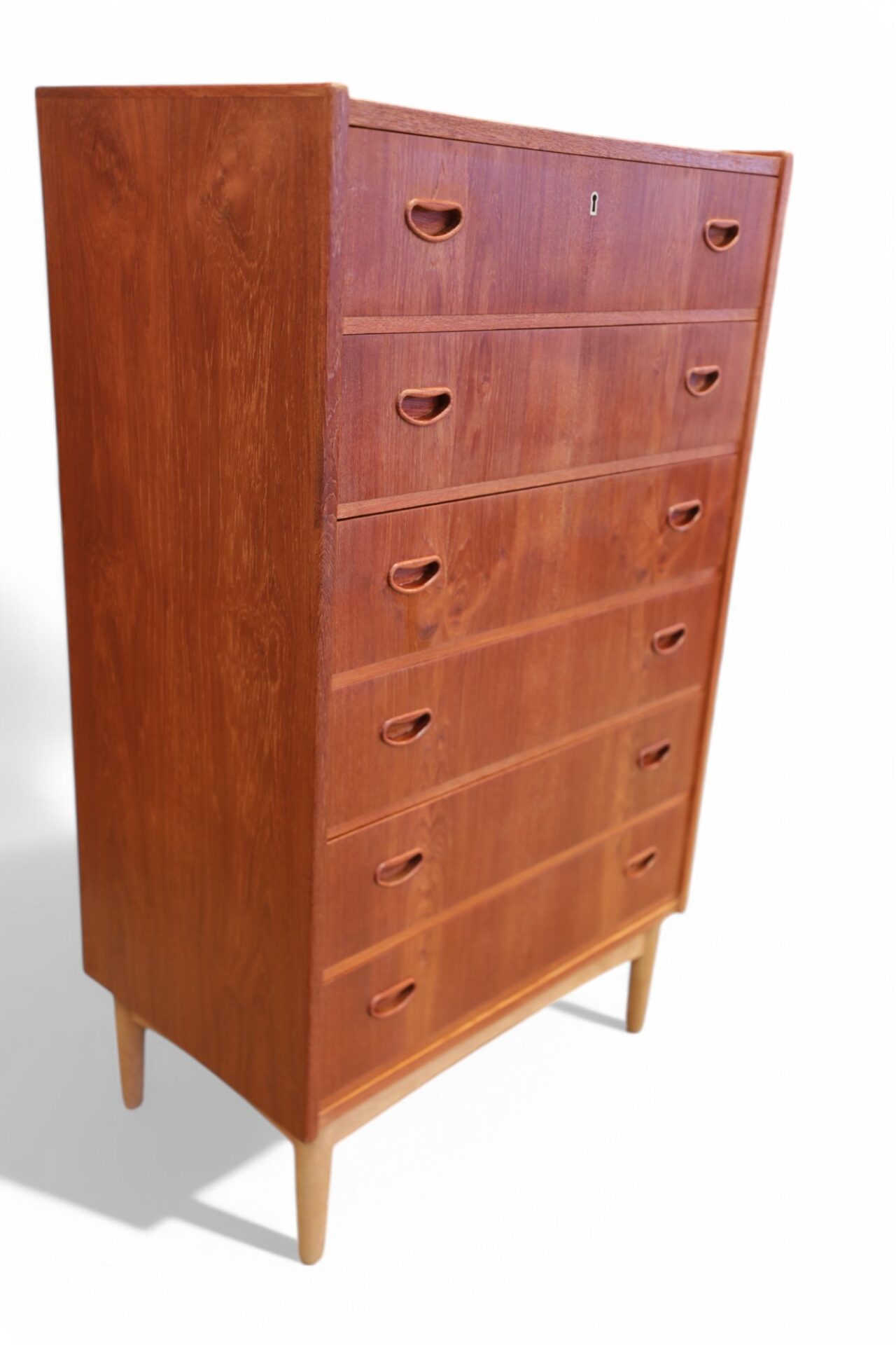 Byrån är tillverkad i teak med mycket fin ådring som verkligen framhäver träets naturliga skönhet. Den har sex lådor, och alla lådor är utrustade med eleganta, integrerade handtag för en stilren och modern look.