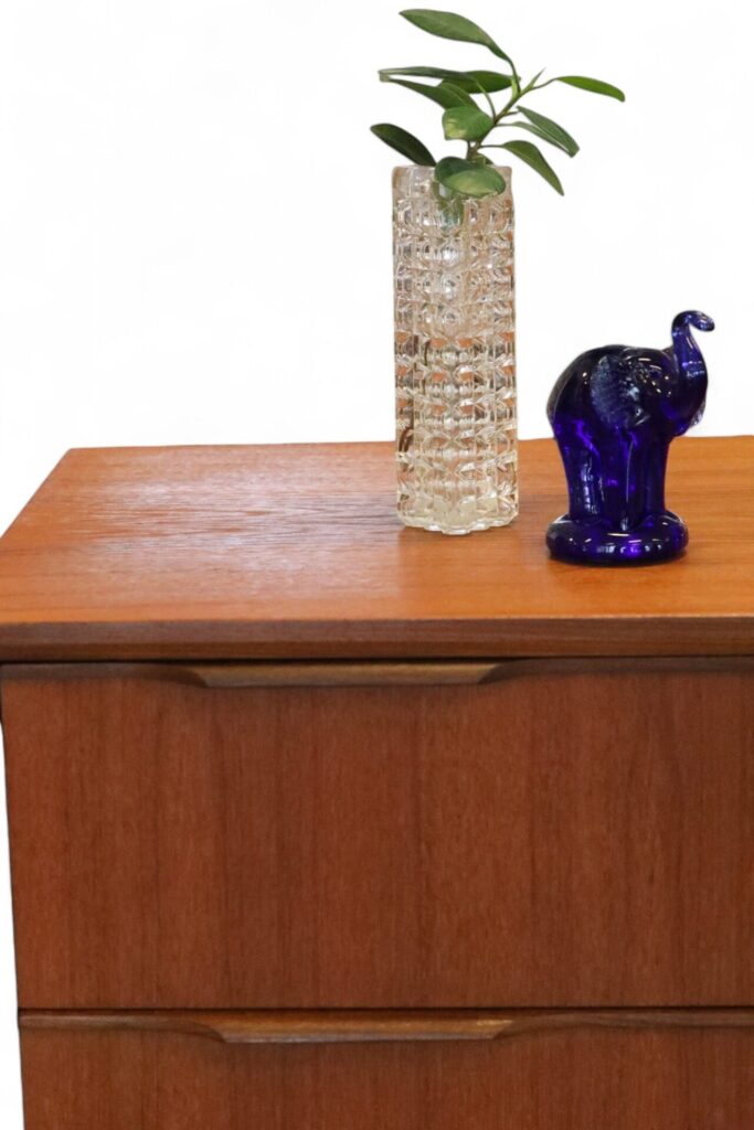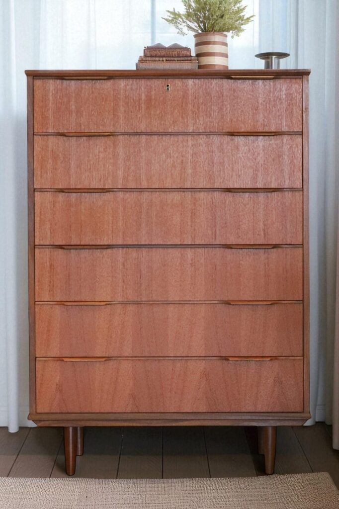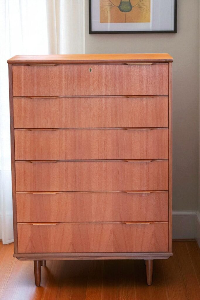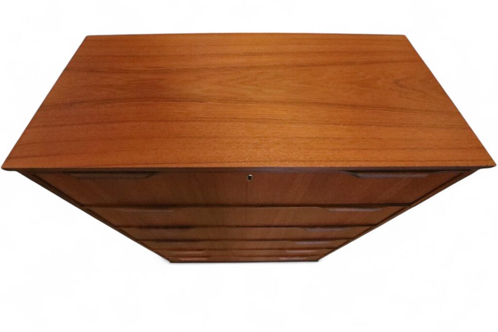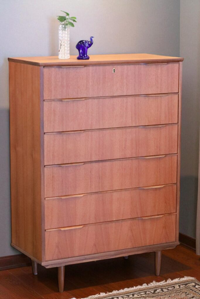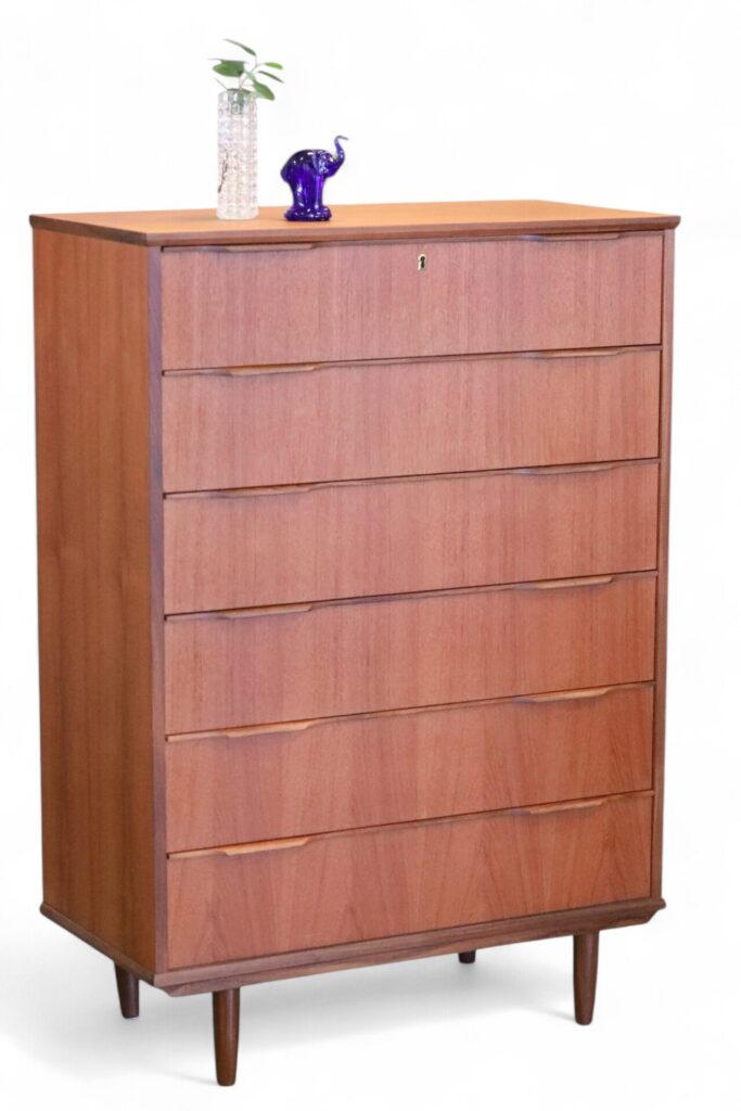 Byrån är teak med en underbar gyllenbrun ton och har sex lådor med nätta handtag. Alla lådor är stadiga och fräscha i ljust trä.