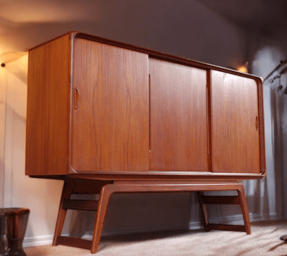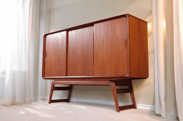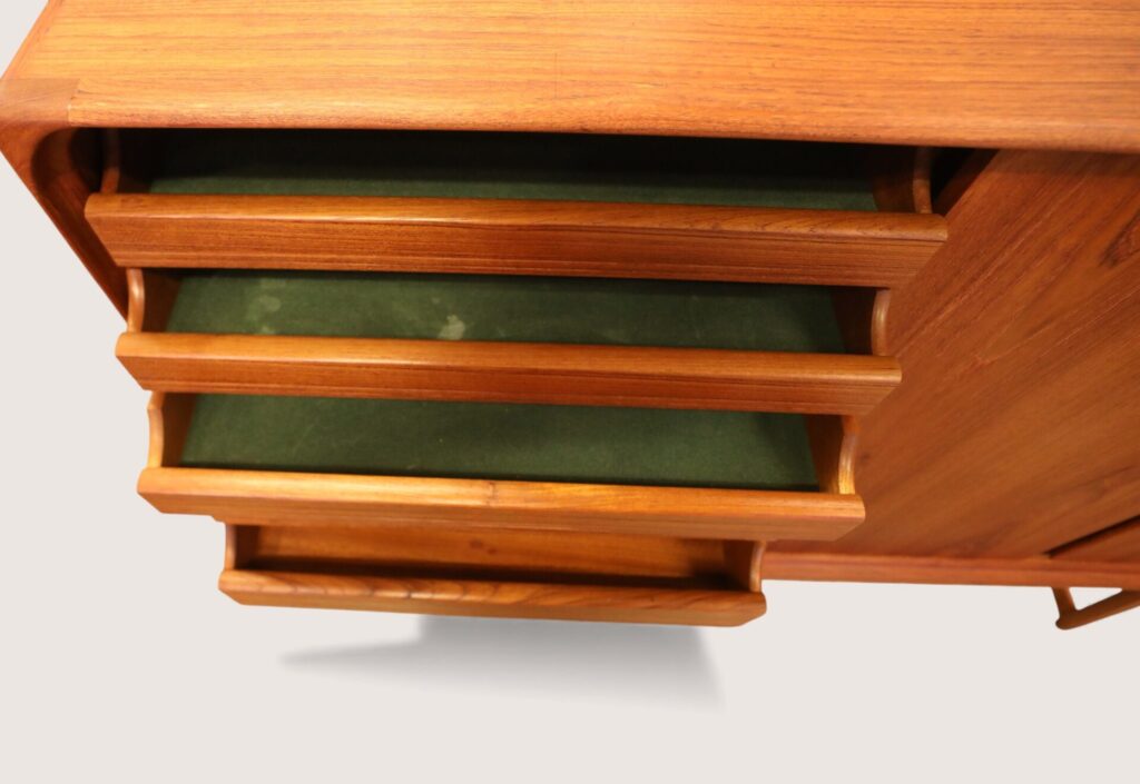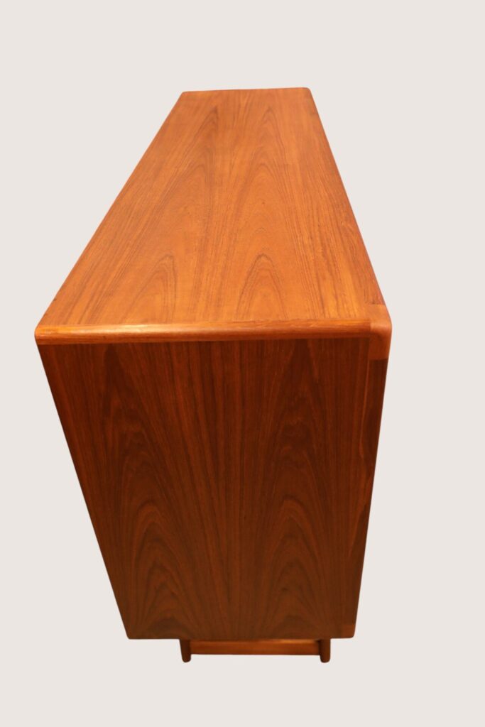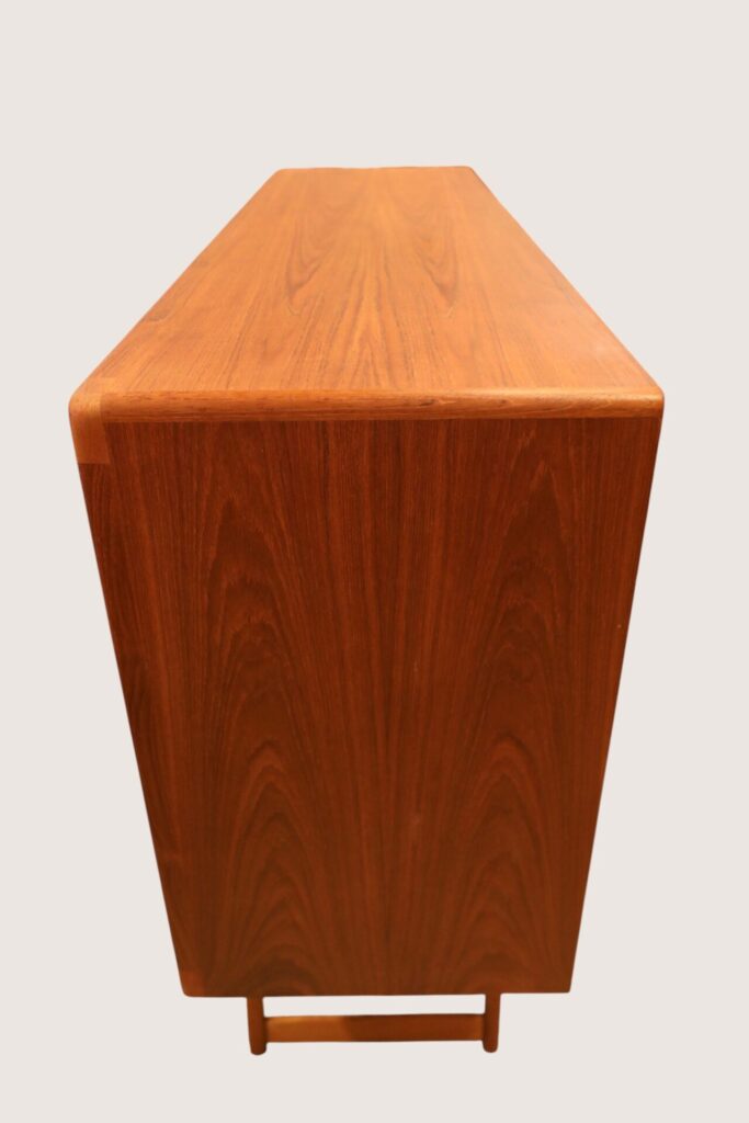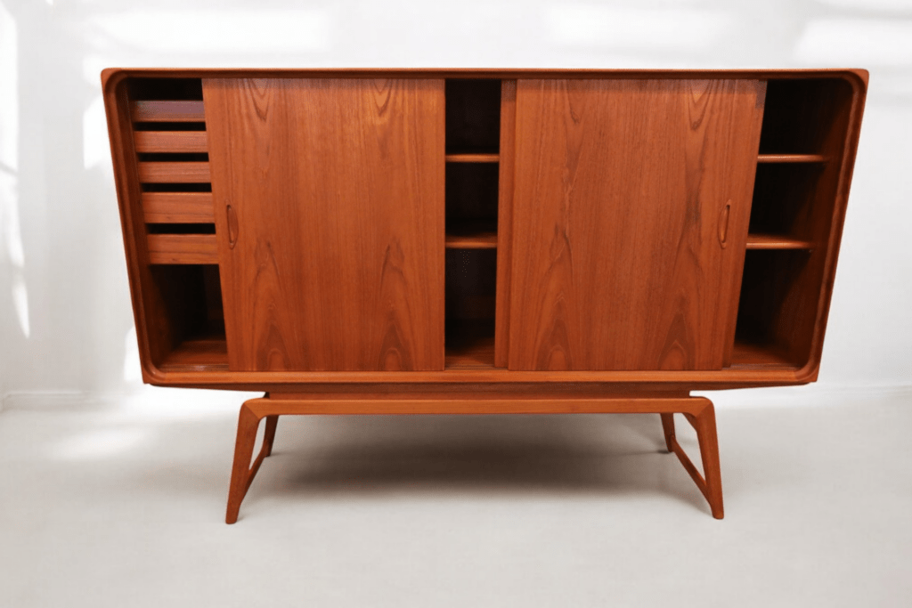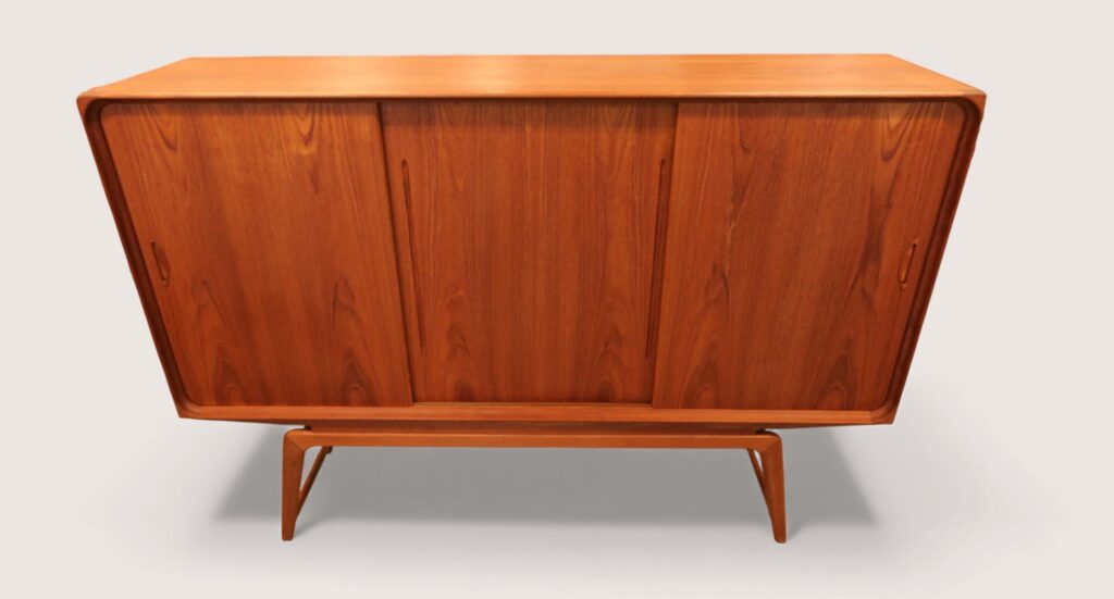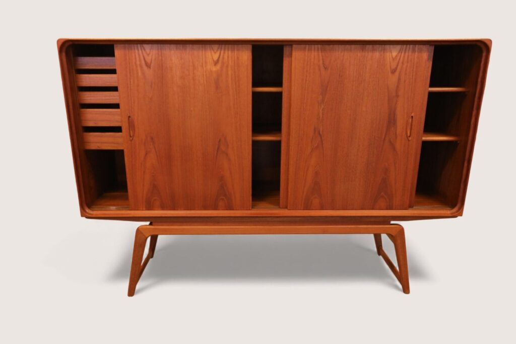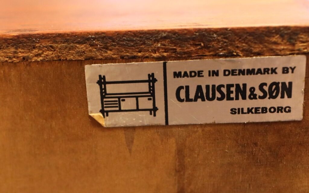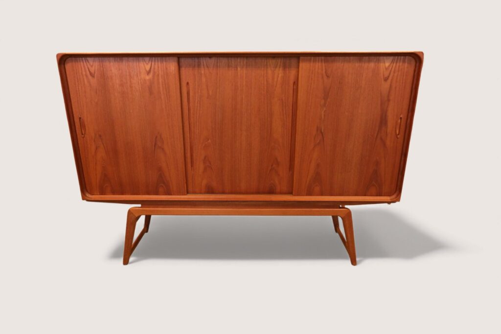 Skåp i teak med kaxigt snedställda ben formgivet av Clausen & Søn i Danmark.
