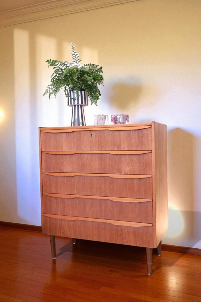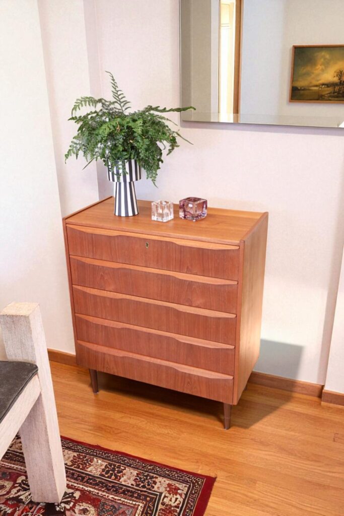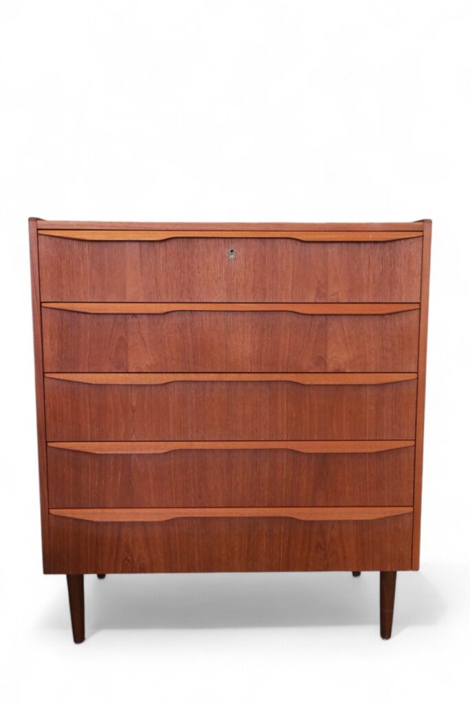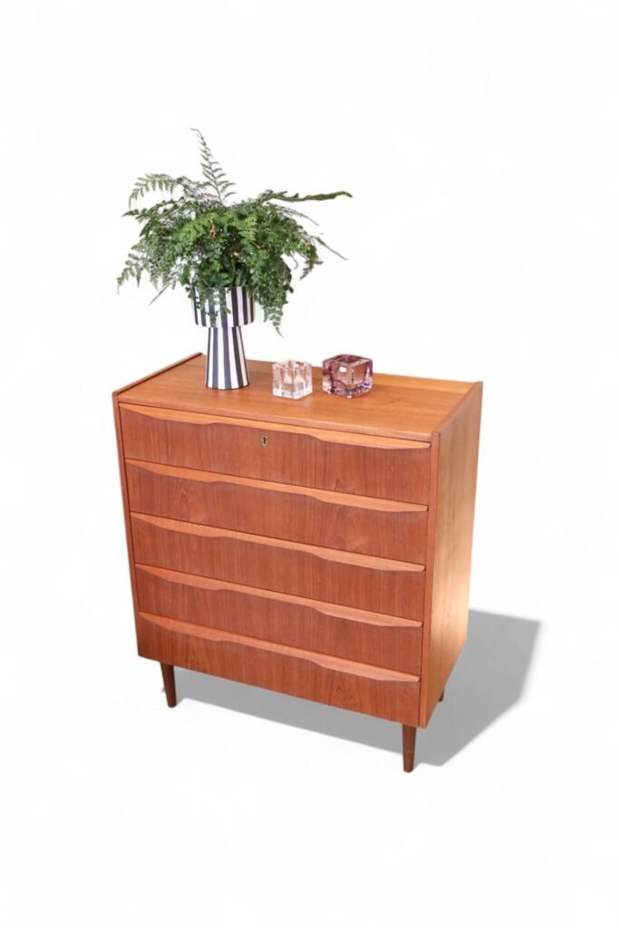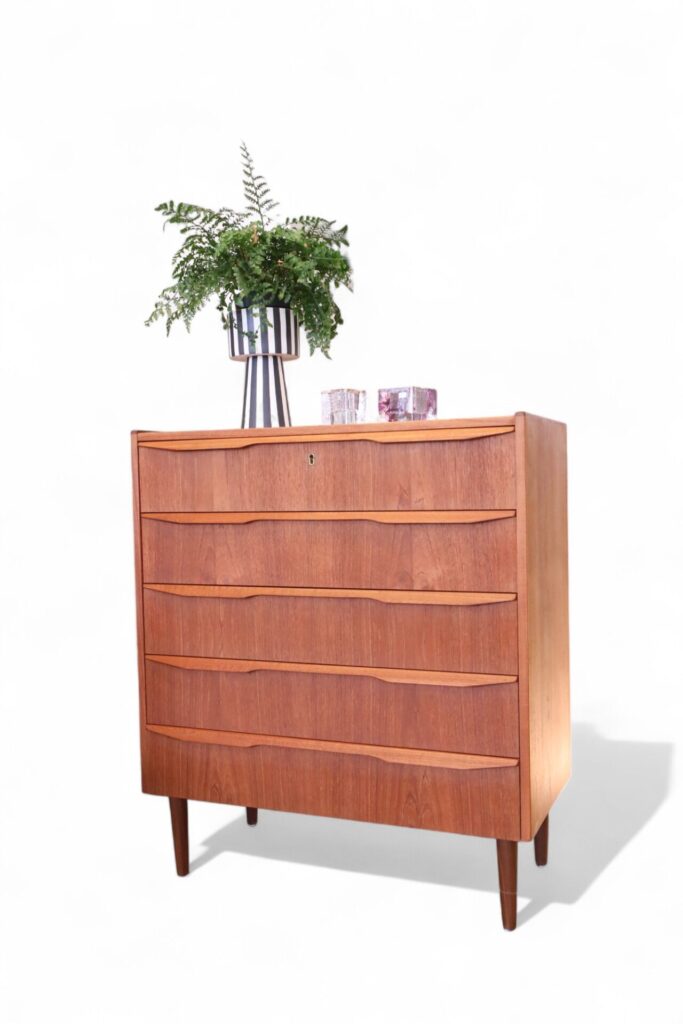 Dansk elegant byrå i teak med fem lådor. Byrån har perfekt storleken för att hänga en spegel ovanför i tex hallen eller sovrummet.