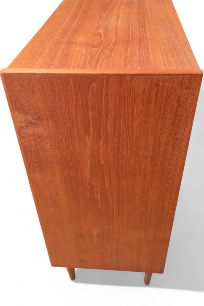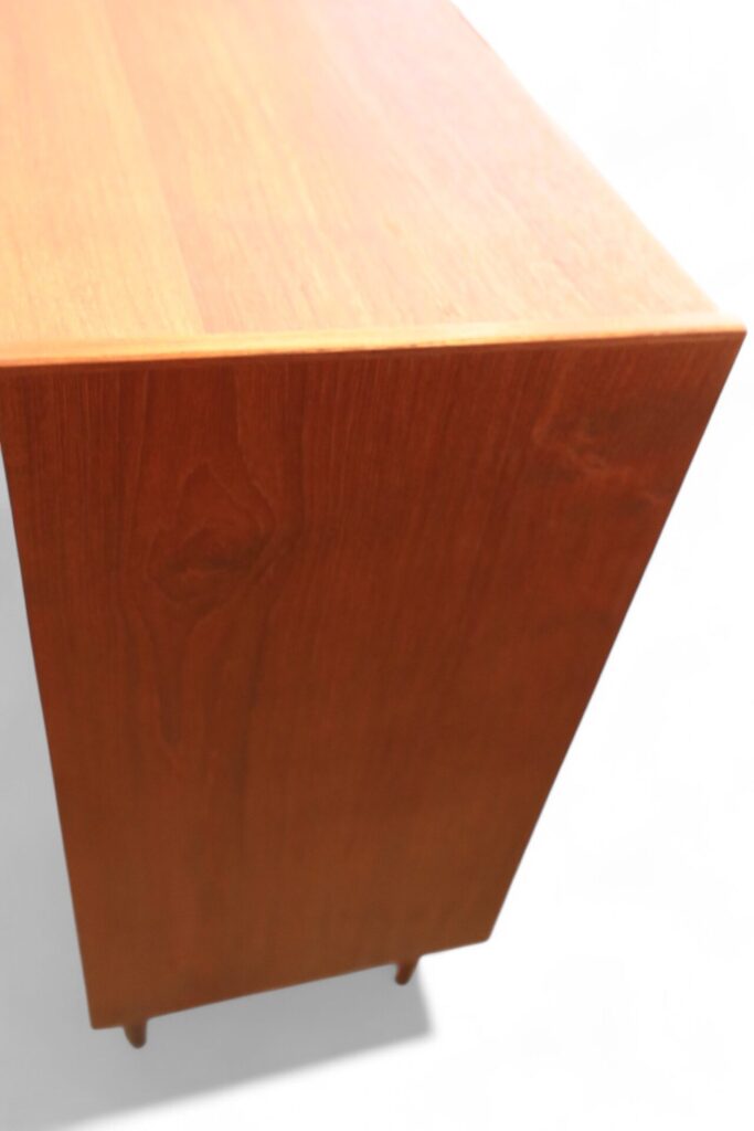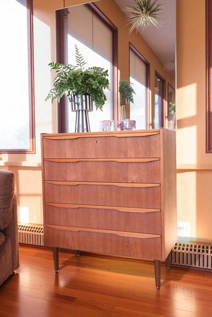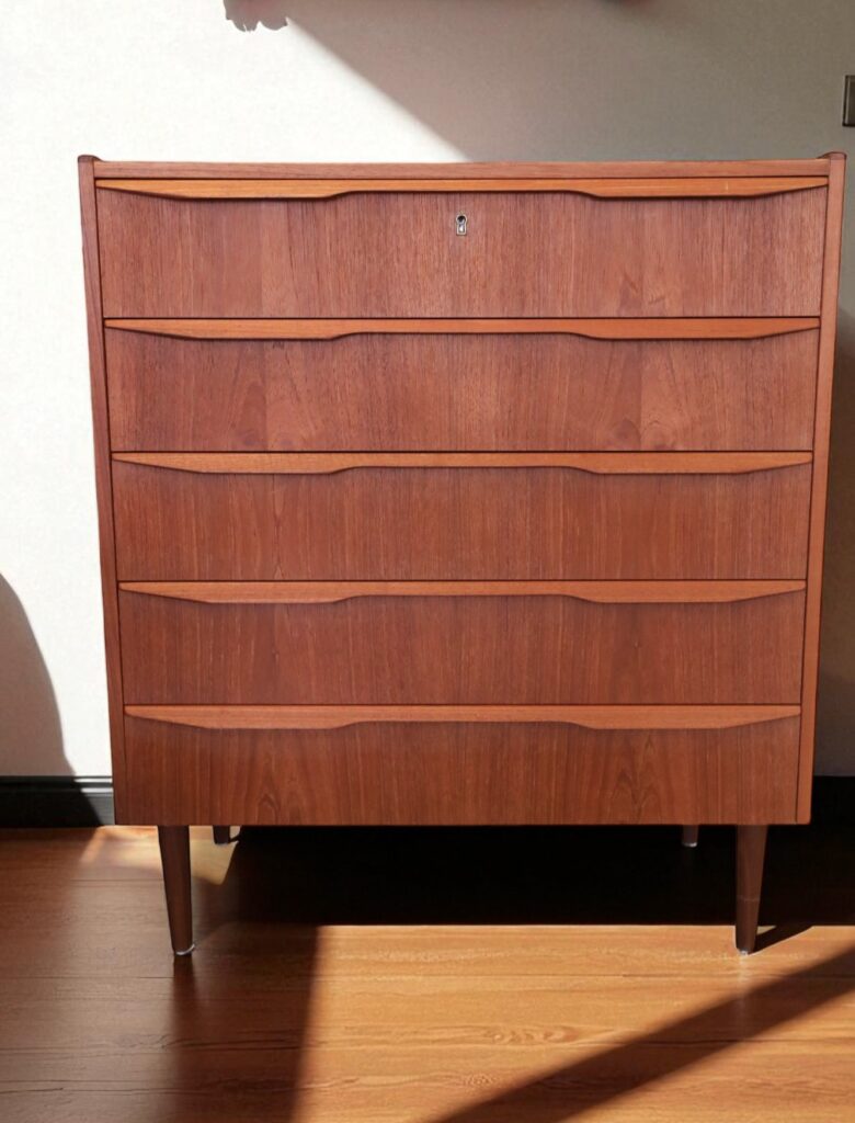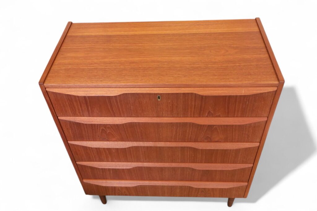 Dansk elegant byrå i teak med fem lådor. Byrån har perfekt storleken för att hänga en spegel ovanför i tex hallen eller sovrummet.