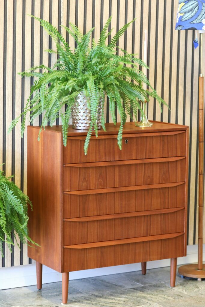 Dansk elegant byrå i teak med fem lådor.
