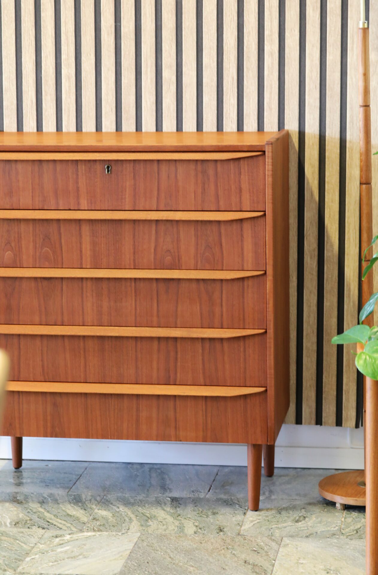 Dansk elegant byrå i teak med fem lådor.