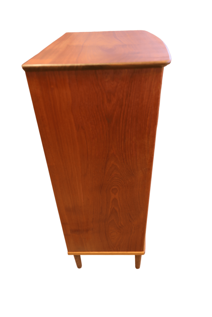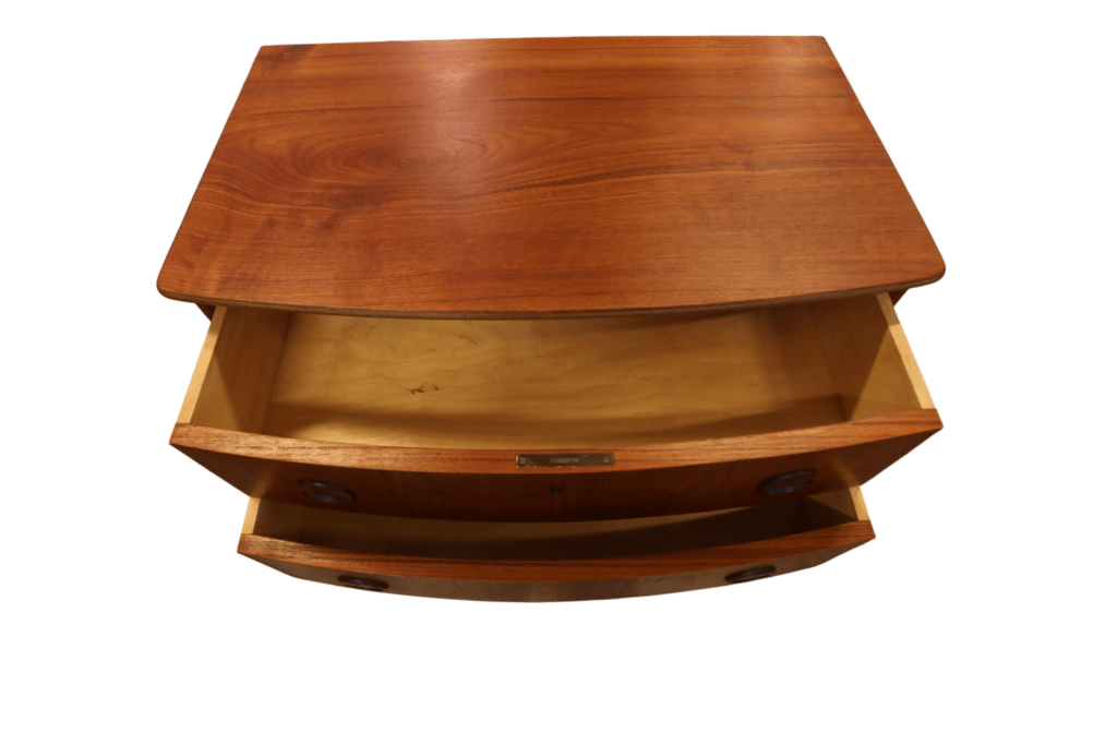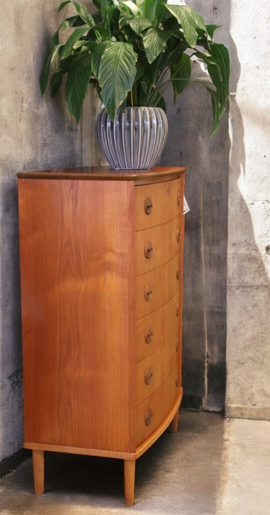 Byrån har välvd front och sex lådor där samtliga lådor har runda integrerade handtag som är integrerade. Alla lådor är stabila, fräscha samt helt i trä.