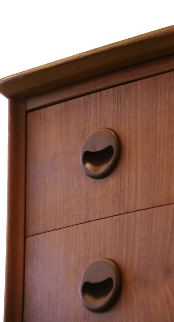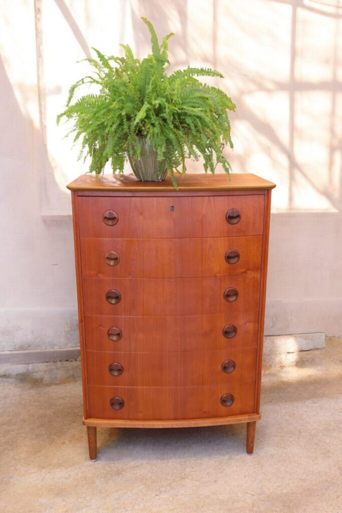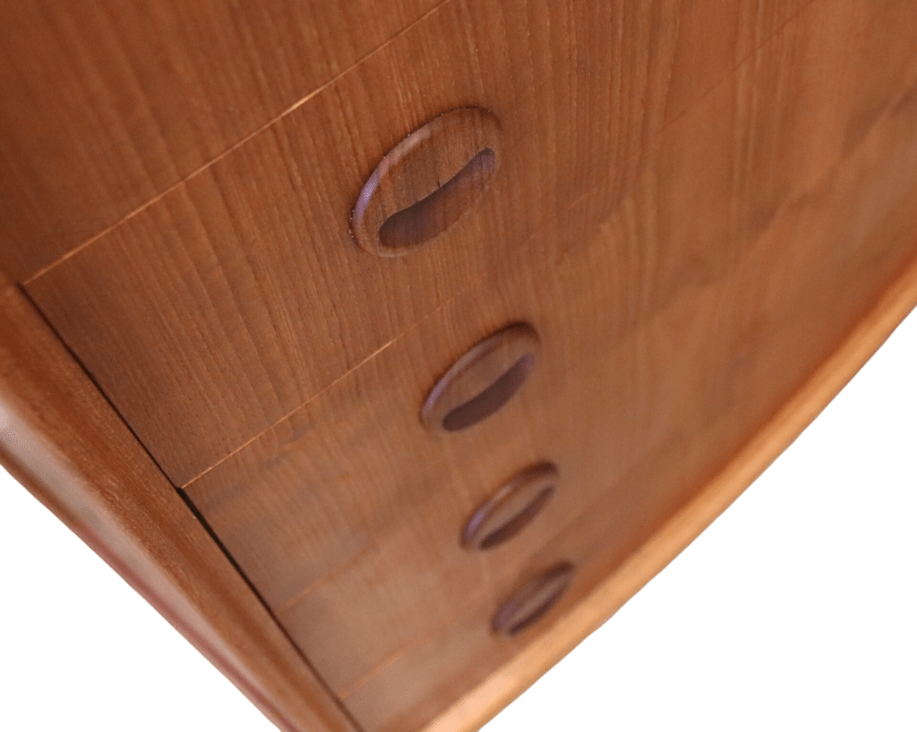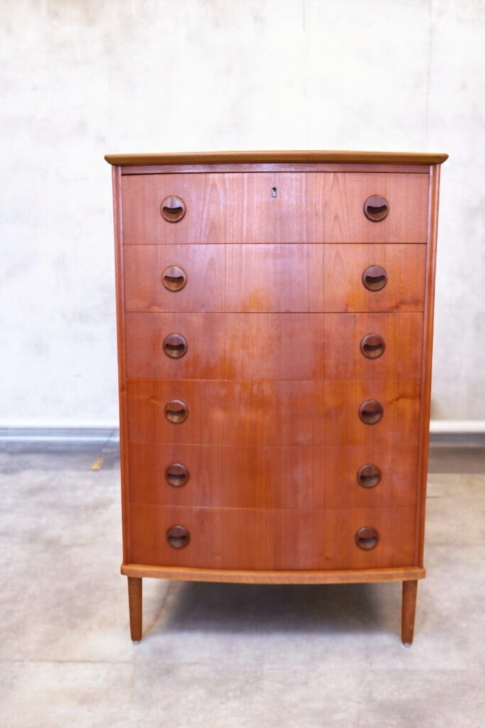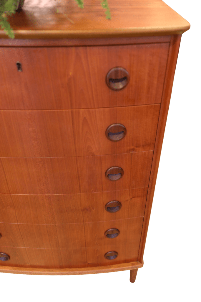 Otroligt välarbetat dansk byrå i teak med sex rymliga lådor. Byrån är uppbyggd som ett skåp med en rejäl och stabil sarg undertill. En perfekt möbel för att organisera dina tillhörigheter samtidigt som den tillför en tidlös charm till rummet.