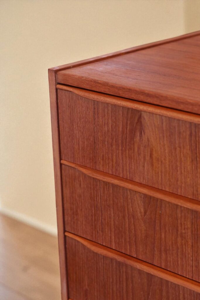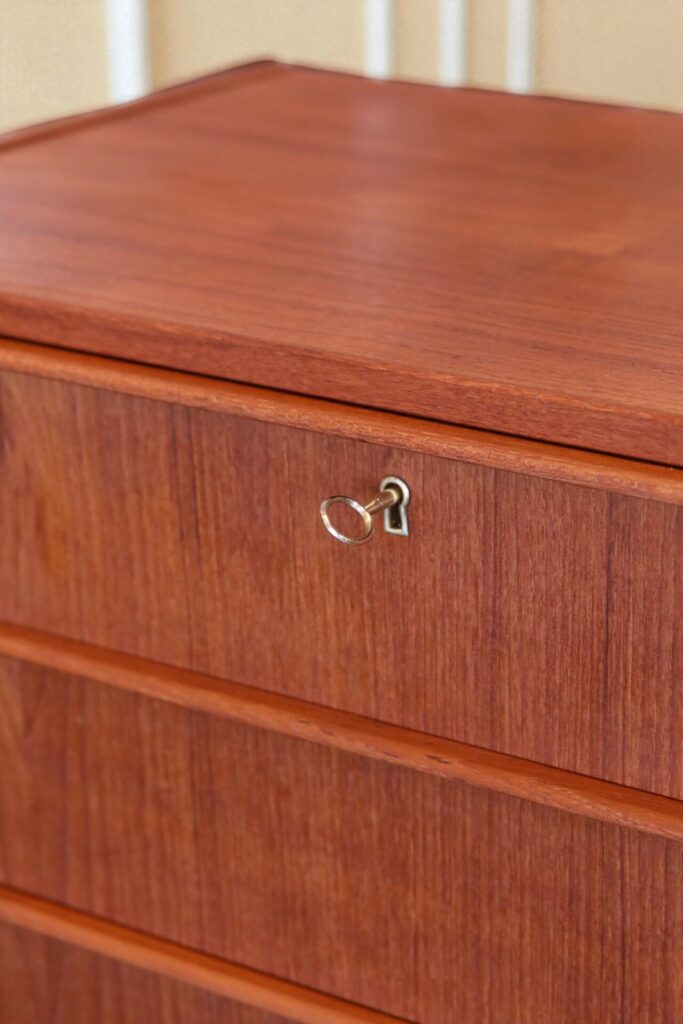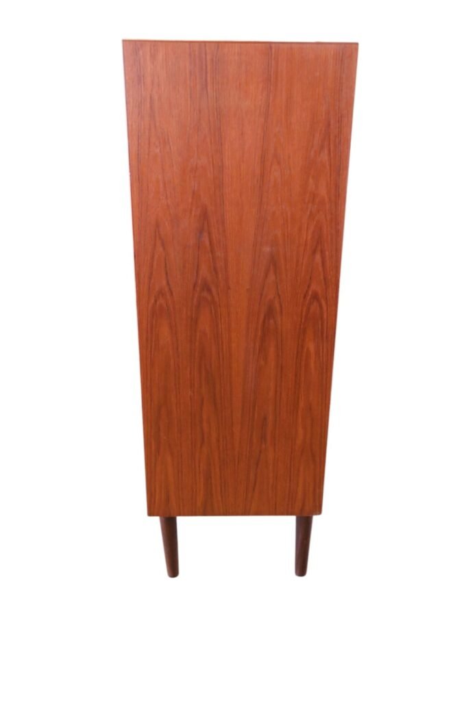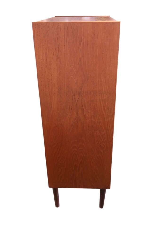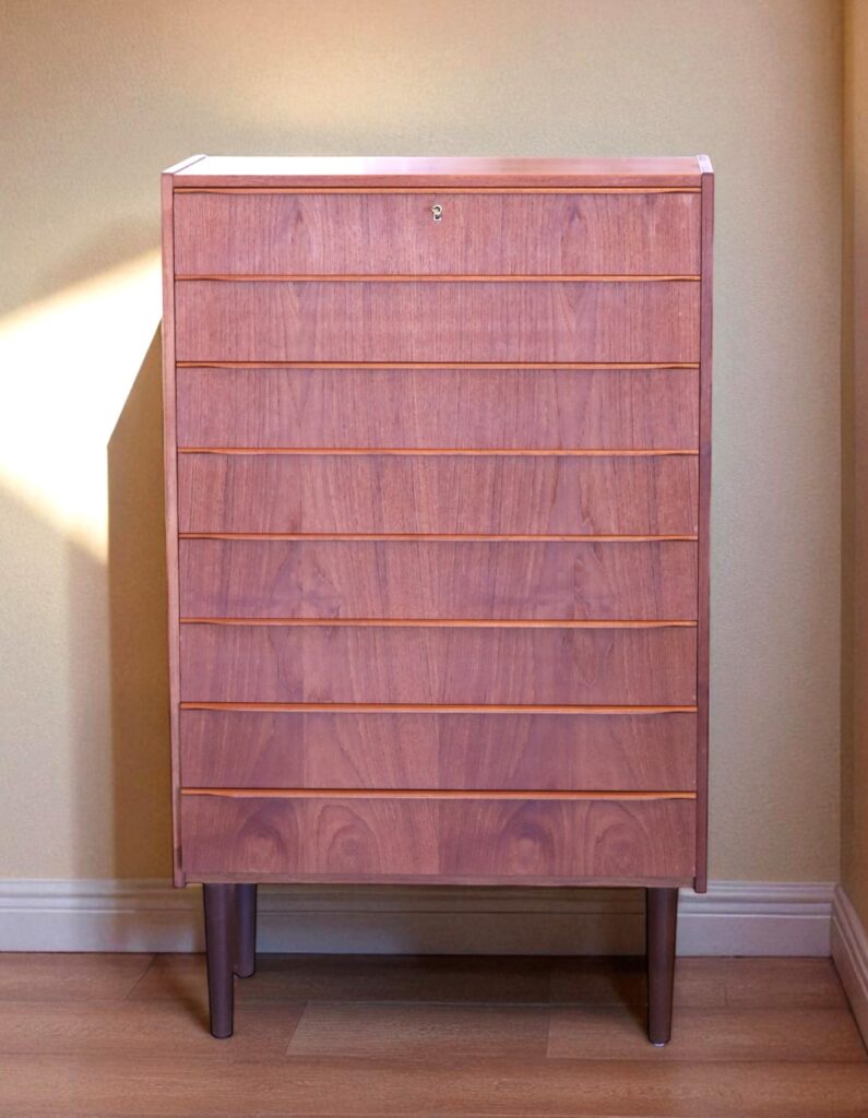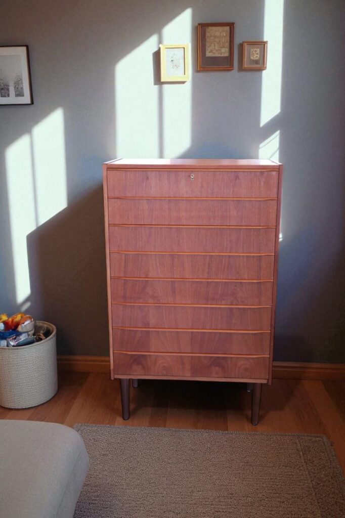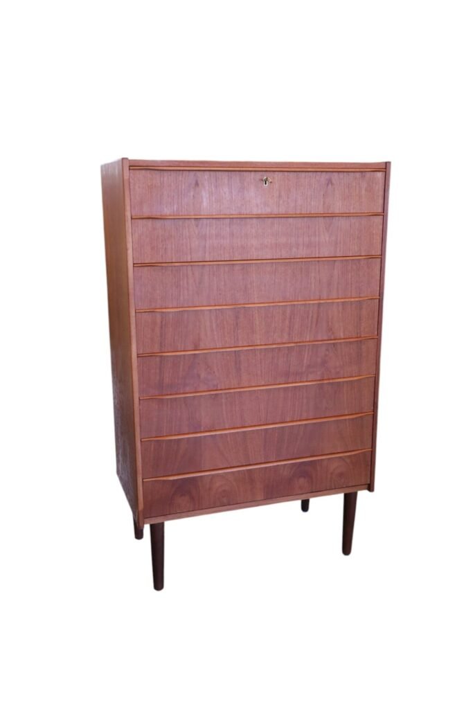 Dansk hög byrå i teak som står på runda avsmalnande ben i en mörkare ton med en elegant och tidlös känsla.