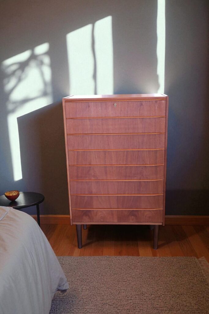 Byrån har åtta lådor och det är mycket ovanligt och gör det enkelt att sortera i byrån på ett effektivt sätt. Alla lådor är både stadiga och fräscha, med längsgående handtag som ger ett bra grepp och gör det lätt att dra ut dem.