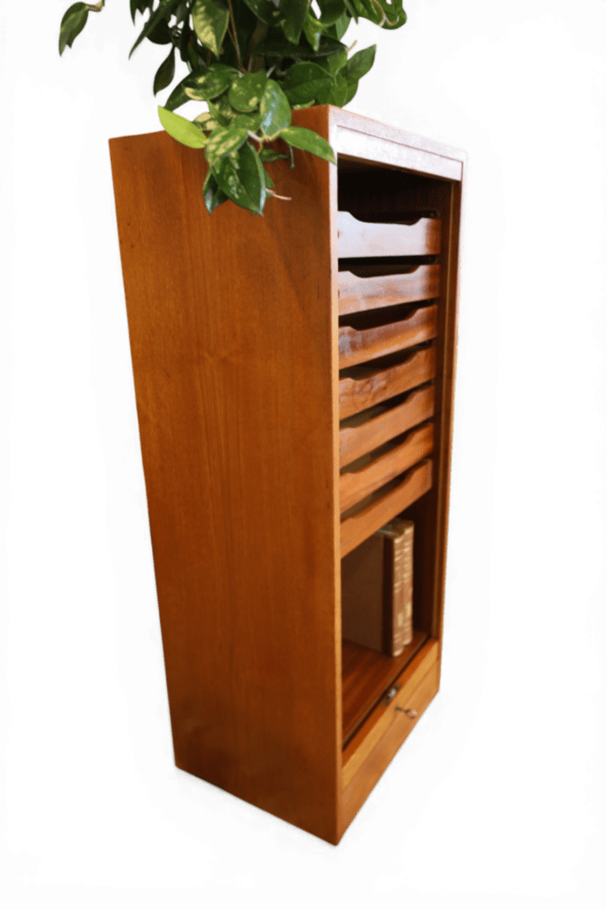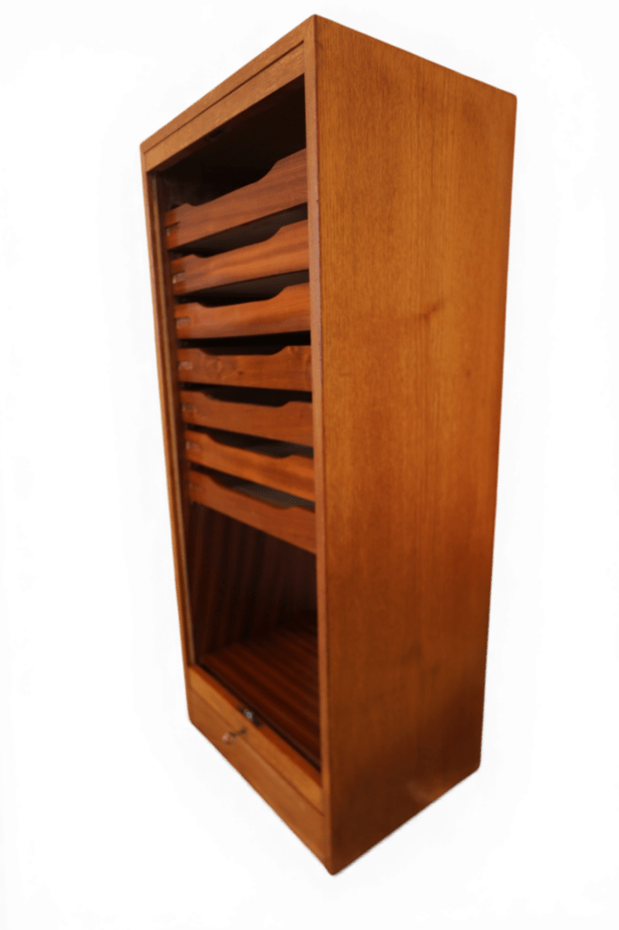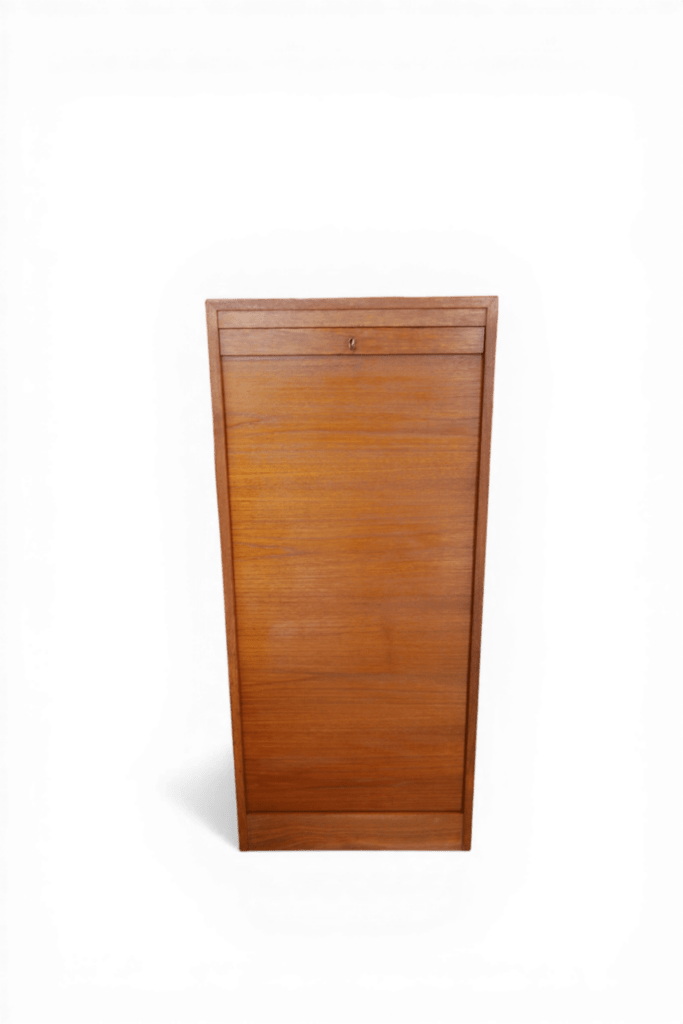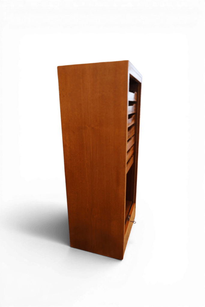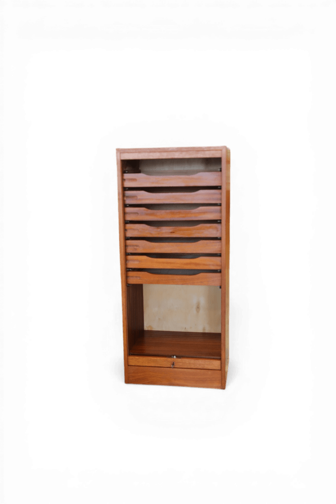 Danskt jalusiskåp i teak med flera praktiska lådor samt utrymme för pärmar, småplock och andra saker. Skåpet erbjuder mycket effektiv förvaring på liten golvyta och är samtidigt en stilren lösning för att hålla ordning och reda i din inredning!