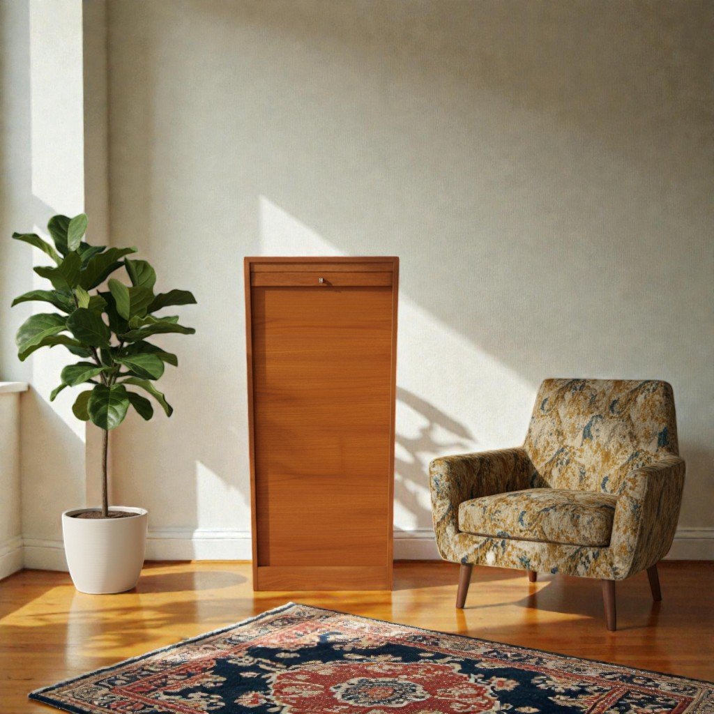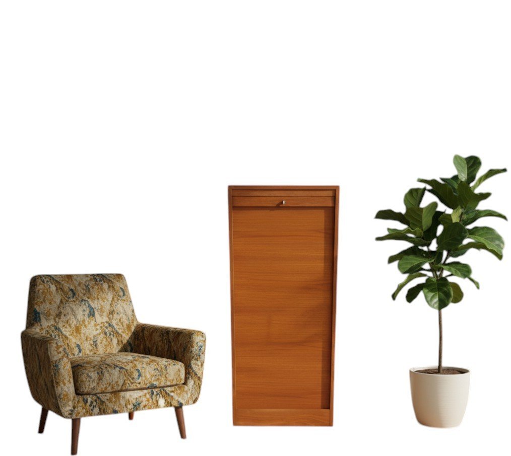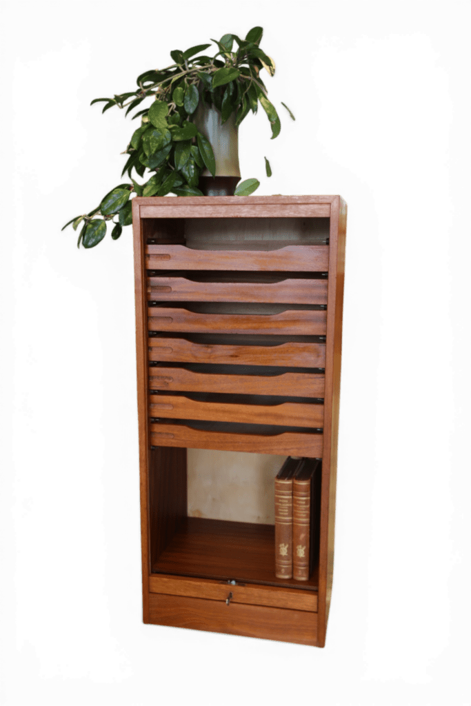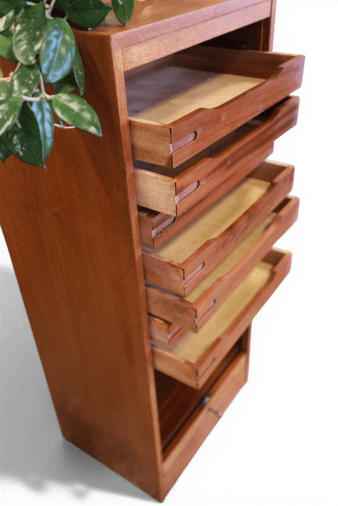 Danskt jalusiskåp i teak med flera praktiska lådor samt utrymme för pärmar, småplock och andra saker. Skåpet erbjuder mycket effektiv förvaring på liten golvyta och är samtidigt en stilren lösning för att hålla ordning och reda i din inredning!