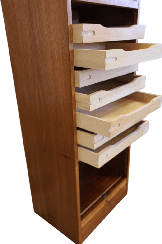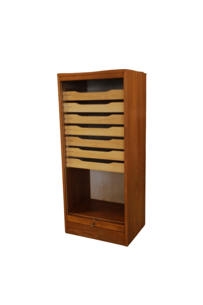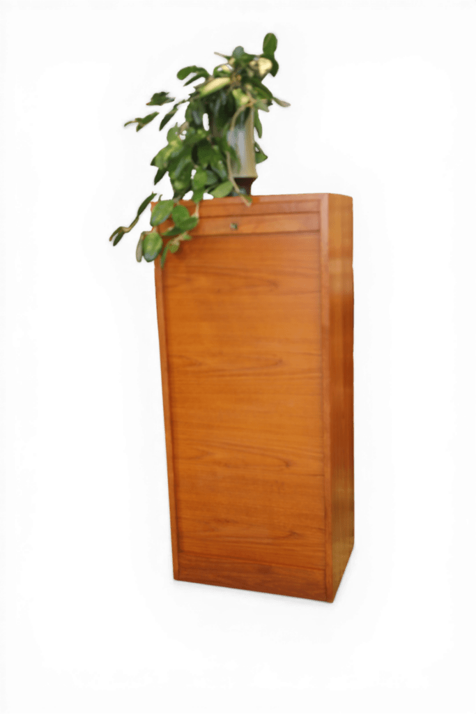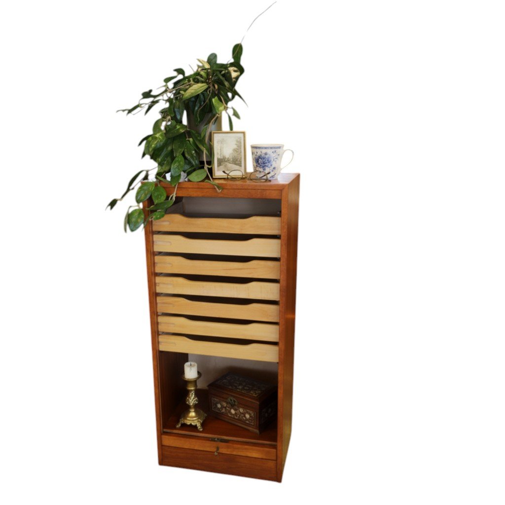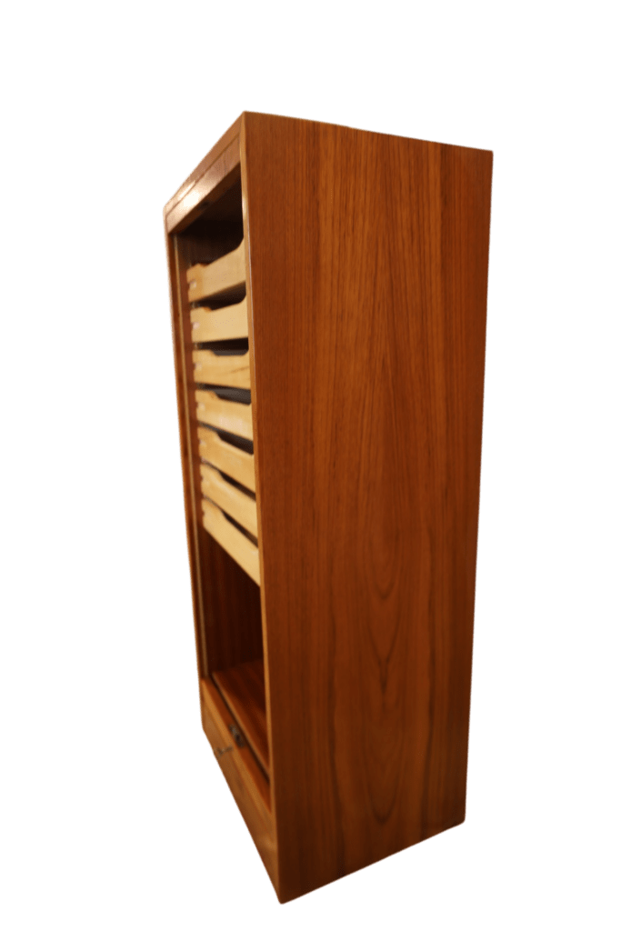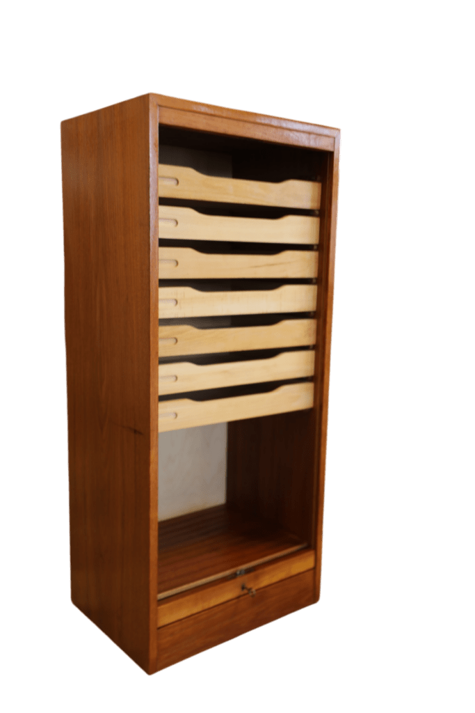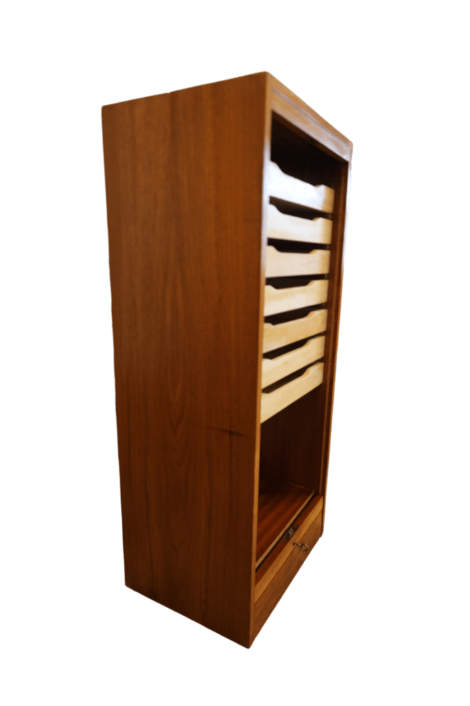 Danskt jalusiskåp i teak med flera praktiska lådor samt utrymme för pärmar, småplock och andra saker. Skåpet erbjuder mycket effektiv förvaring på liten golvyta och är samtidigt en stilren lösning för att hålla ordning och reda i din inredning!