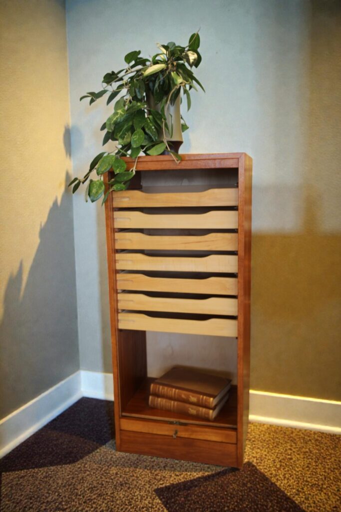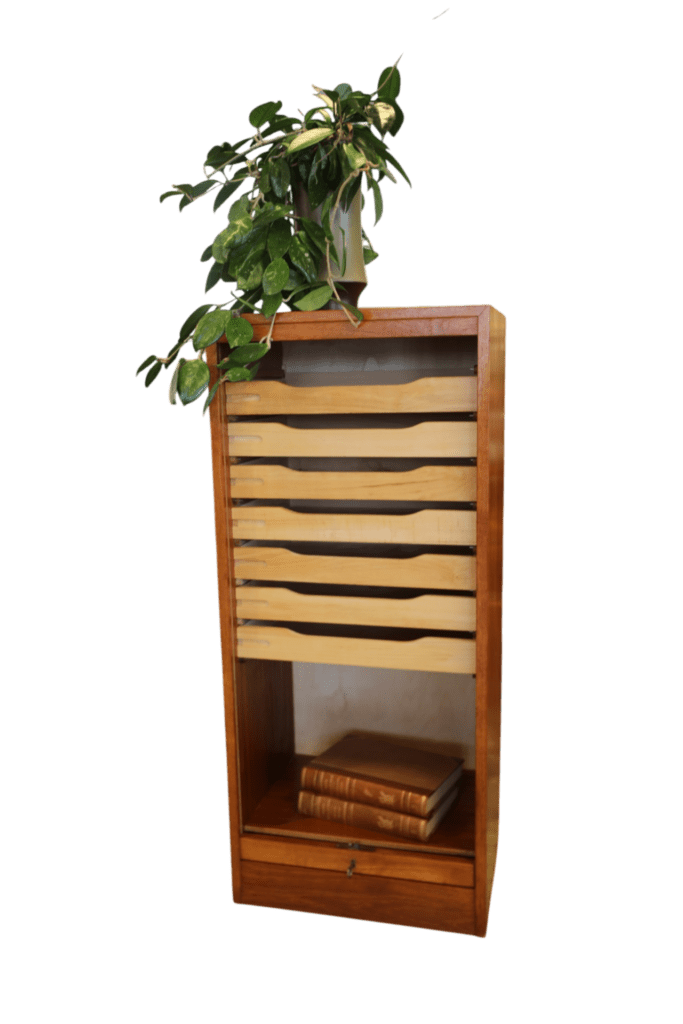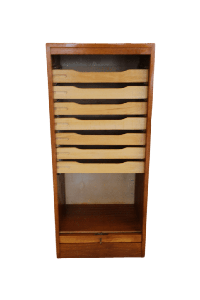 Bakom jalusiet finns sju lådor med fronter i tär och ram i trä. Alla lådor är fräscha och stadiga, och ger en bra möjlighet till förvaring. Lådorna erbjuder inte bara en bra plats för dina tillhörigheter, utan de ger också en snygg och organiserad känsla till rummet. Under lådorna finns det också en generös plats för pärmar samt andra viktiga dokument som du vill hålla i ordning och lätt tillgängliga.