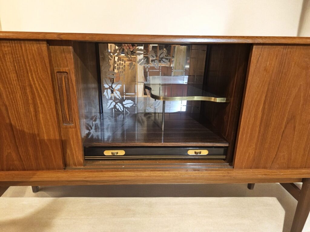 Möbeln är i vacker teak med tre praktiska skjutluckor som döljer bakomvarande inredning, bland annat ett fantastiskt barskåp med spegel och balkong.