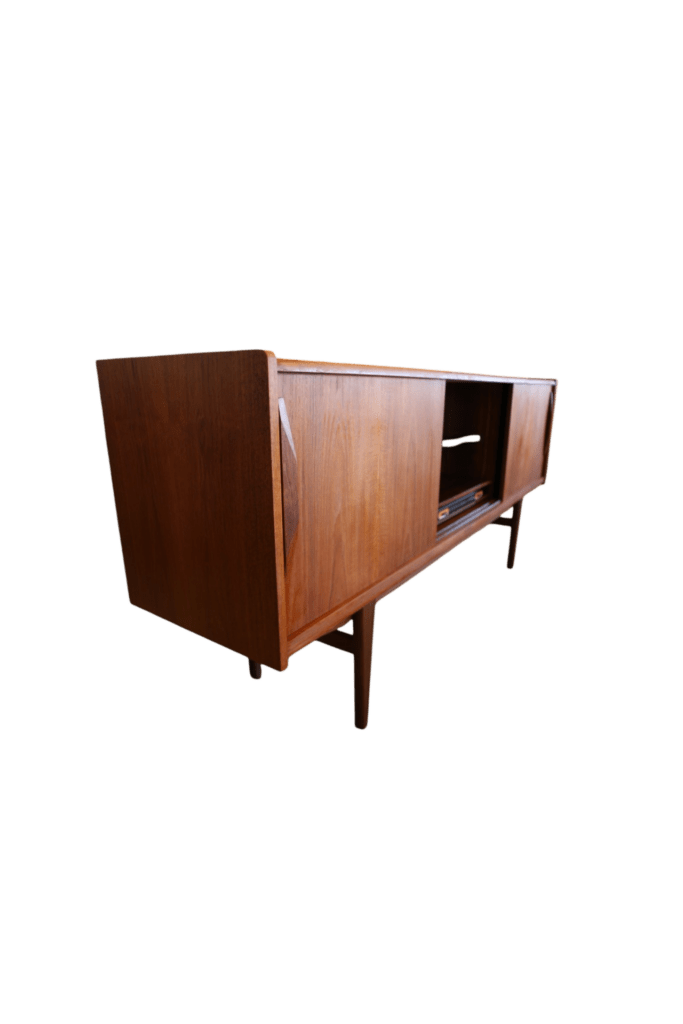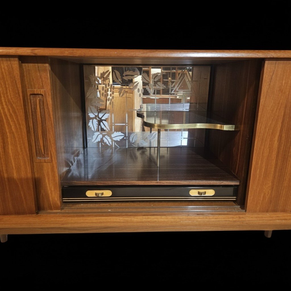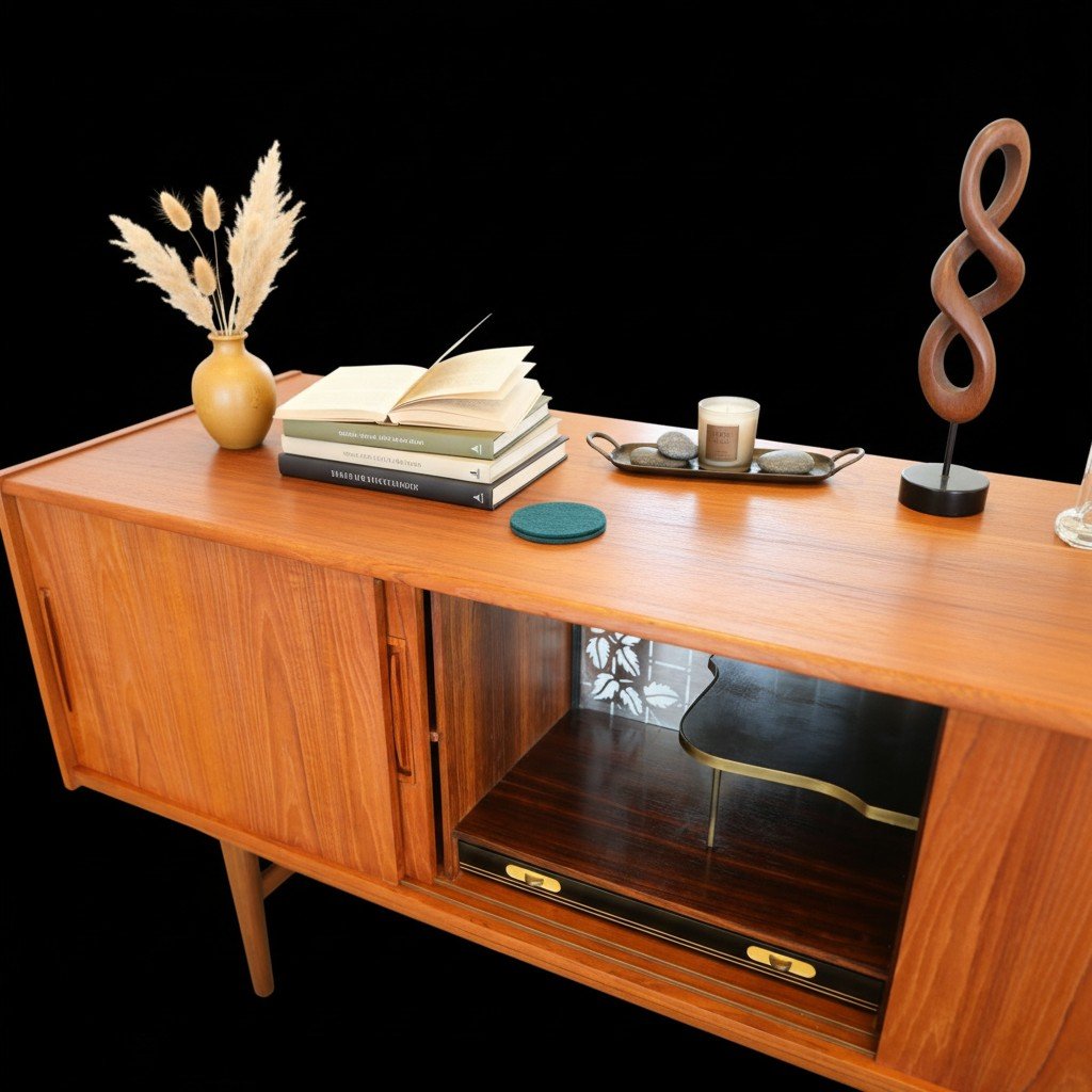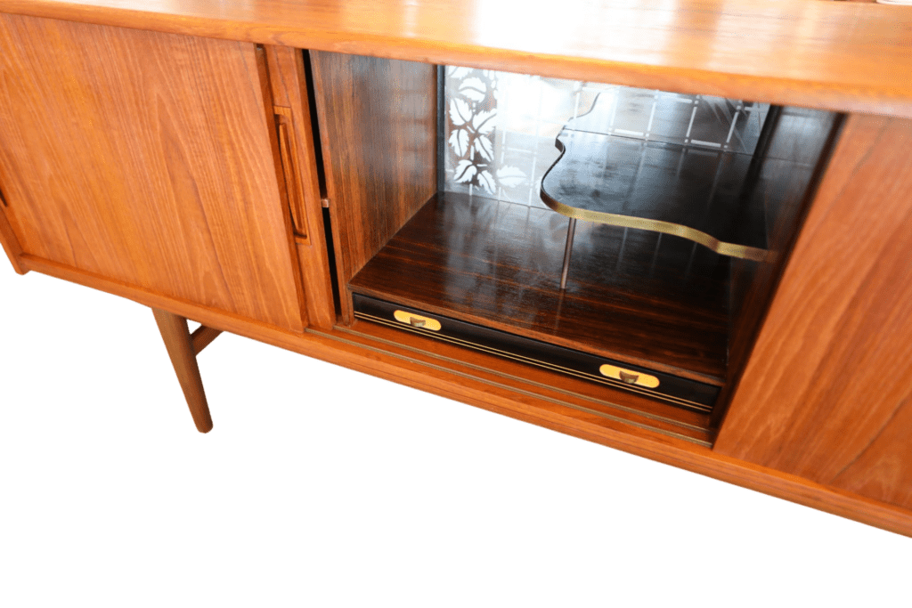 Möbeln är tillverkad i vacker teak och har tre smidiga skjutluckor som döljer en välplanerad insida. Här finns bland annat ett riktigt härligt barskåp med spegel och balkong – en detalj som både är funktionell och ger möbeln en extra karaktär.