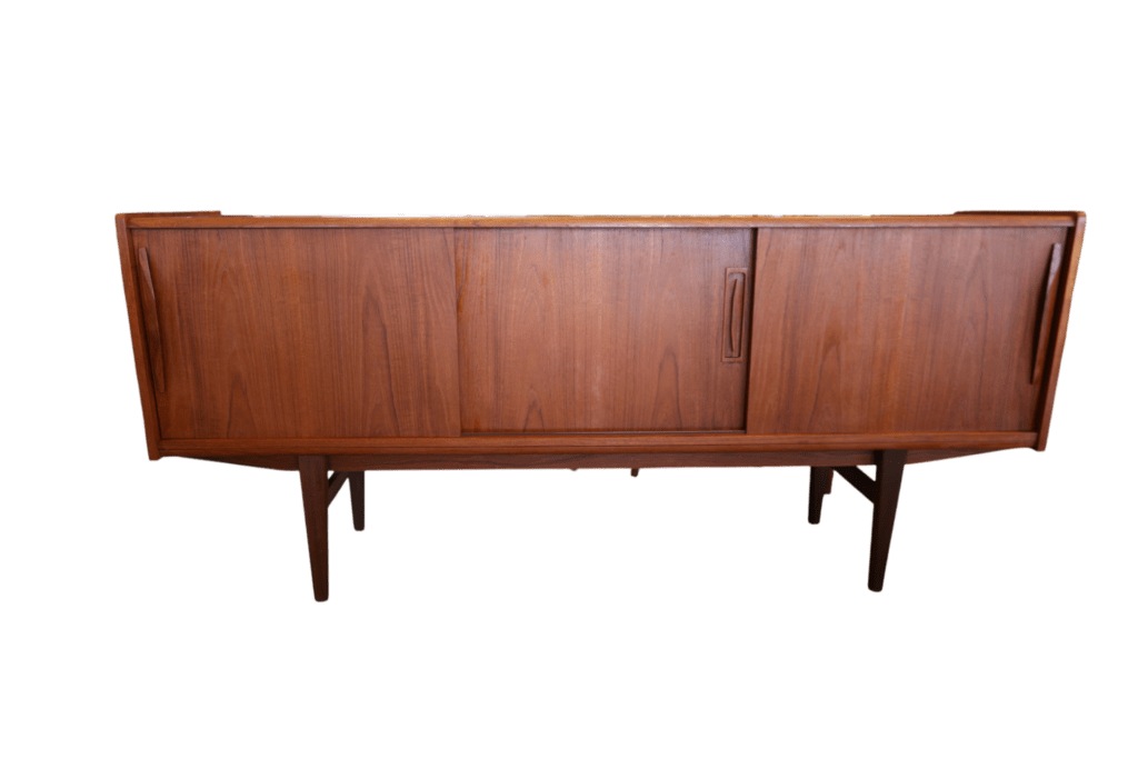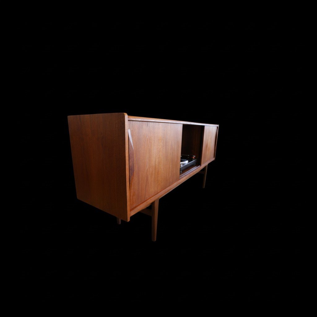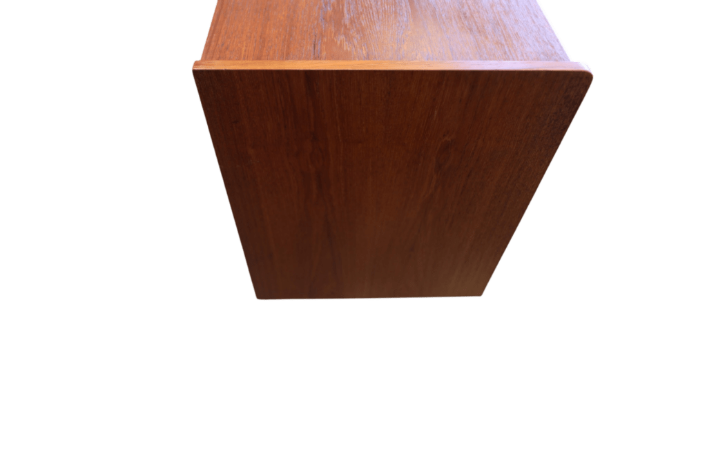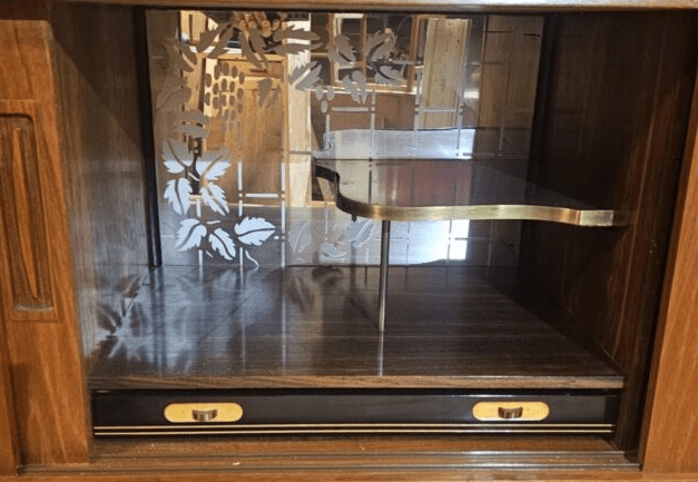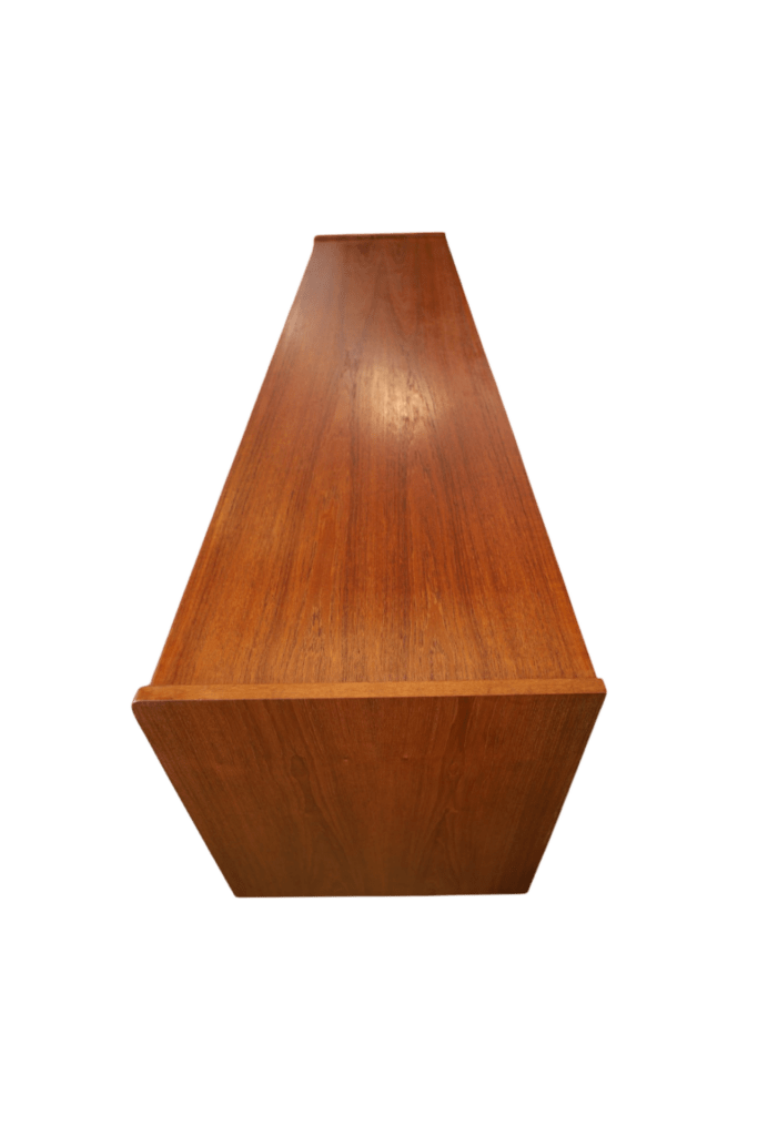 Möbeln är tillverkad i vacker teak och har tre smidiga skjutluckor som döljer en välplanerad insida. Här finns bland annat ett riktigt härligt barskåp med spegel och balkong – en detalj som både är funktionell och ger möbeln en extra karaktär.