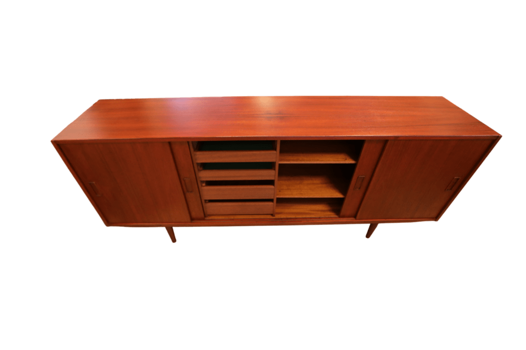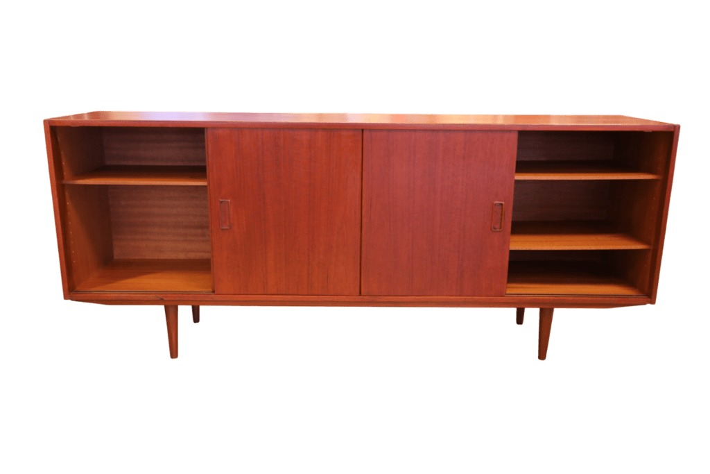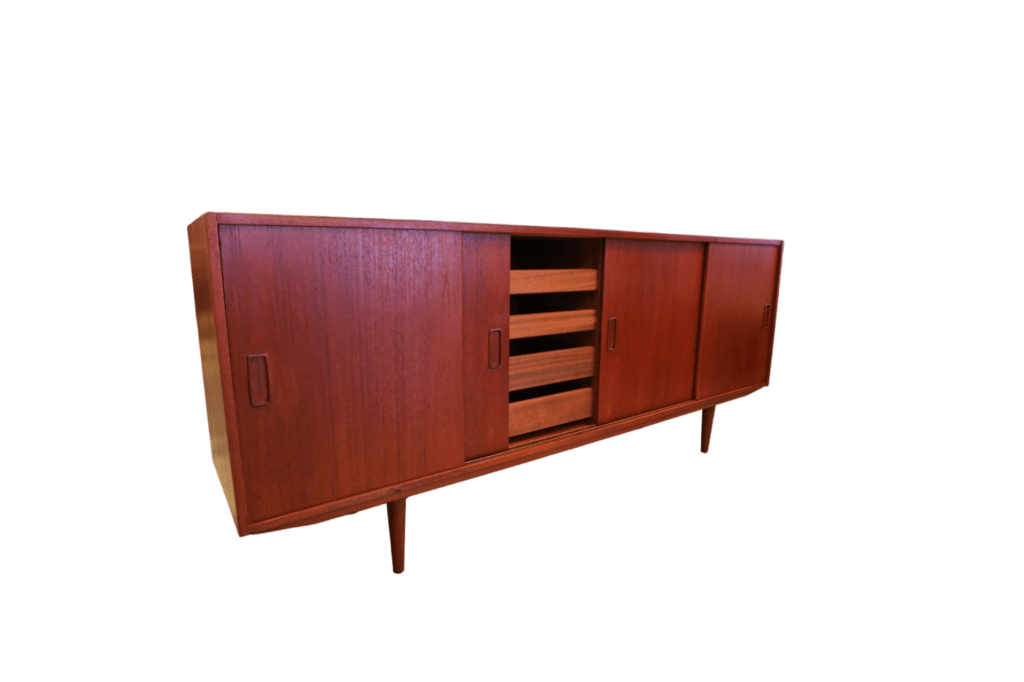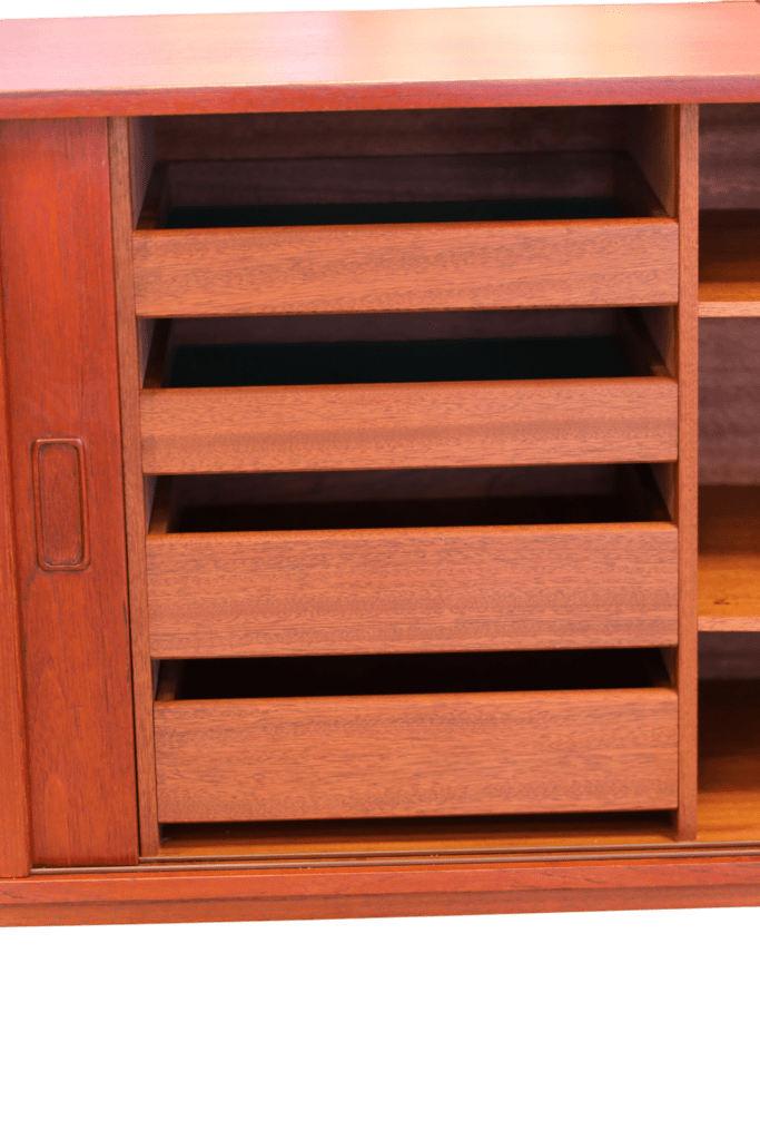 Möbeln är i vacker teak med fyra praktiska skjutluckor. Smäckra, integrerade handtag pryder skjutluckorna och ger en stilren och modern look. Skjutluckorna gör det enkelt och smidigt att få tillgång till innehållet i skåpet, även när det finns begränsat med utrymme runt om.