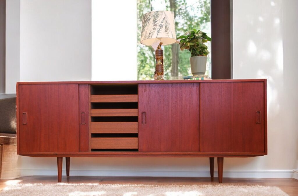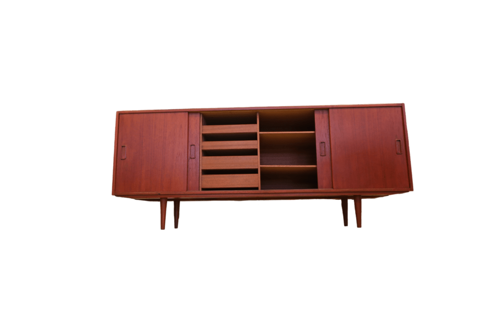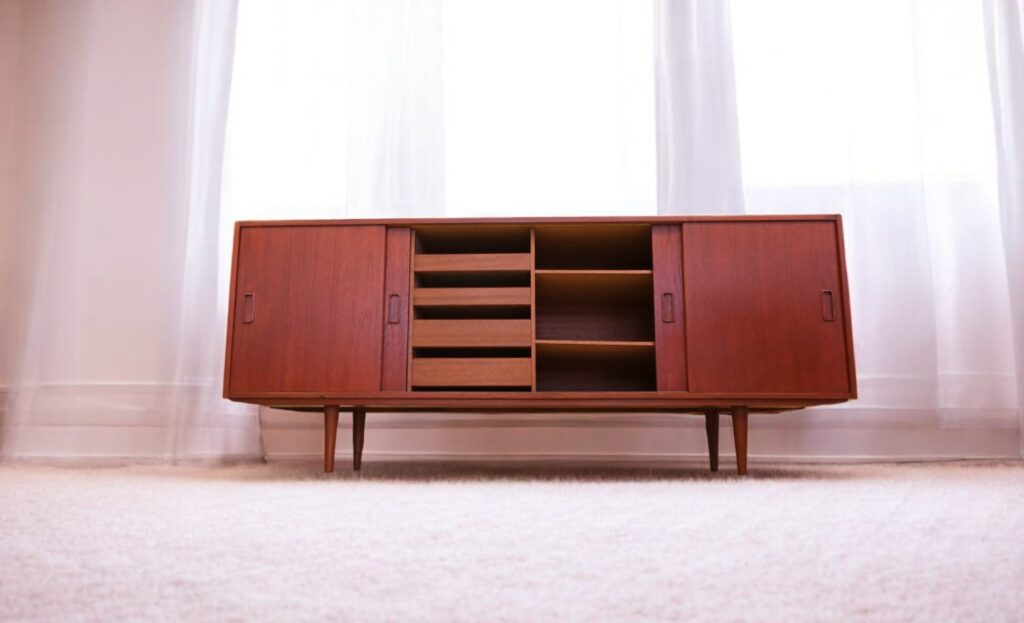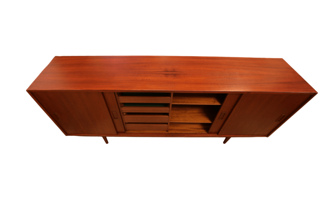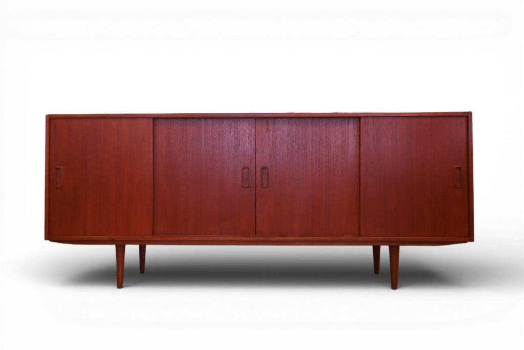 Möbeln är i vacker teak med fyra praktiska skjutluckor. Smäckra, integrerade handtag pryder skjutluckorna och ger en stilren och modern look. Skjutluckorna gör det enkelt och smidigt att få tillgång till innehållet i skåpet, även när det finns begränsat med utrymme runt om.