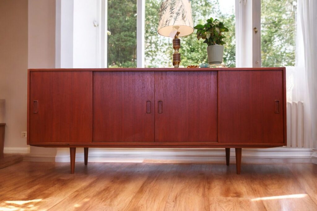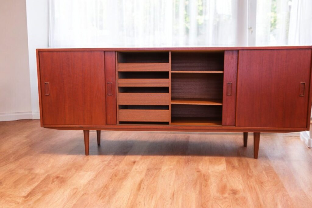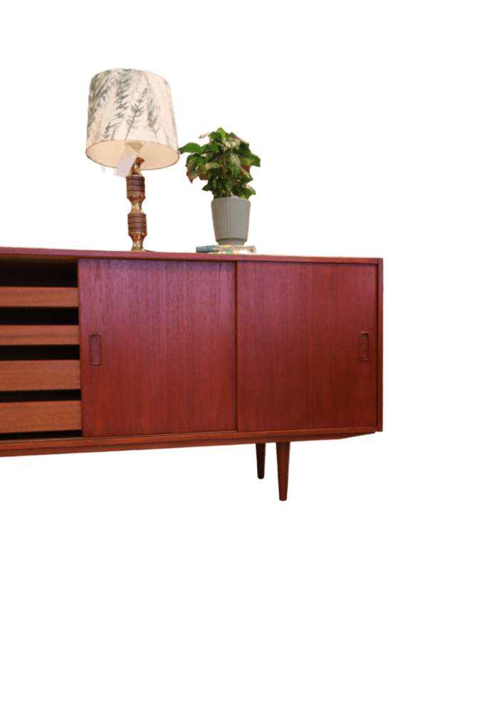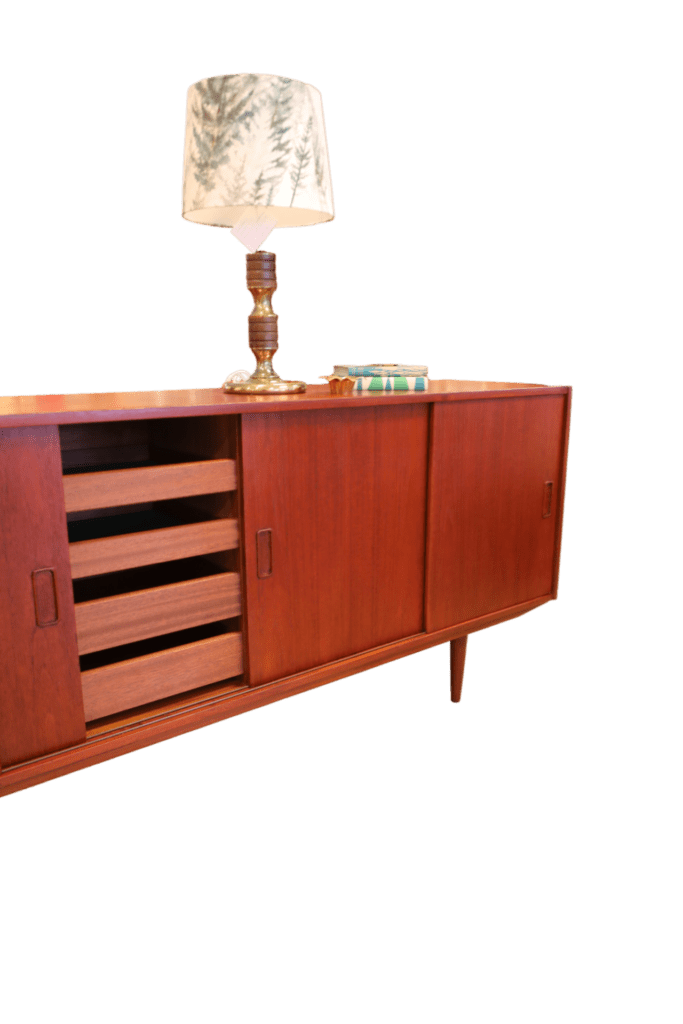 Ytorna är i teak som har en mörk och gyllene ton som verkligen framhäver dess naturliga skönhet. Möbeln har alla ytor omfanerade med den högkvalitativa teak som användes vid tillverkningen av möbler förr i tiden och som verkligen har en unik karaktär. Nuförtiden är det endast den odlade teak som används i modern tillverkning, samma typ av trä som ofta ses i nytillverkade trädgårdsmöbler. Sideboardet går även att möblera med möbler i palisander då den har en mycket djup och härlig ton!