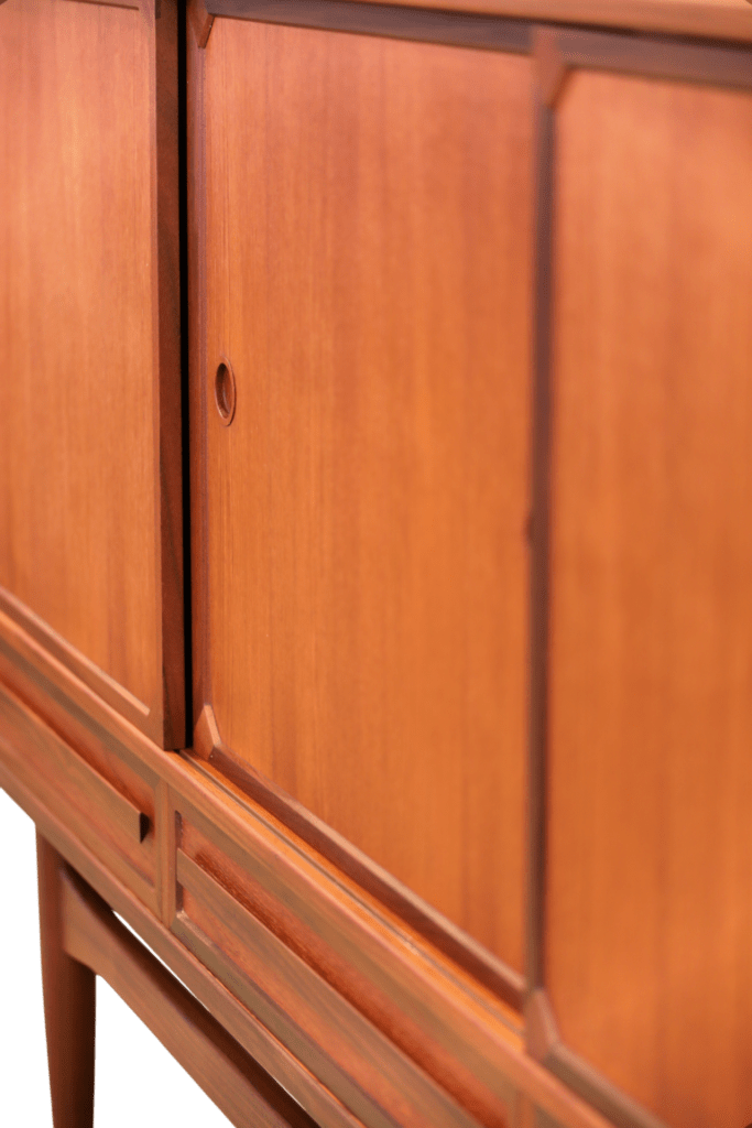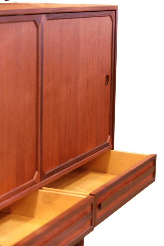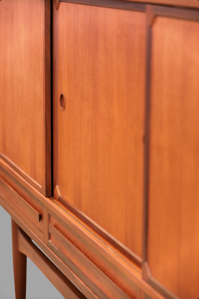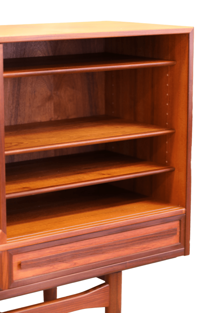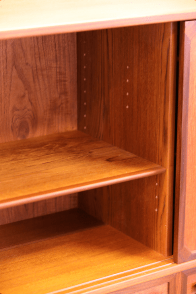 Bakom den mittre och den högra skjutluckan finns hyllplan, alla flytt- och urtagbara och hela skåpets inredningen är påkostad i teak.