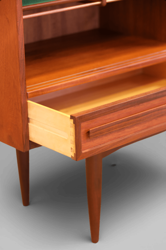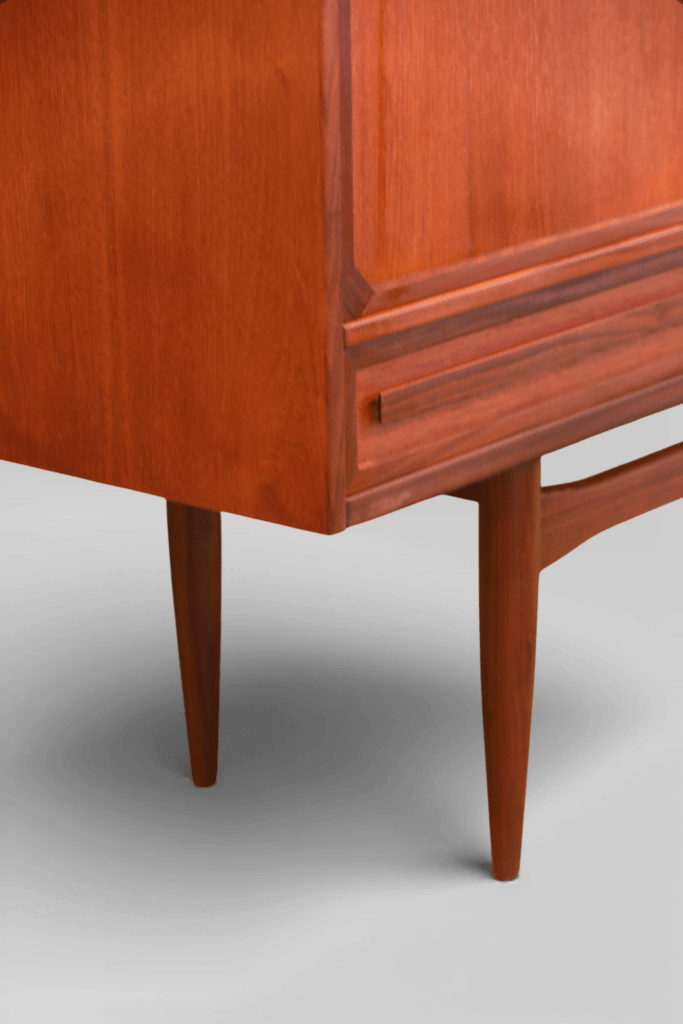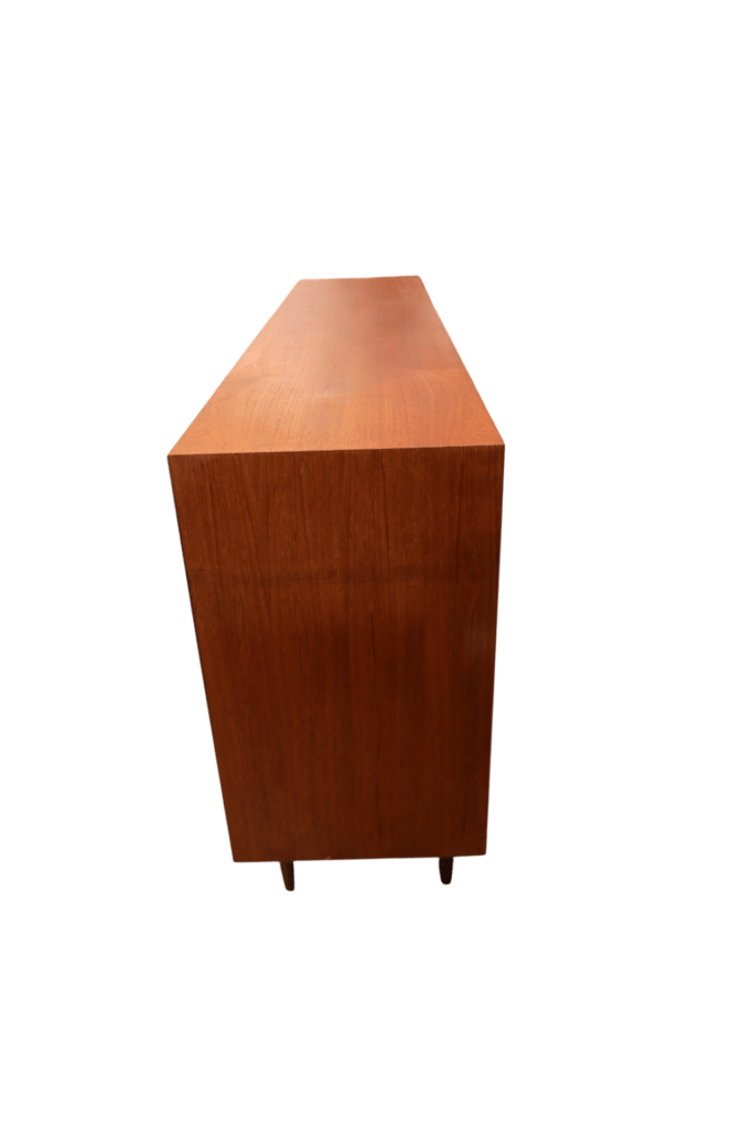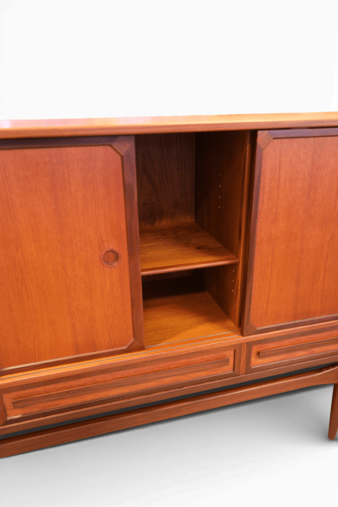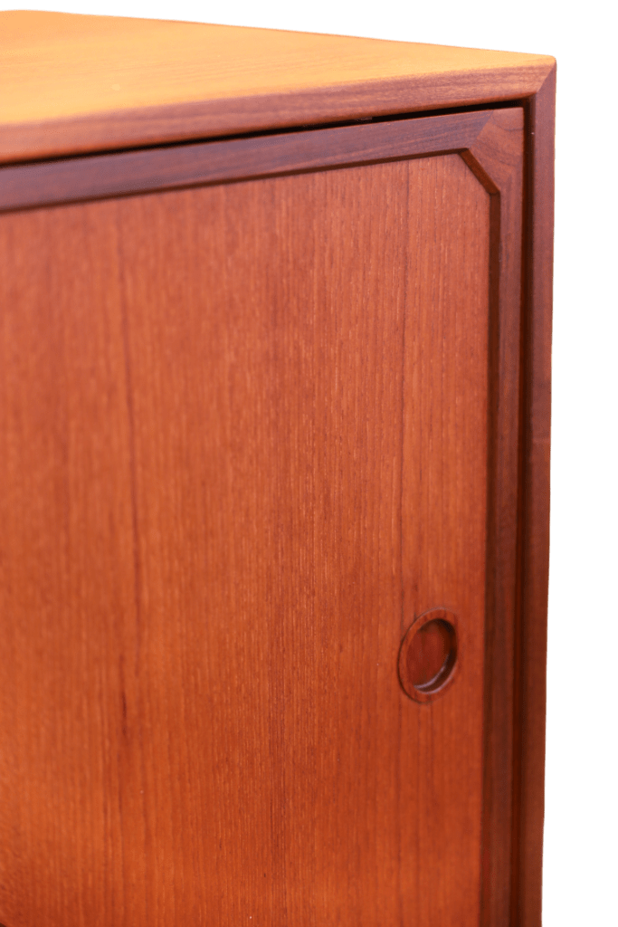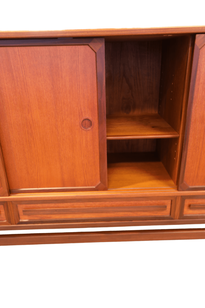 Bakom den mittre och den högra skjutluckan finns hyllplan, alla flytt- och urtagbara och hela skåpets inredningen är påkostad i teak.