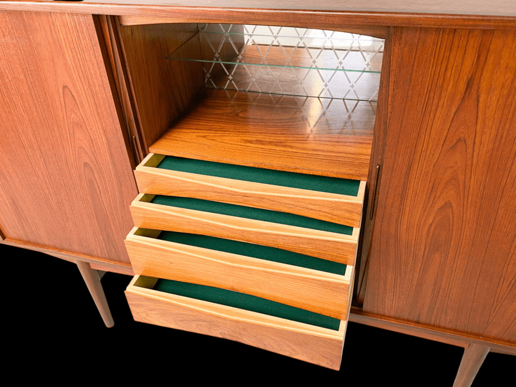 Samtaget ett skåp som erbjuder ypperliga förvaringsmöjligheter, perfekt för att hålla ordning och reda i ditt hem. Dock har formgivaren inte nöjt sig med att bara skapa en funktionell möbel, utan har även lagt ner stor omtanke och kreativitet för att göra ett extremt vackert skåp av mycket hög kvalitet, både exteriört och interiört. Designen är noggrant genomtänkt och varje detalj är utförd med precision. Skåpet har en enorm Wow-faktor; se bara hur de elegant arbetade luckorna och det underbara barskåpet är! Denna möbel är verkligen en konstverk och ett statement i varje rum. ❤️