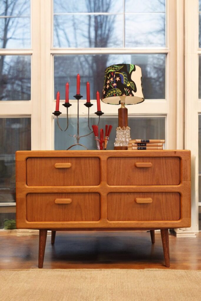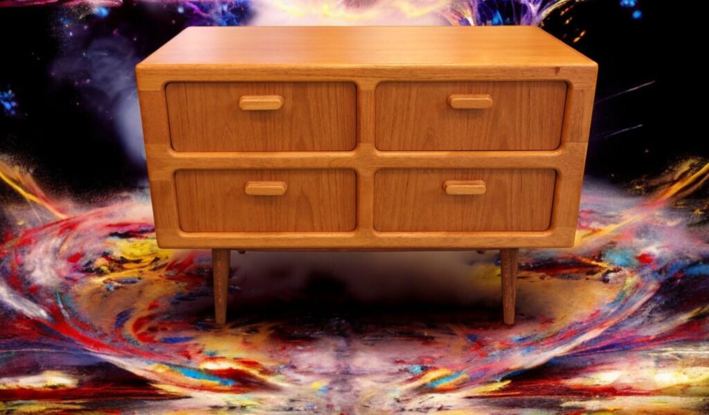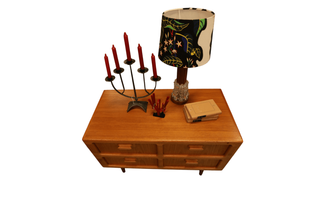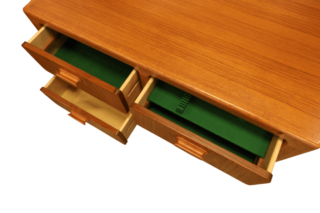 Möbeln har en fyra lådor som är utrustade med ovala handtag i teak, vilket ger den en klassisk och stilren look. De två översta ådorna är klädda med grön textil.