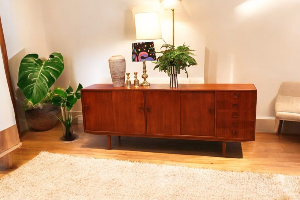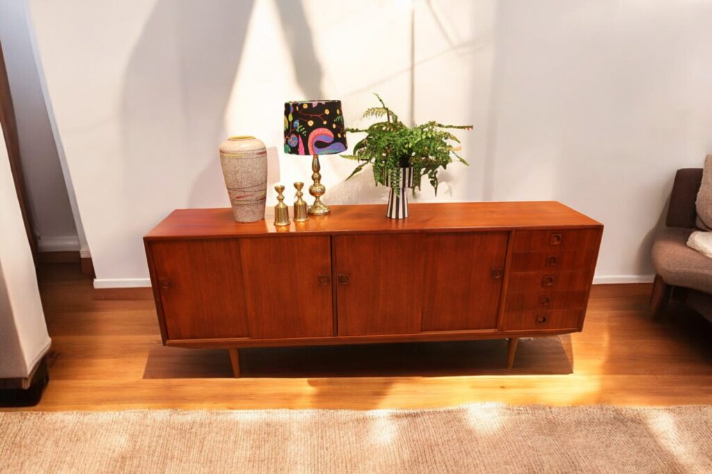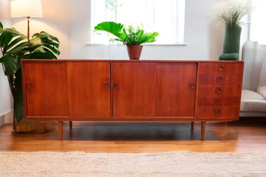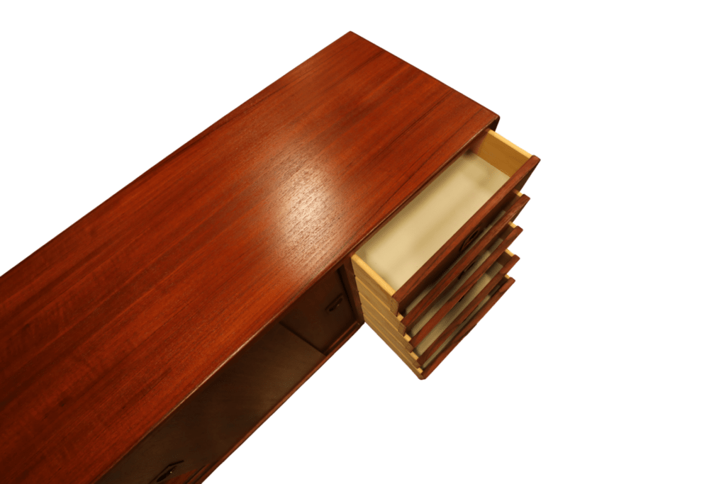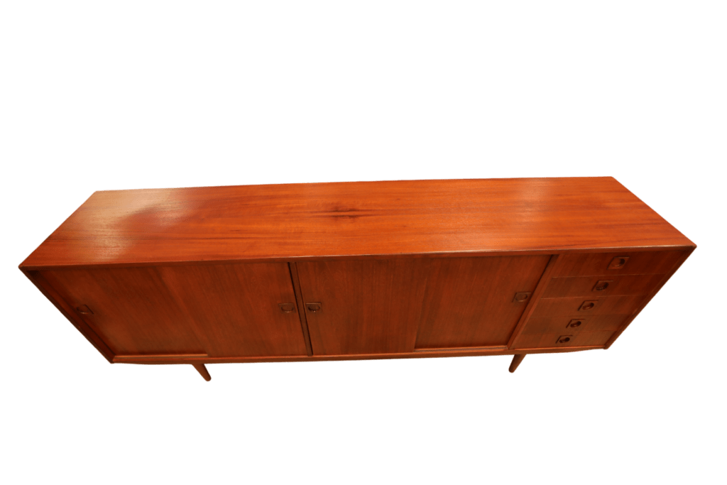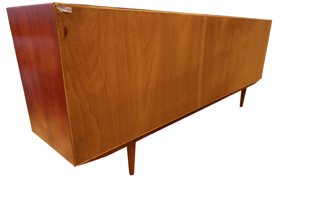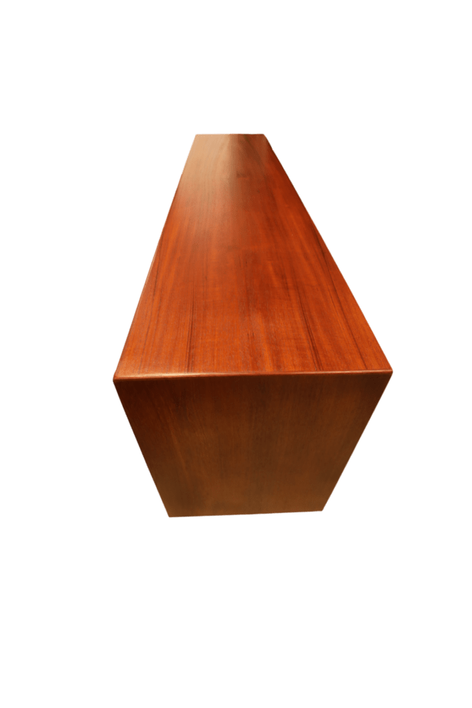 Ytorna är i teak som har en mörk och gyllene ton som verkligen framhäver dess naturliga skönhet. Möbeln har alla ytor omfanerade med den högkvalitativa teak som användes vid tillverkningen av möbler förr i tiden och som verkligen har en unik karaktär. Nuförtiden är det endast den odlade teak som används i modern tillverkning, samma typ av trä som ofta ses i nytillverkade trädgårdsmöbler. Sideboardet går även att möblera med möbler i palisander då den har en mycket djup och härlig ton!