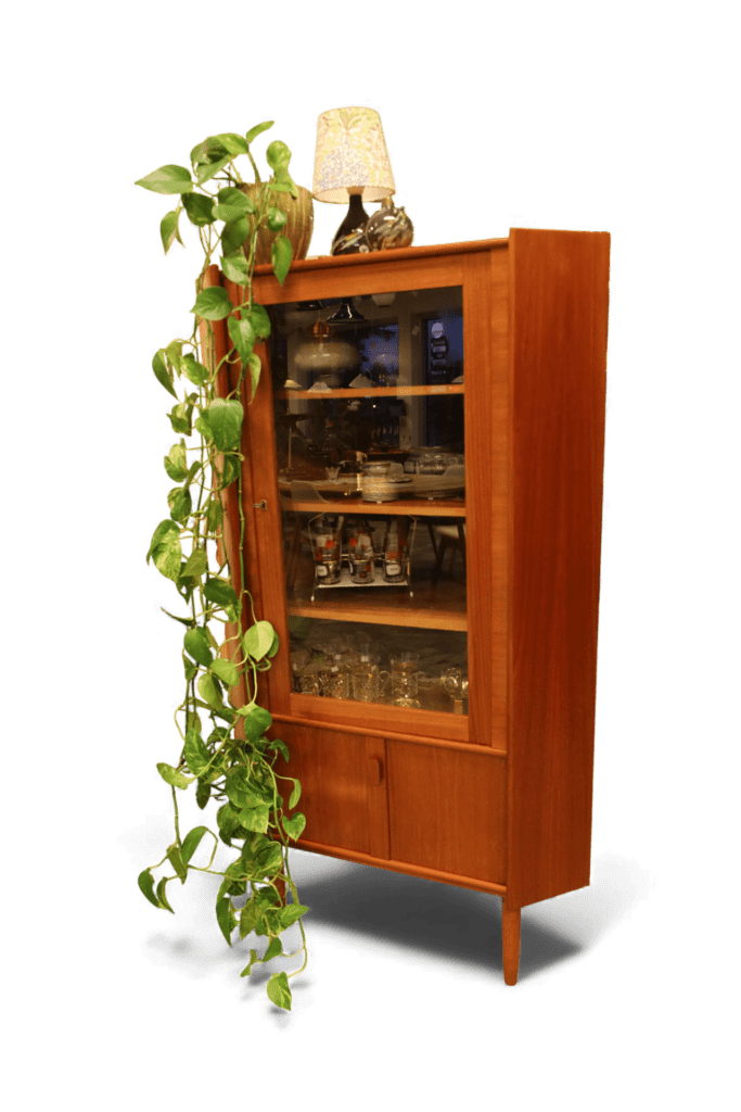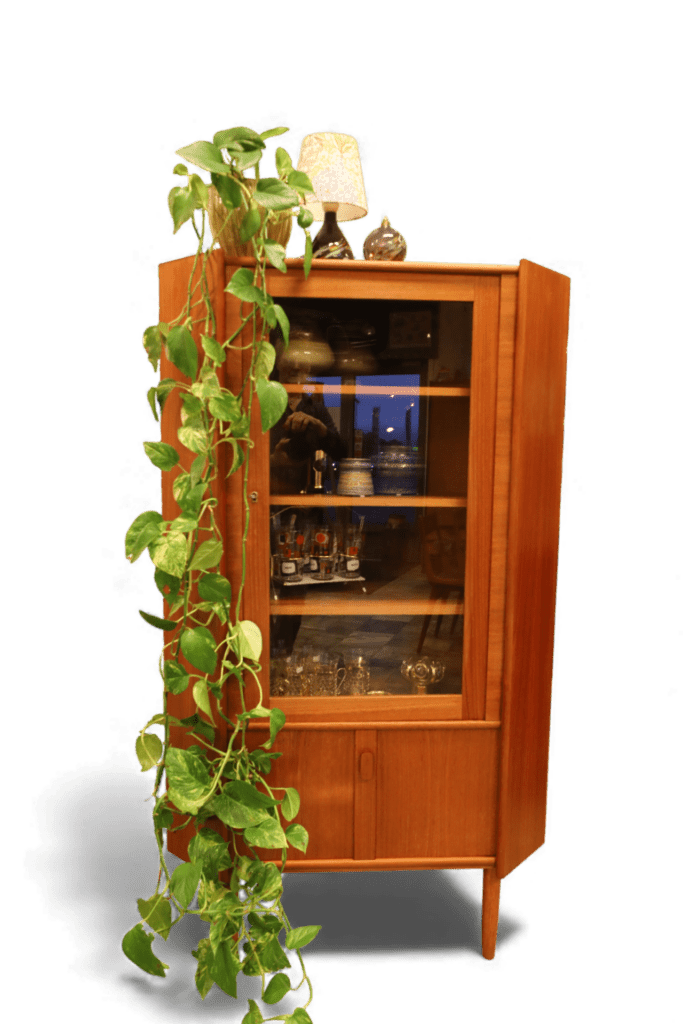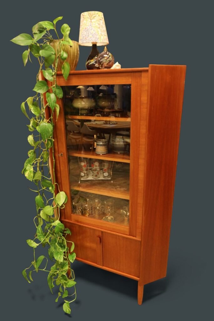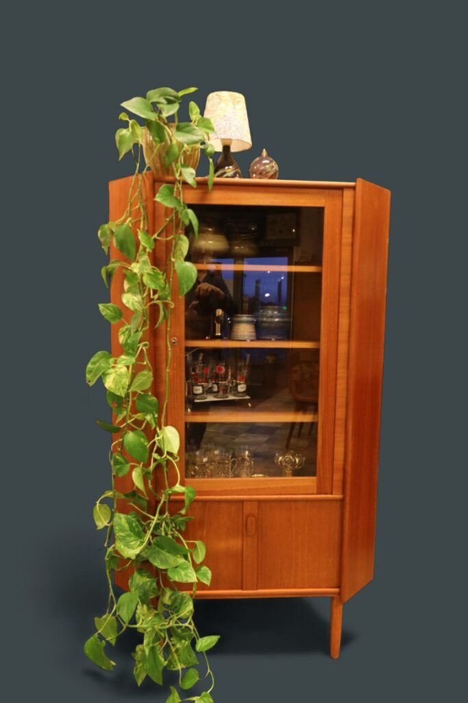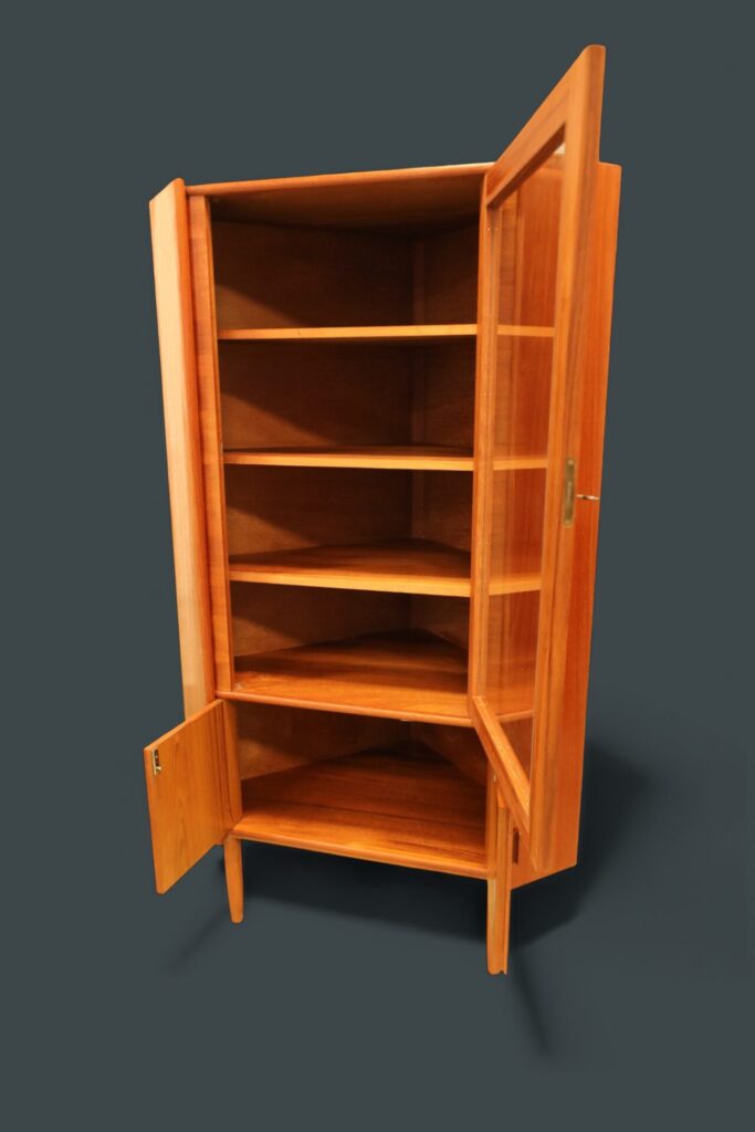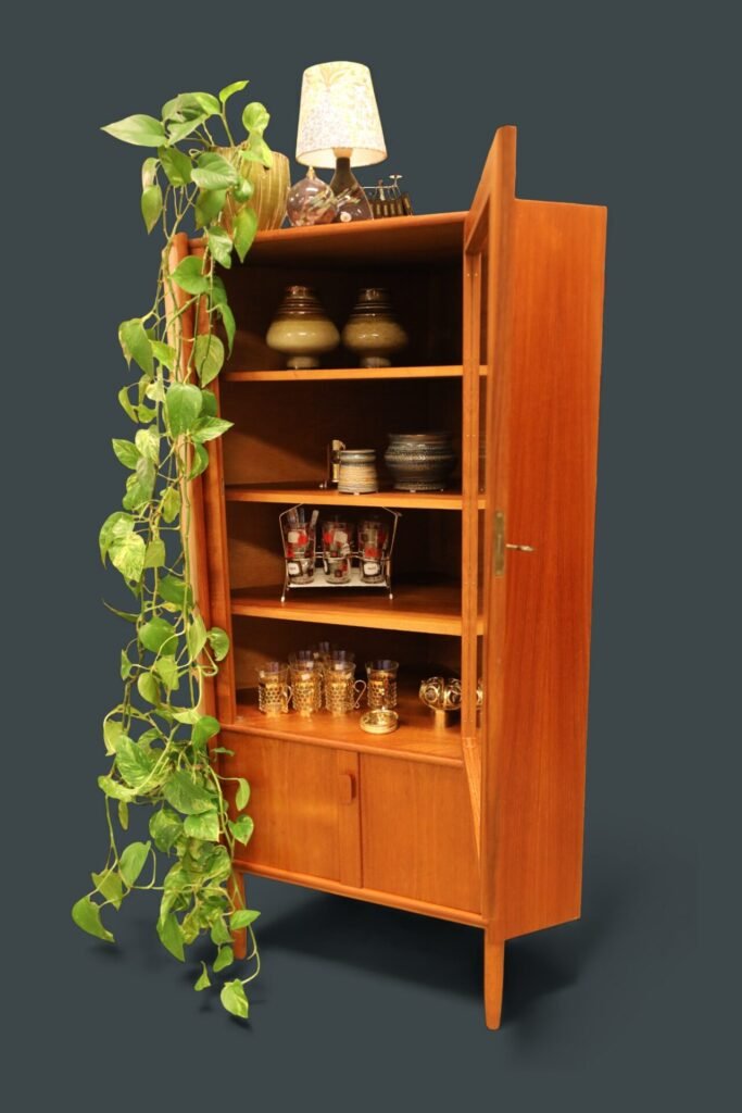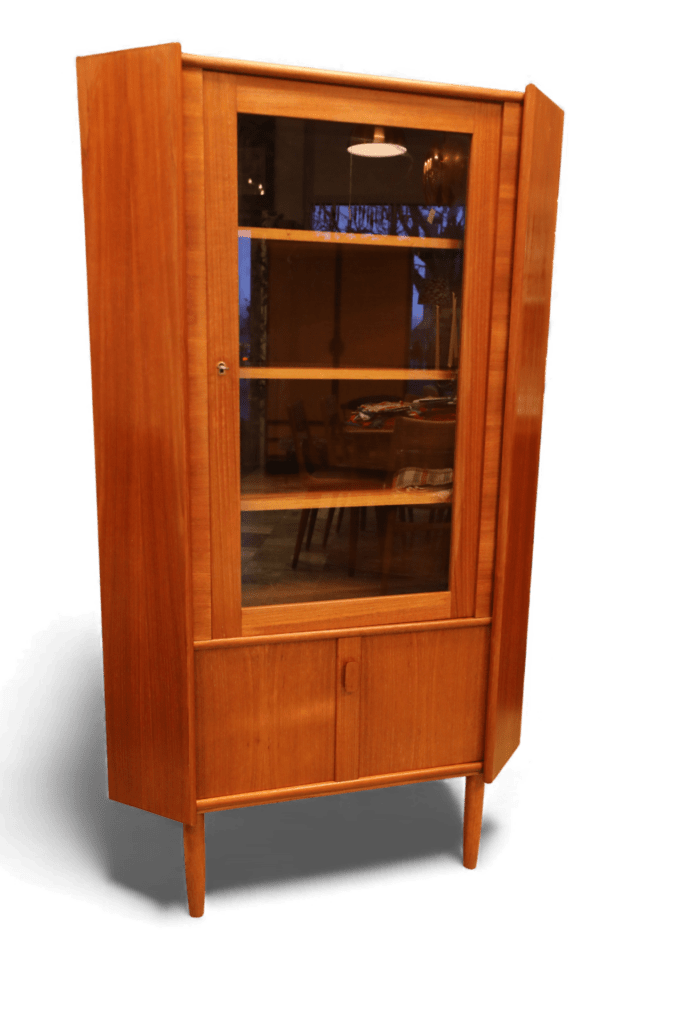 Möbeln är tillverkad av teak i en gyllenbrun ton som utstrålar värme, samt har en magisk ådring ytorna runt om och gör varje hörnskåp unikt! Skåpet har en dekorativ sektion med vitrindörrar som perfekt framhäver föremålen inuti, samt ett mindre skåp med dörrar, både praktiskt och snyggt. Det här är verkligen en möbel som kombinerar funktion och estetik på bästa sätt!