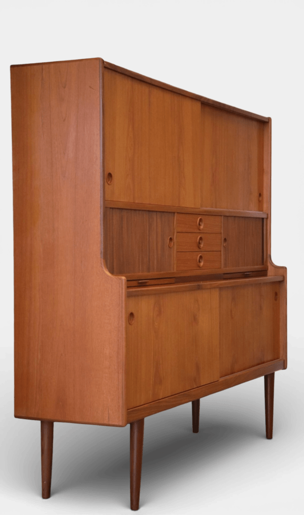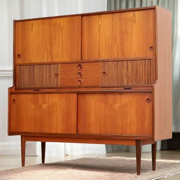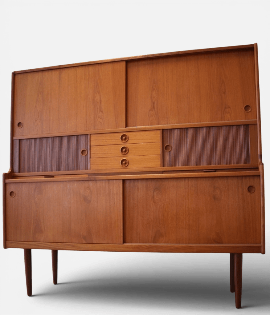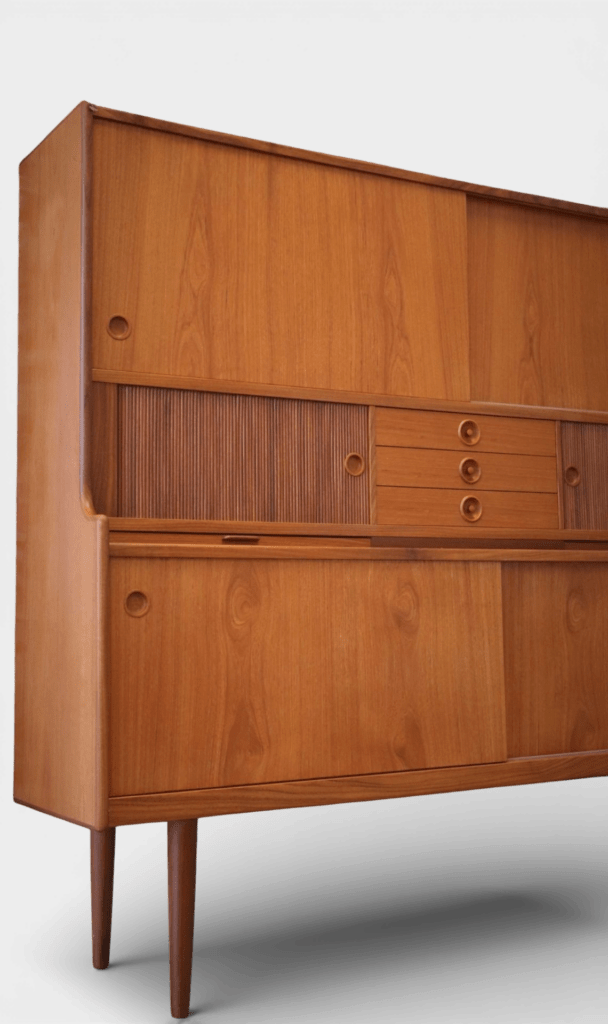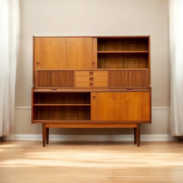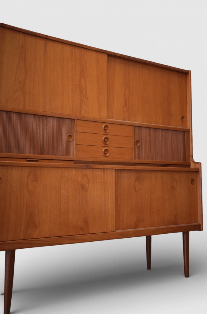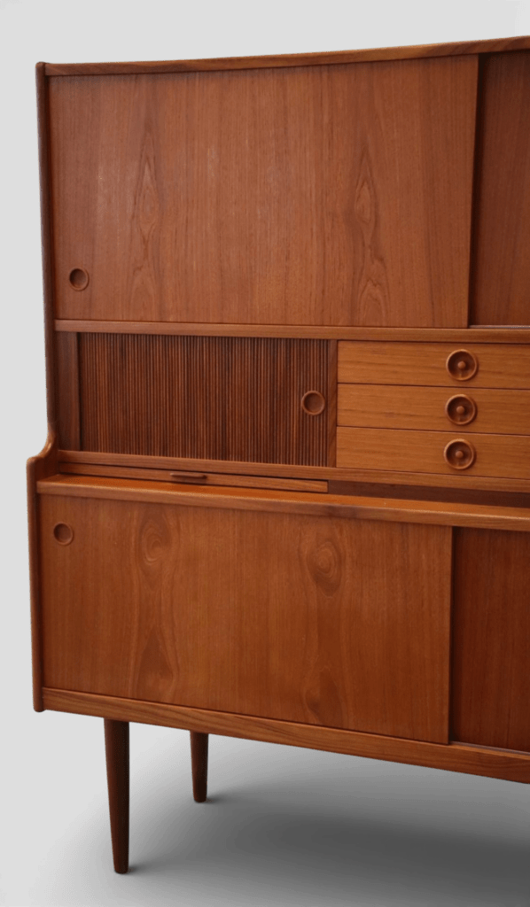 Johannes Andersen för J. Skaaning & Søn Møbelfabrik i Danmark. Ett stilrent och otroligt gediget skåp i teak med barskåp, skjutluckor, jalusiluckor och generöst med förvaring.