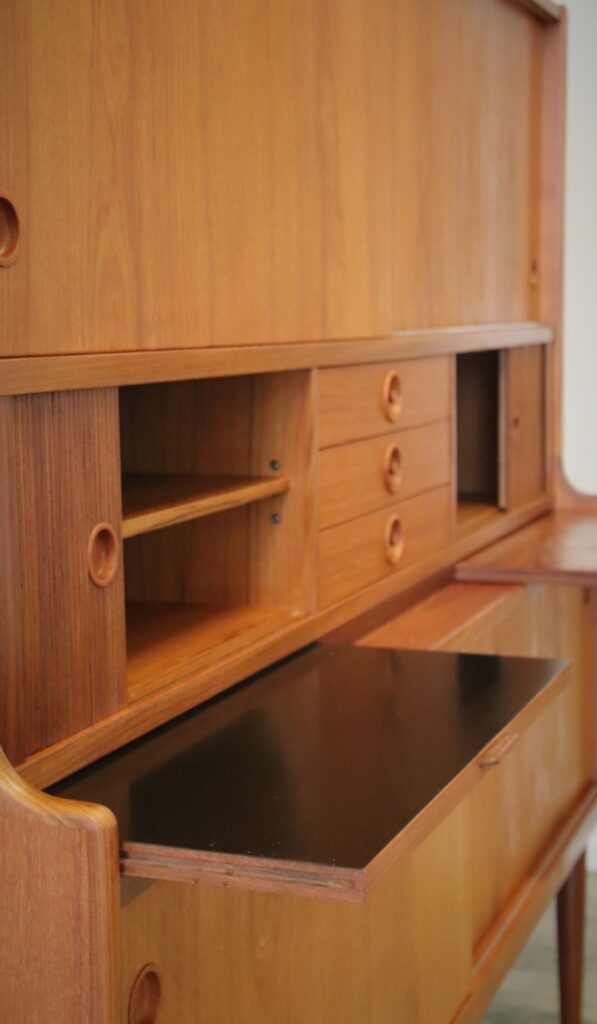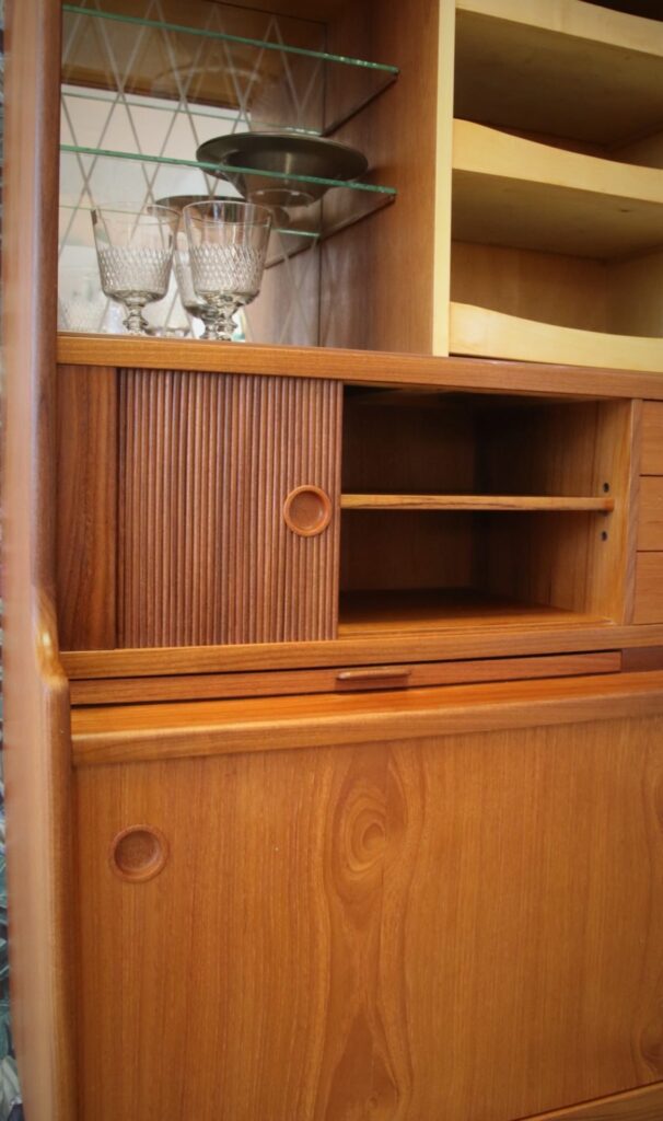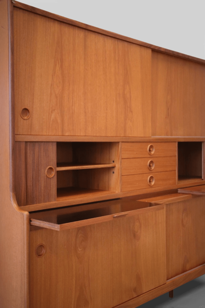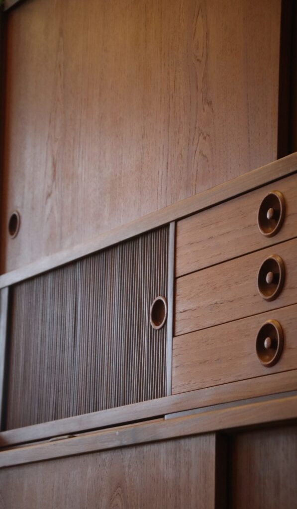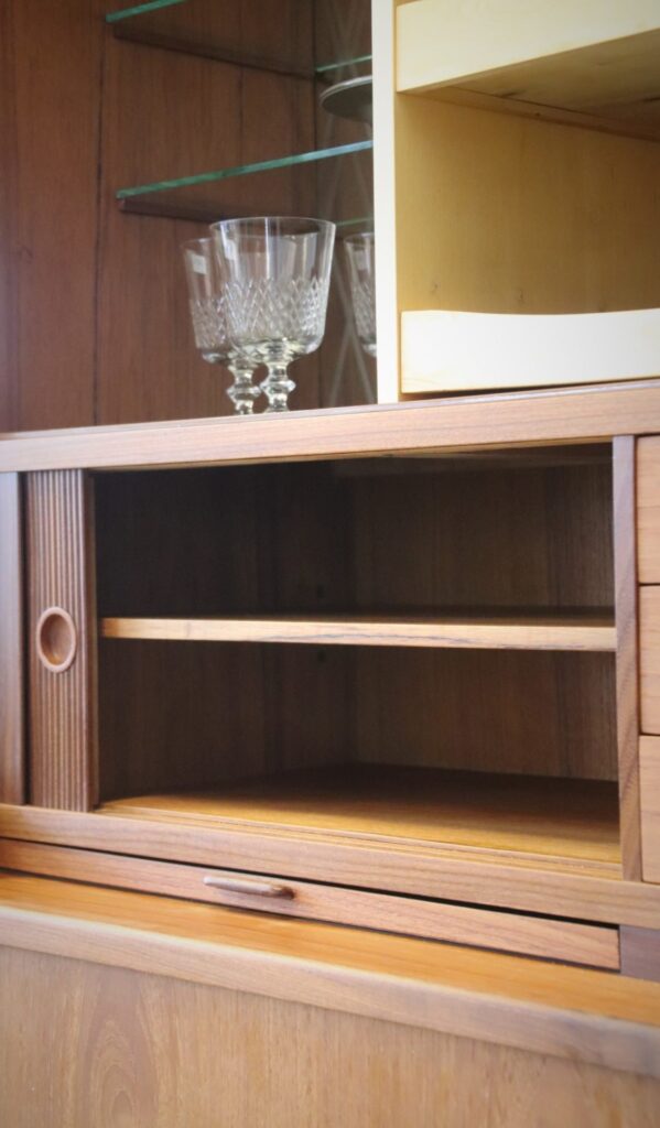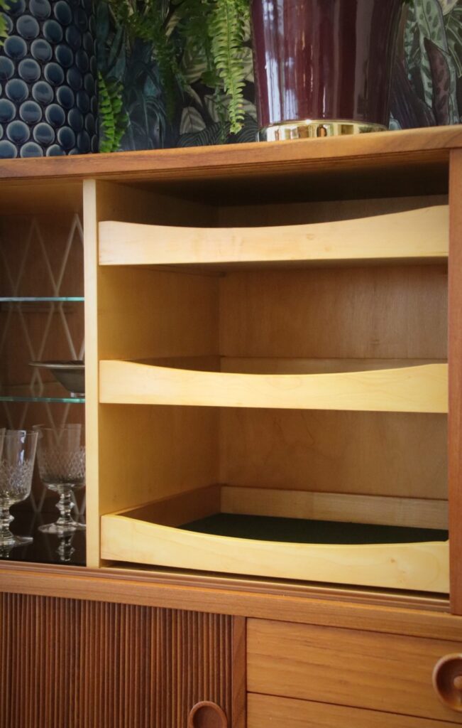 Under de två mindre jalusiskåpen finns även utdragbara skivor: en i teak och en i svart laminat, perfekt som extra avlastningsyta när det behövs.