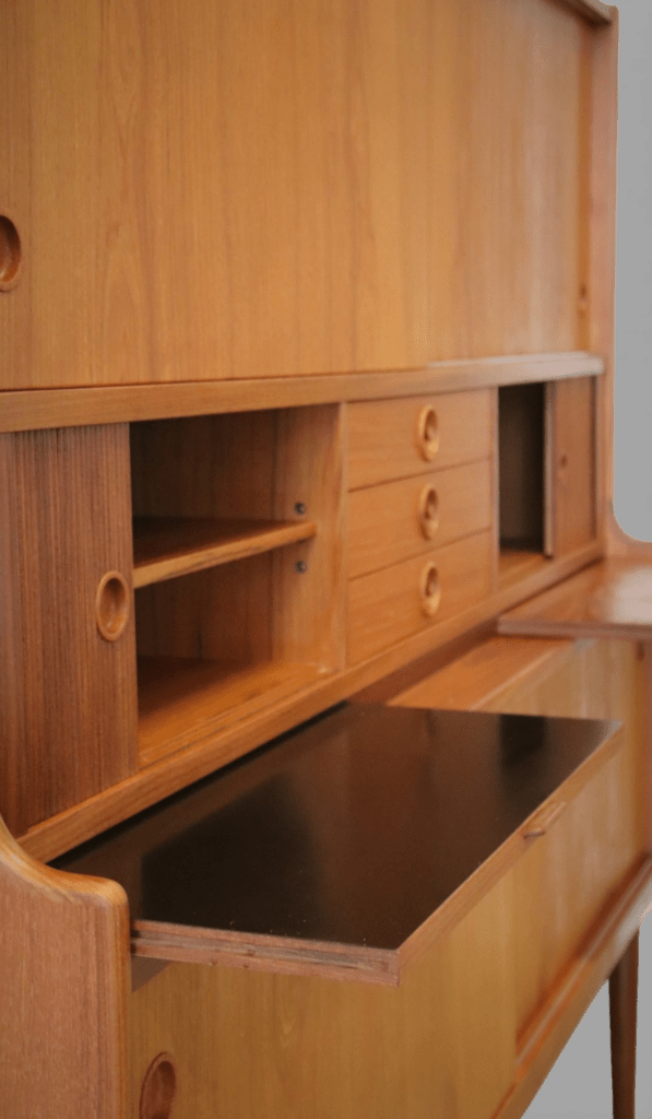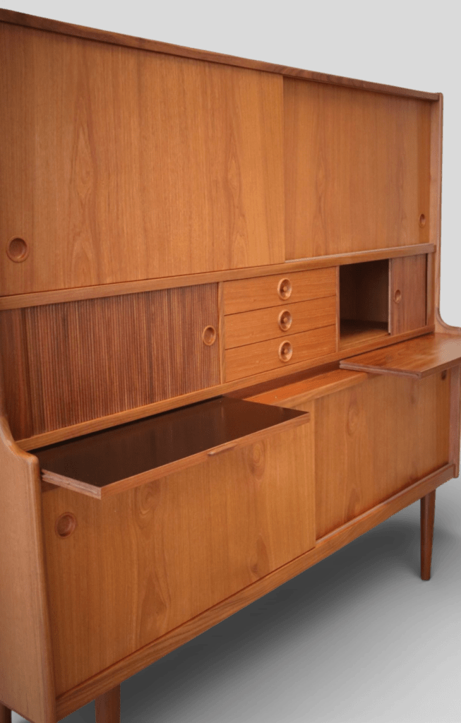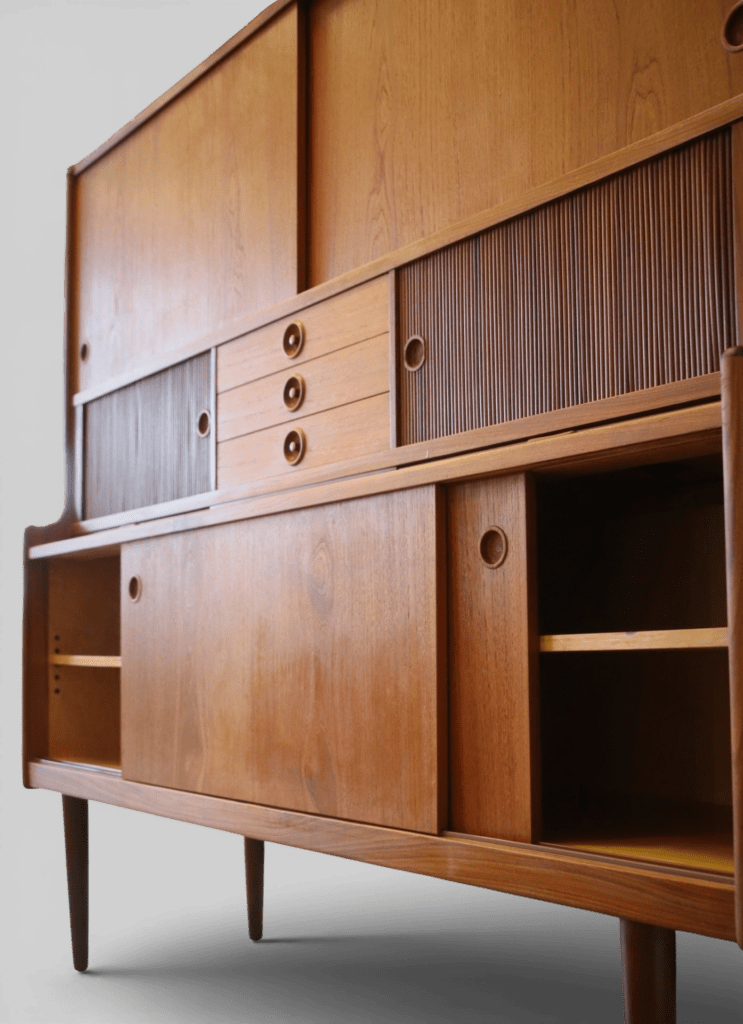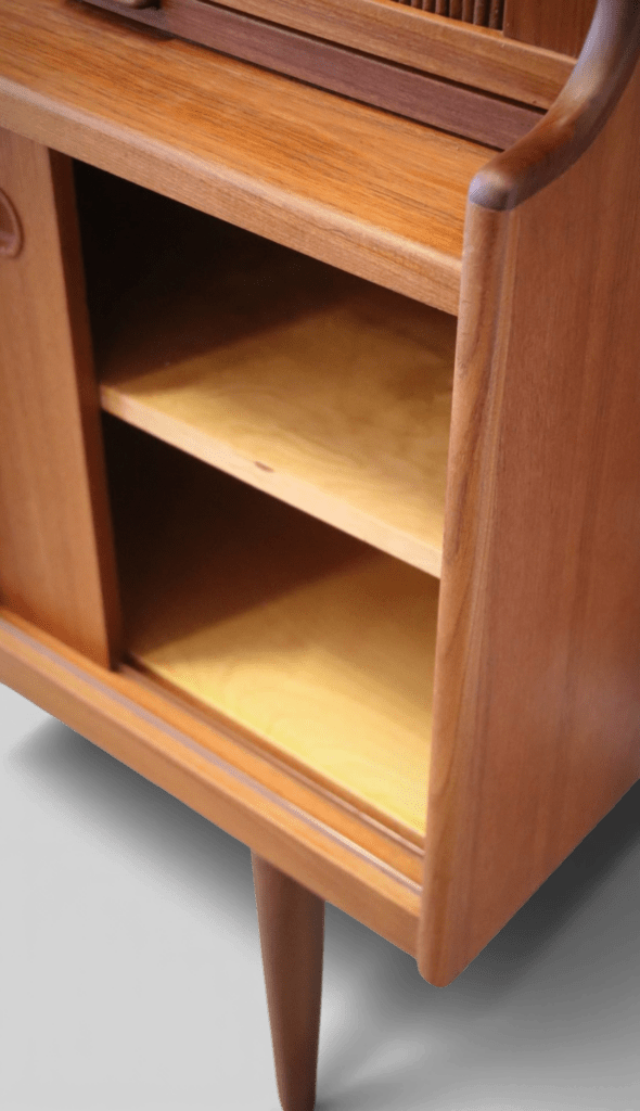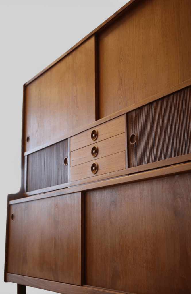 Under de två mindre jalusiskåpen finns även utdragbara skivor: en i teak och en i svart laminat, perfekt som extra avlastningsyta när det behövs.