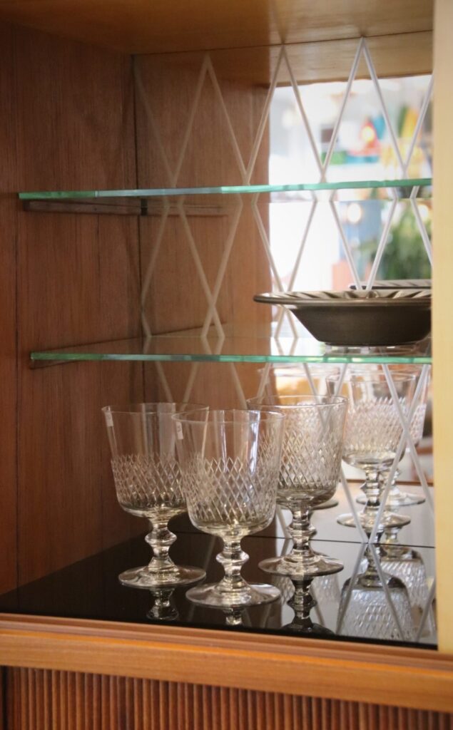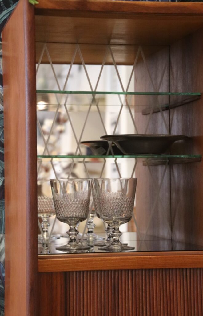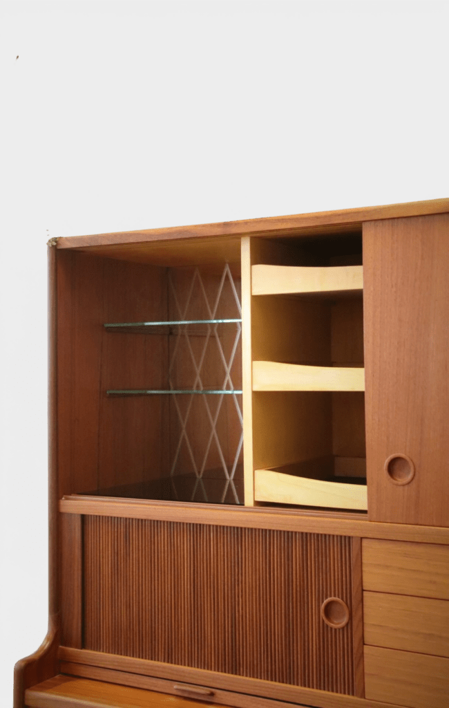 Överdelen har två skjutluckor med hyllplan bakom, tre lådor samt ett barskåp med spegel. Barskåpet är riktigt härligt tidstypiskt med två hyllplan i glas, och spegeln har ett vackert etsat mönster. Även bottenplanet i barskåpet är i svart glas, vilket ger en extra elegant känsla.