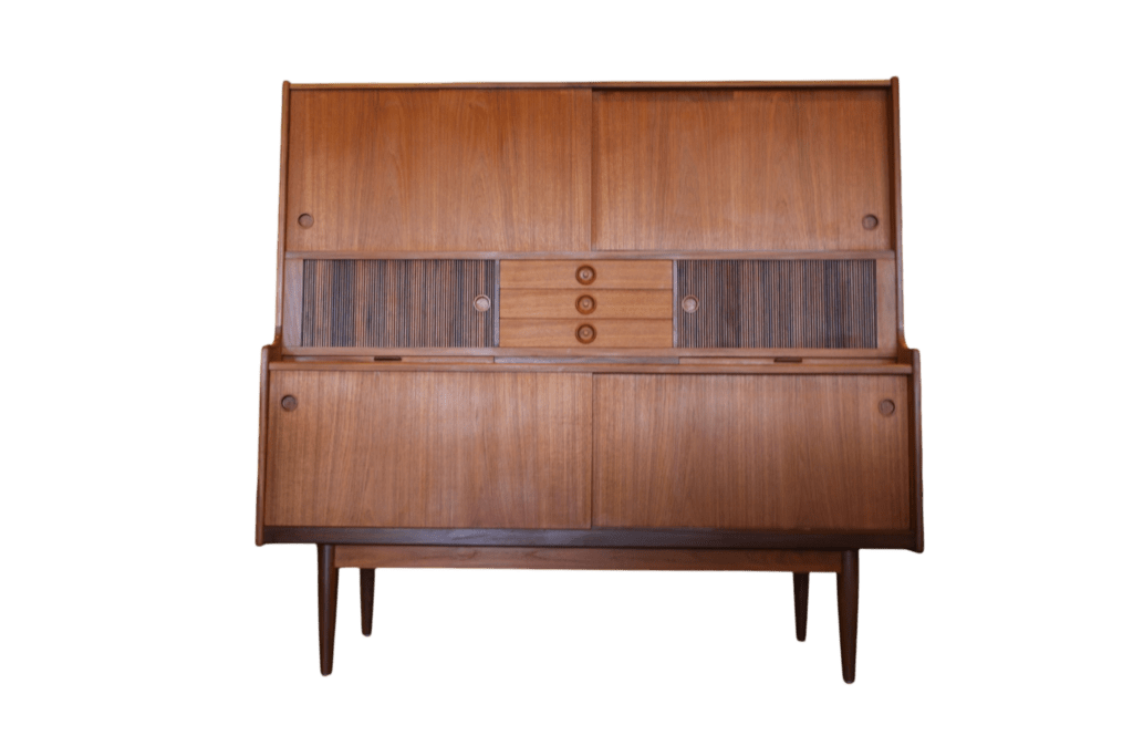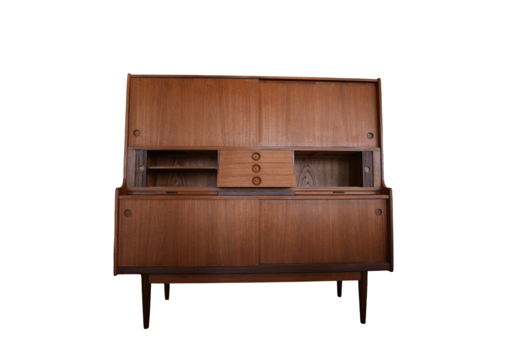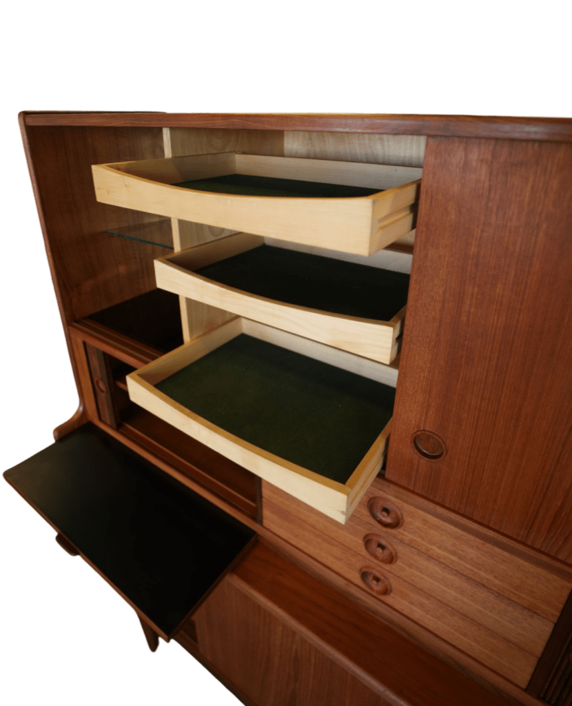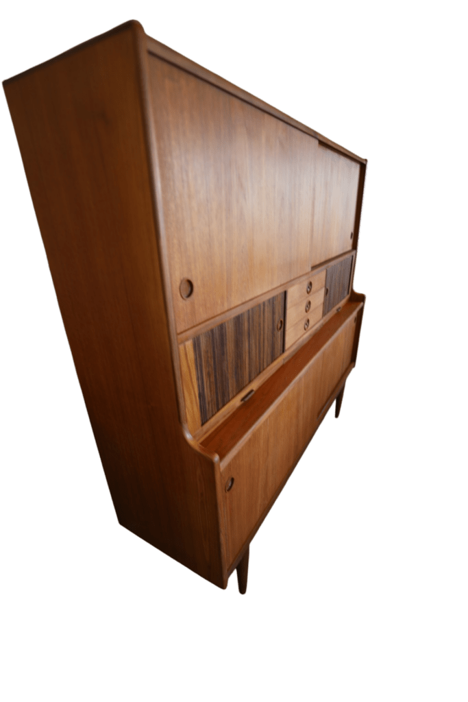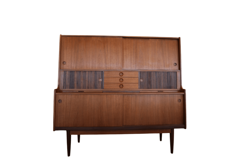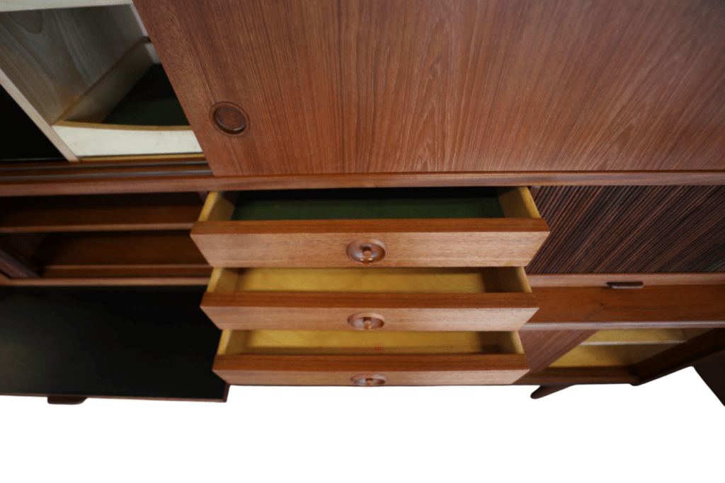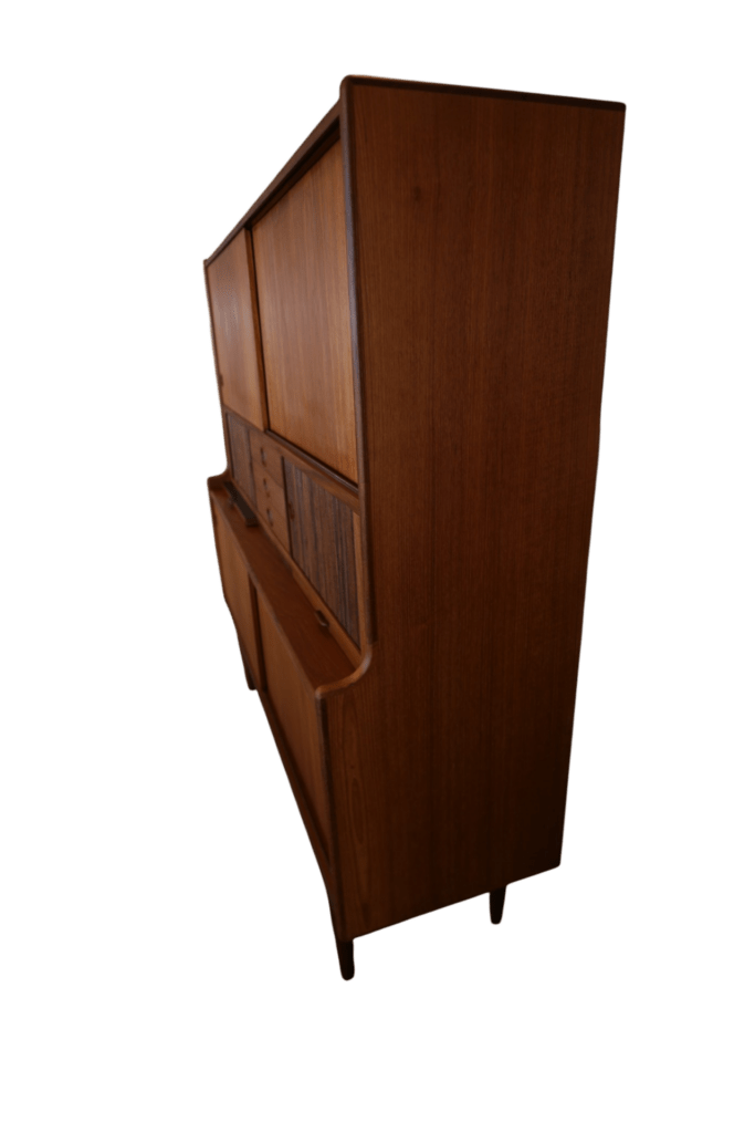 Det här skåpet är tillverkat i teak och formgivet av Johannes Andersen för J. Skaaning & Søn Møbelfabrik i Danmark. Trots sin något nättare storlek bjuder det på en imponerande kombination av både design och funktion, här har inget lämnats åt slumpen. Ett stilrent uttryck möter generös förvaring, smart uppdelad bakom jalusiluckor, skjutluckor och i lådor.