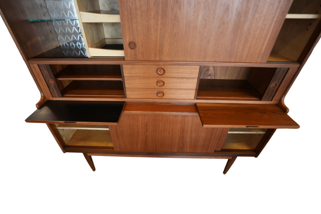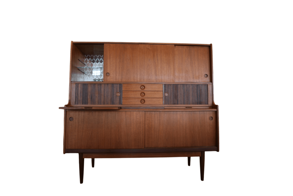 Överdelen rymmer två skjutluckor med hyllplan bakom, tre lådor samt ett fantastiskt barskåp. Barskåpet är något alldeles extra, med en vackert mönstrad spegel som skapar ett levande ljusspel. Här finns även ett hyllplan i glas och en botten i svart glas – en elegant och tidstypisk detalj som lyfter helheten ytterligare.