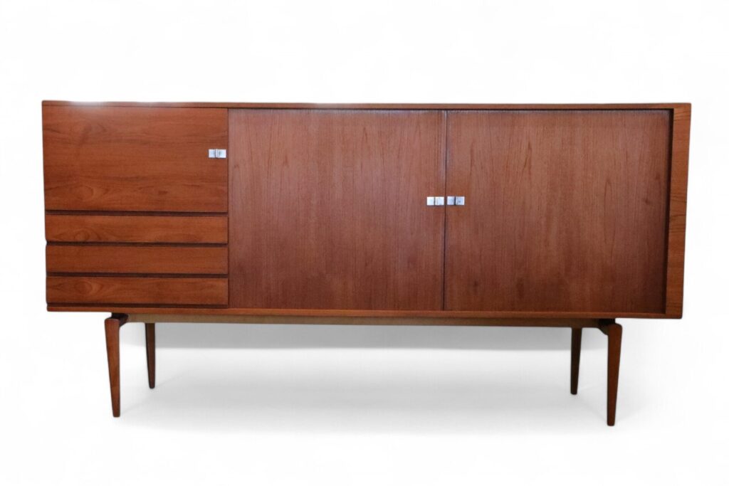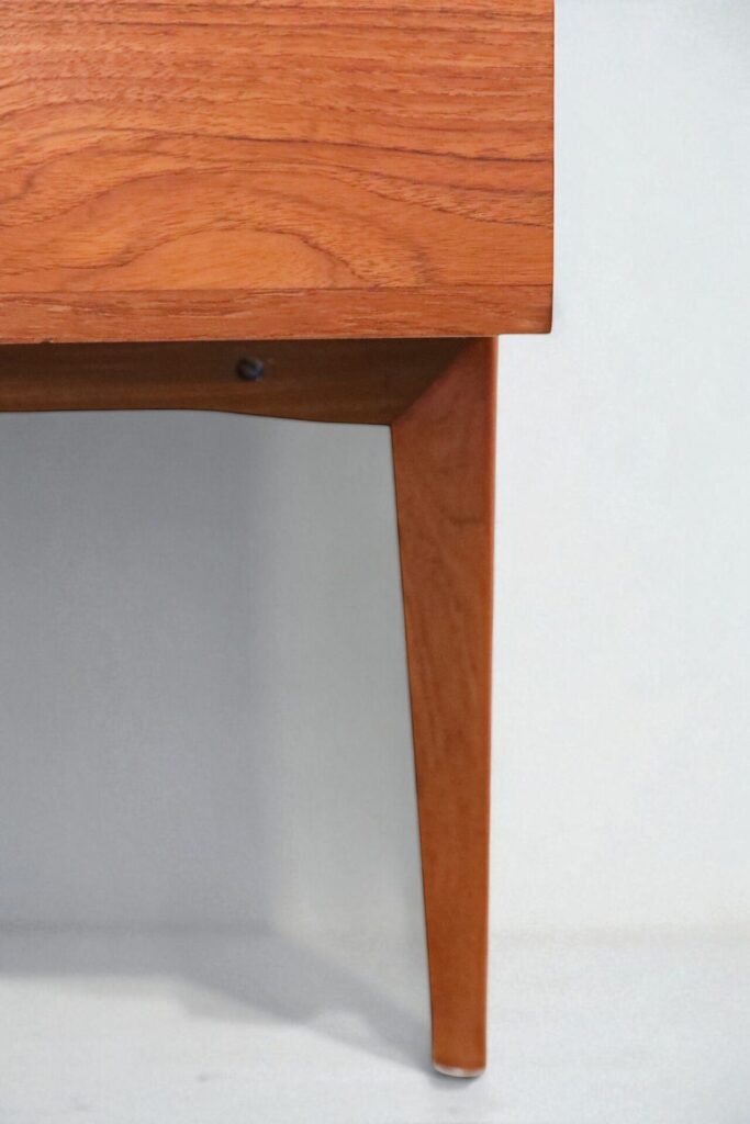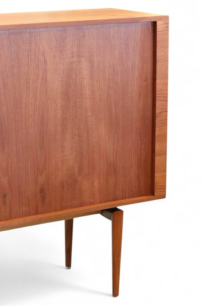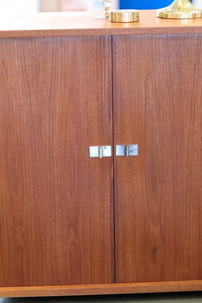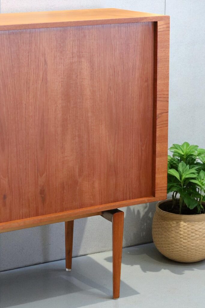 Möbeln är i teak och har två jalusiluckor som pryds av en vacker ådring. Luckorna är tillverkade med en fin precision att de ser ut att vara skapade i ett helt stycke, utan några synliga skarvar och hantverket höjer verkligen intrycket av möbeln. På luckorna finns nätt handtag i metall, vilket både underlättar användning och bidrar till det stilrena utseendet. Jalusiluckorna gör det inte bara enkelt att komma åt skåpet även i de mest trånga utrymmen, utan de förstärker också det eleganta uttrycket som kännetecknar hela möbeln. Det är en perfekt kombination av funktionalitet och estetik, vilket gör att möbeln passar in i både moderna och klassiska inredningar.