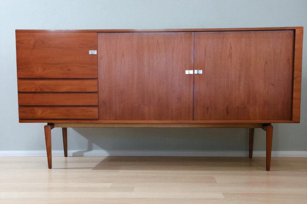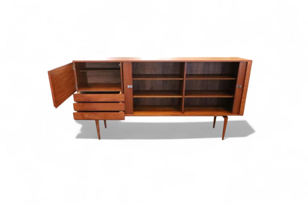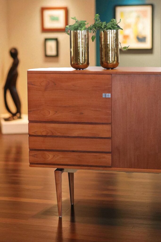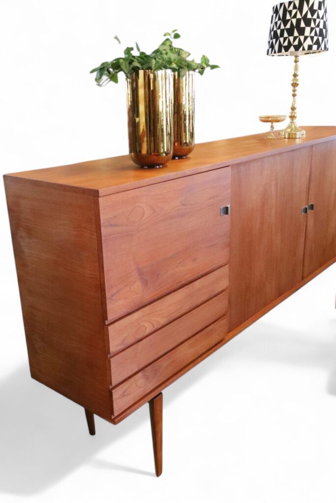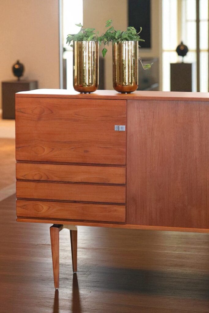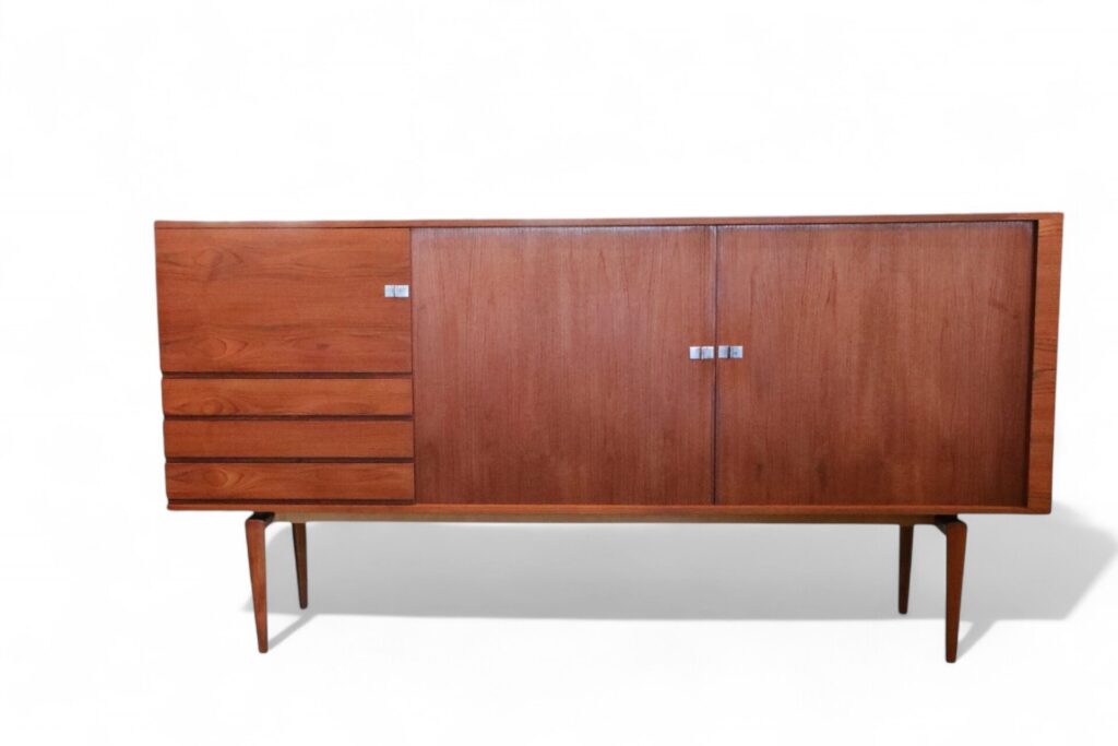Möbeln är i teak och har två jalusiluckor som pryds av en vacker ådring. Luckorna är tillverkade med en fin precision att de ser ut att vara skapade i ett helt stycke, utan några synliga skarvar och hantverket höjer verkligen intrycket av möbeln. På luckorna finns nätt handtag i metall, vilket både underlättar användning och bidrar till det stilrena utseendet. Jalusiluckorna gör det inte bara enkelt att komma åt skåpet även i de mest trånga utrymmen, utan de förstärker också det eleganta uttrycket som kännetecknar hela möbeln. Det är en perfekt kombination av funktionalitet och estetik, vilket gör att möbeln passar in i både moderna och klassiska inredningar.