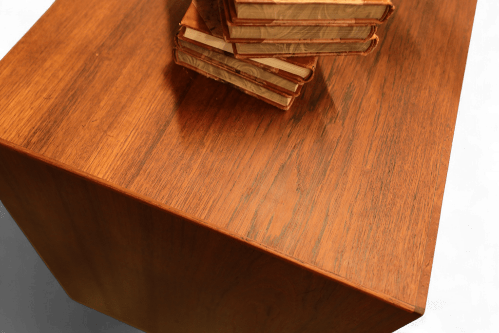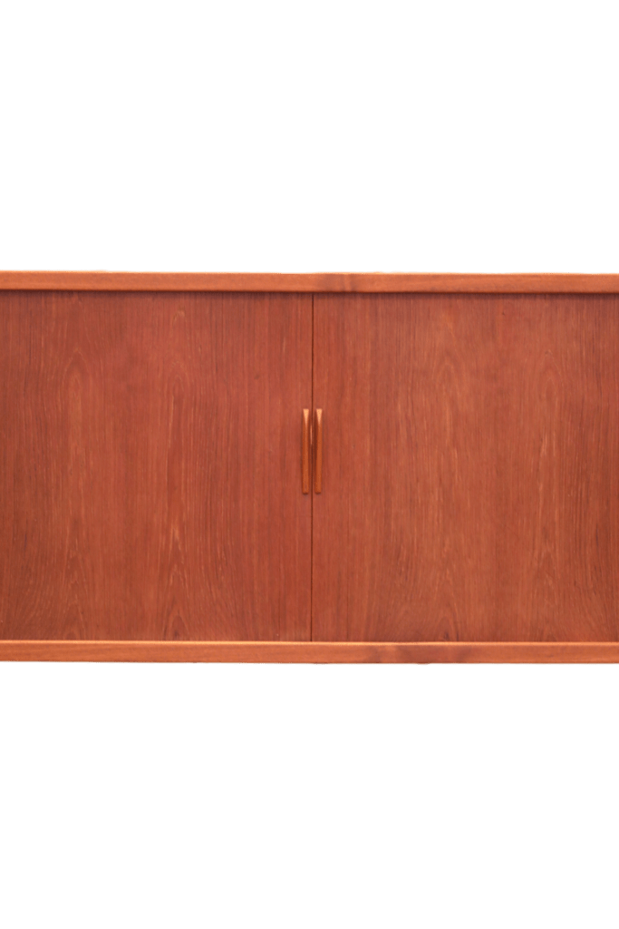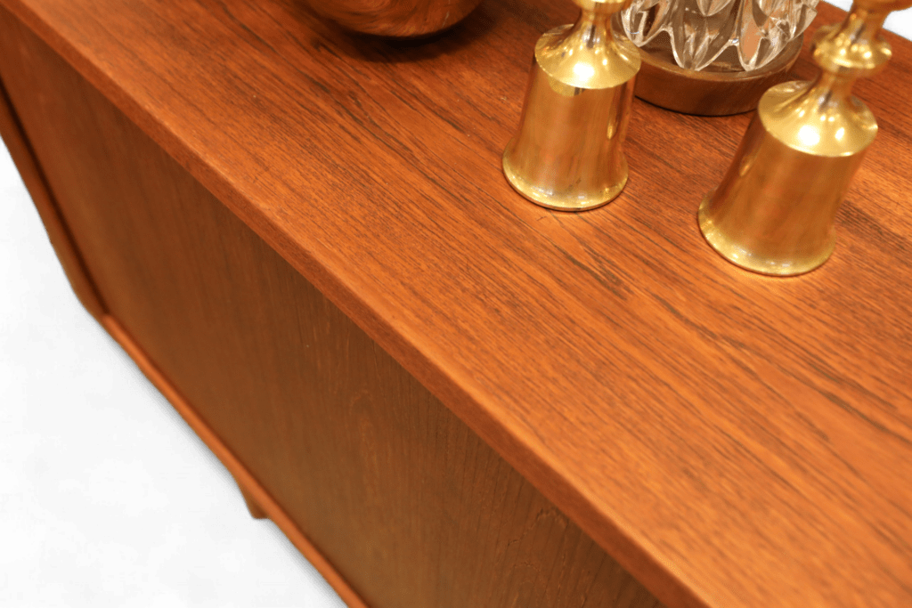 Möbeln är i teak och har två jalusiluckor som pryds av en vacker ådring. Luckorna är tillverkade med en fin precision att de ser ut att vara skapade i ett helt stycke, utan några synliga skarvar, vilket verkligen höjer intrycket av möbeln. På luckorna finns de nätta integrerade handtagen som både underlättar användning och bidrar till det stilrena utseendet.