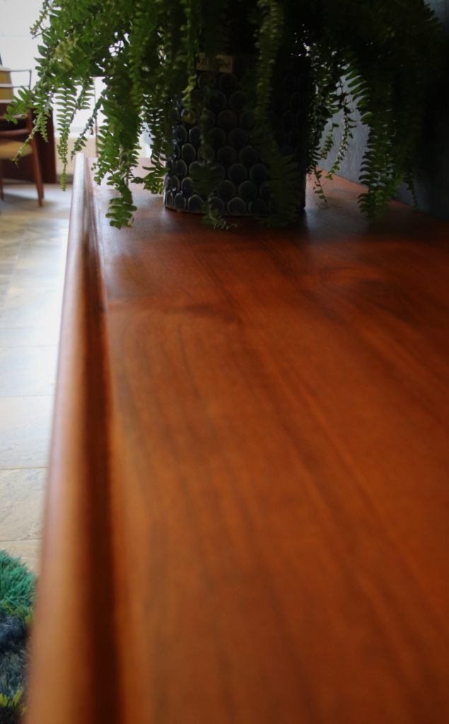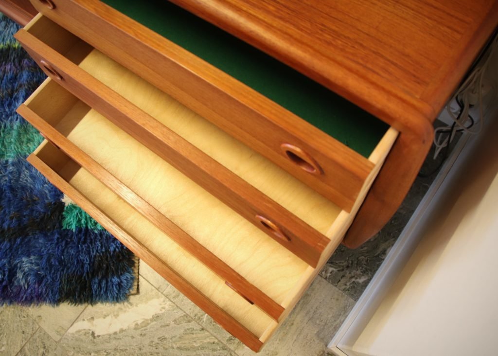 Sideboardet har mjuka organiska former med vackra ytor runt om. Det finns fyra st lådor varav en är filtklädd. Lådorna är fräscha och är helt i trä. På samtliga luckor och lådor sitter det integrerade handtag likt ögonlock.