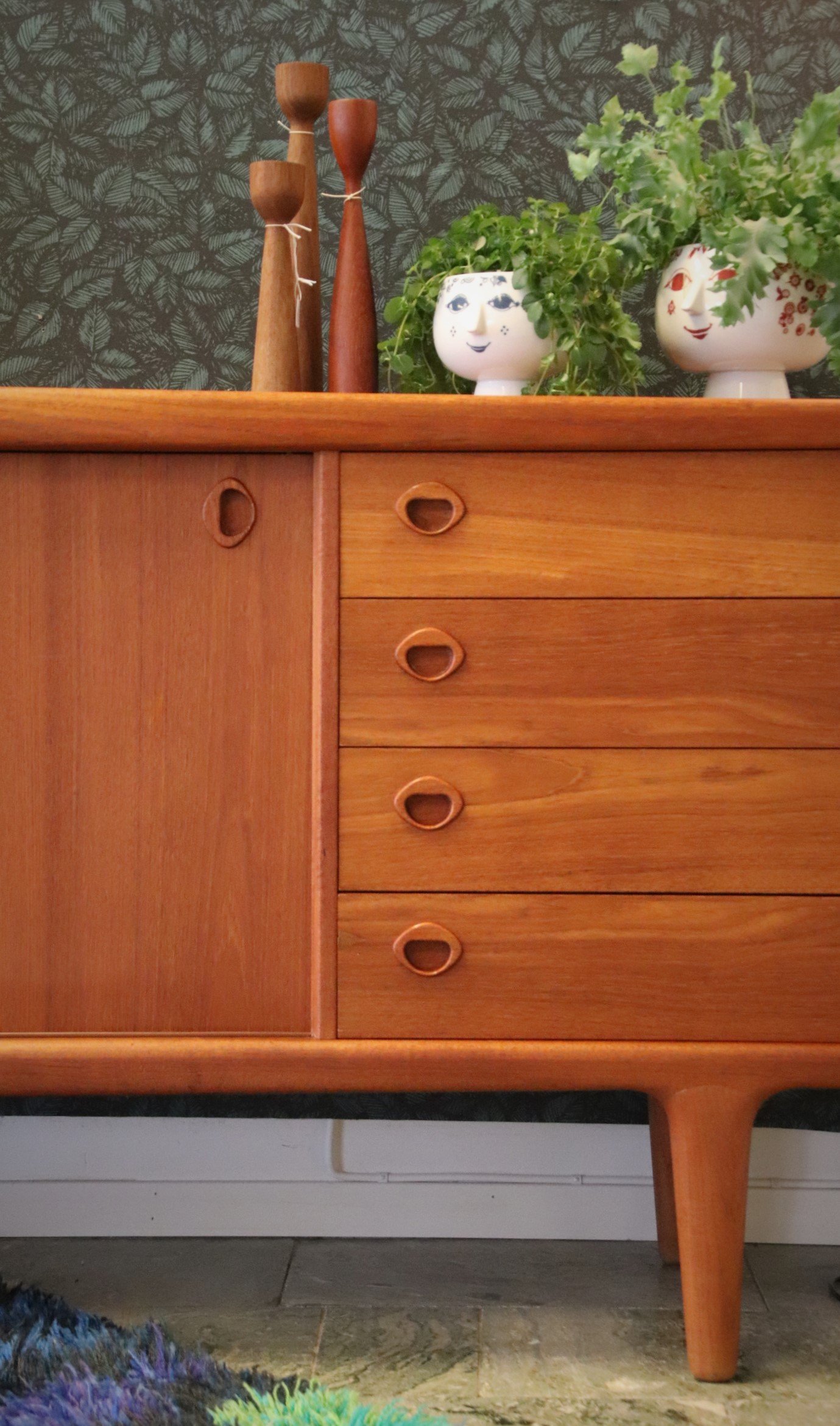 Sideboardet har mjuka organiska former med vackra ytor runt om. Det finns fyra st lådor varav en är filtklädd. Lådorna är fräscha och är helt i trä. På samtliga luckor och lådor sitter det integrerade handtag likt ögonlock.