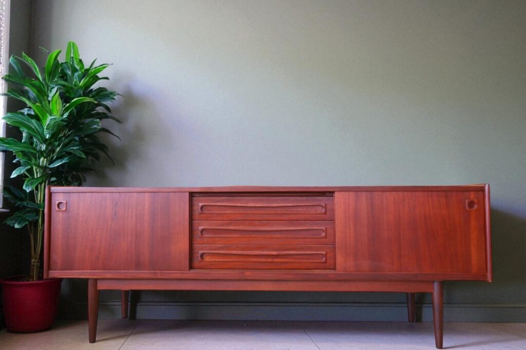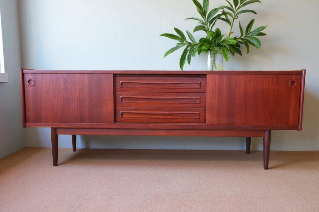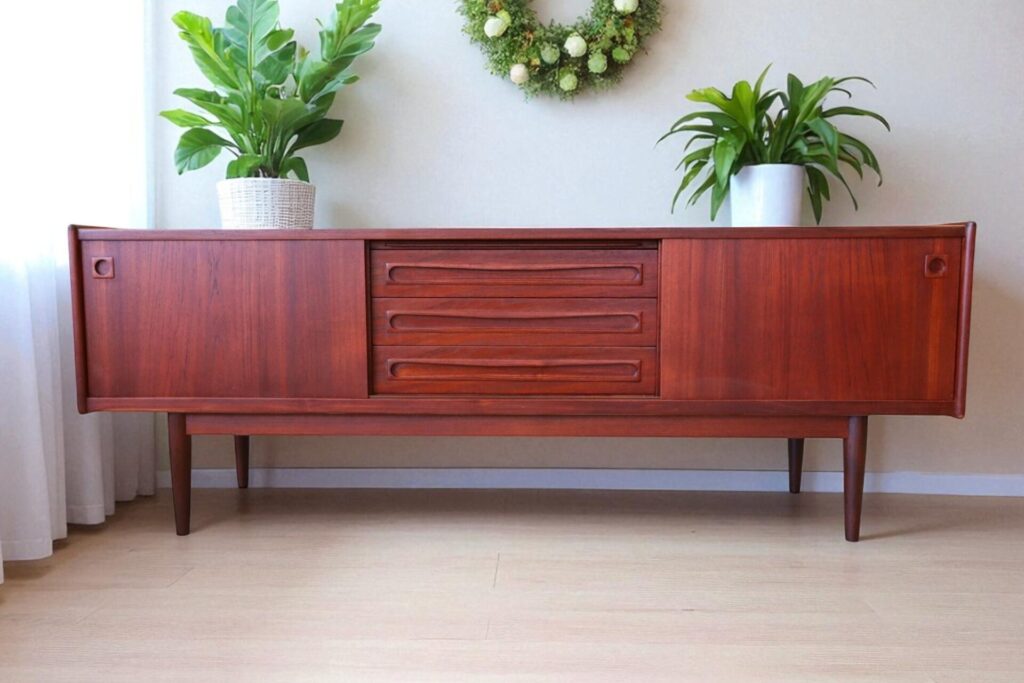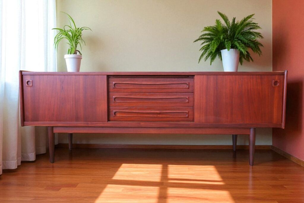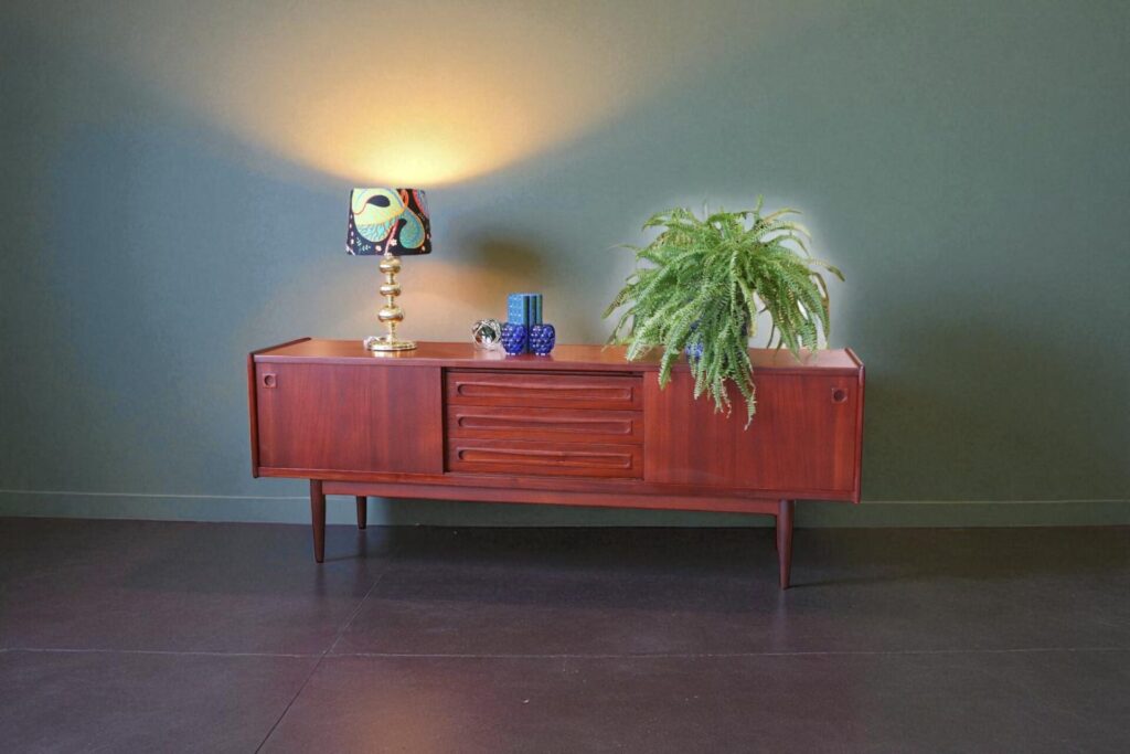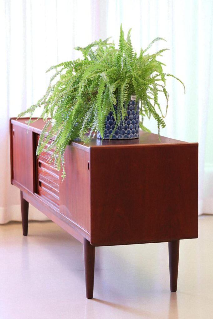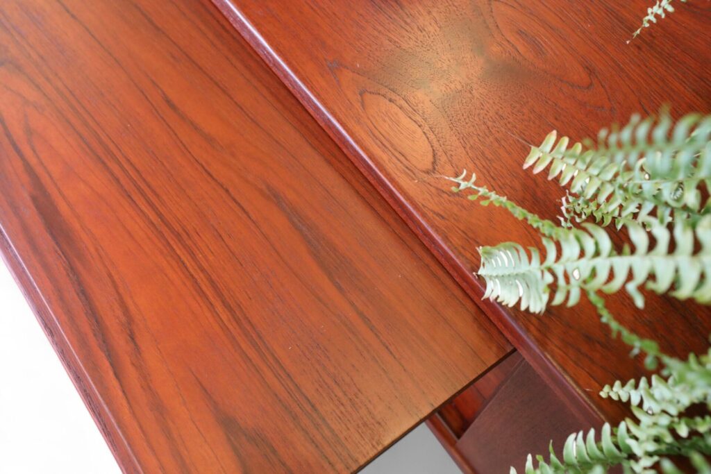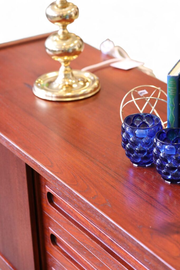 Ytorna är i teak som har en mörk och gyllene ton som verkligen framhäver dess naturliga skönhet. Möbeln har alla ytor omfanerade med den högkvalitativa teak som användes vid tillverkningen av möbler förr i tiden och som verkligen har en unik karaktär. Nuförtiden är det endast den odlade teak som används i modern tillverkning, samma typ av trä som ofta ses i nytillverkade trädgårdsmöbler. Sideboardet går även att möblera med möbler i palisander då den har en mycket djup och härlig ton!
