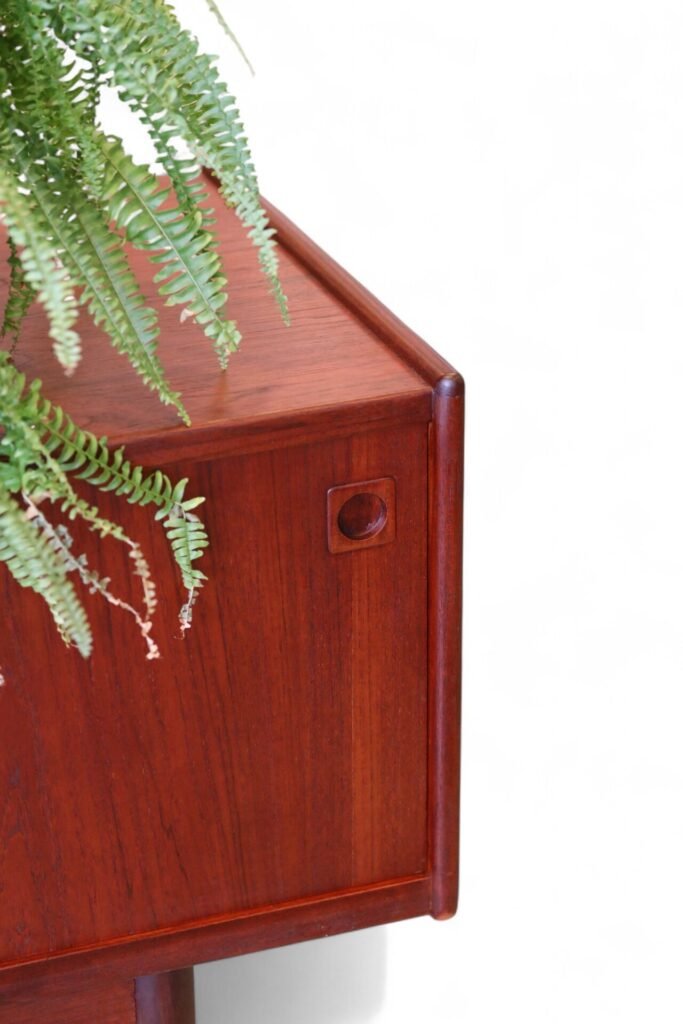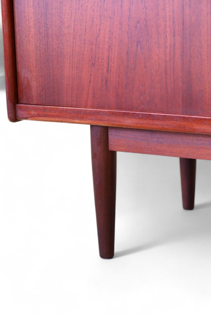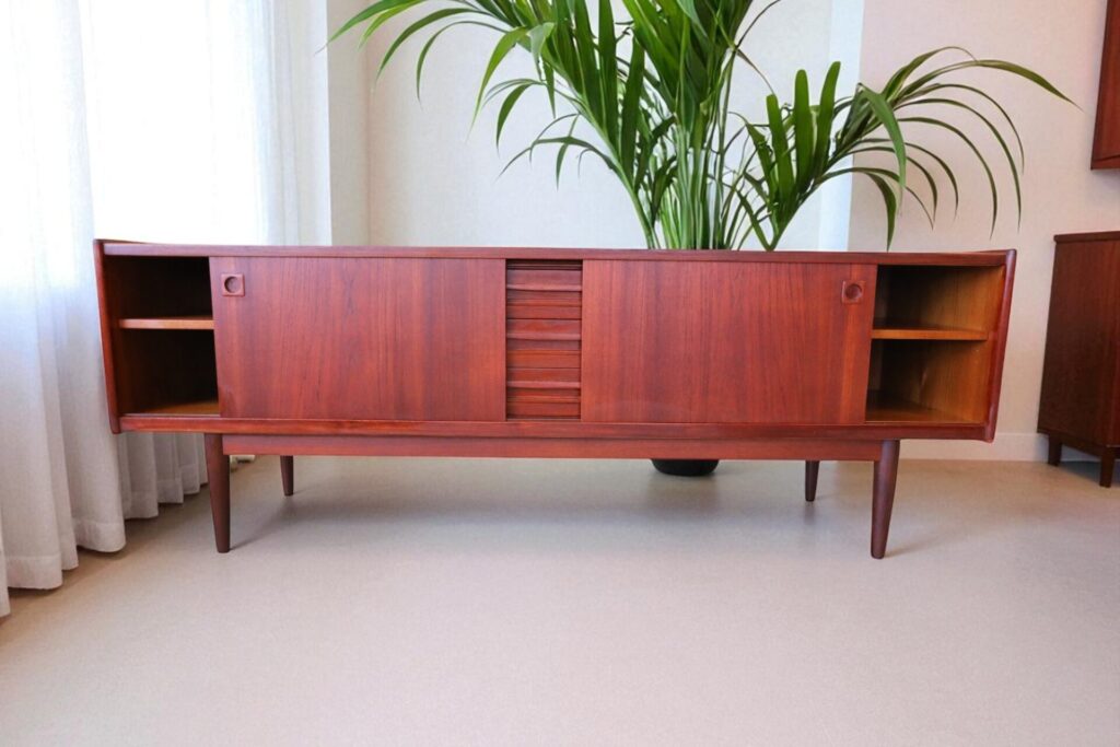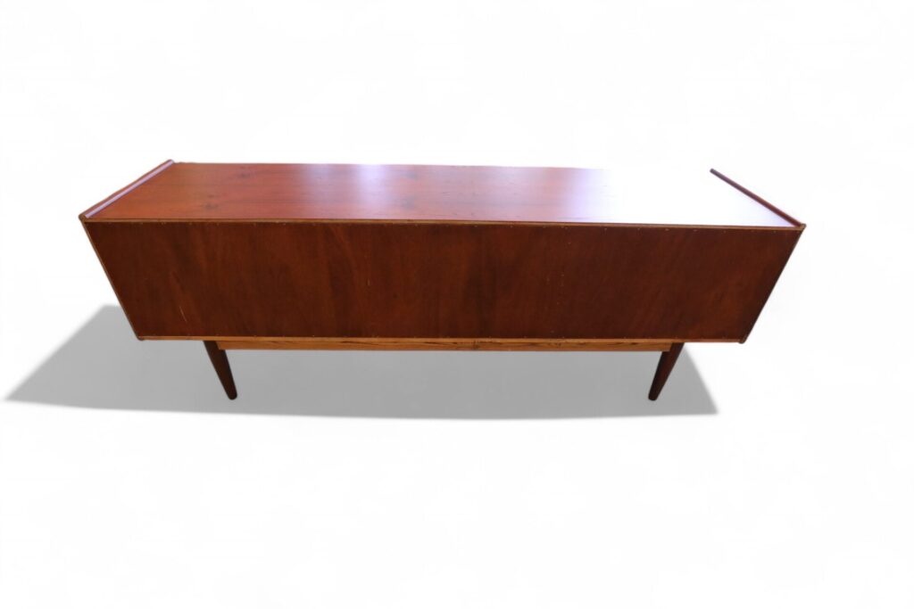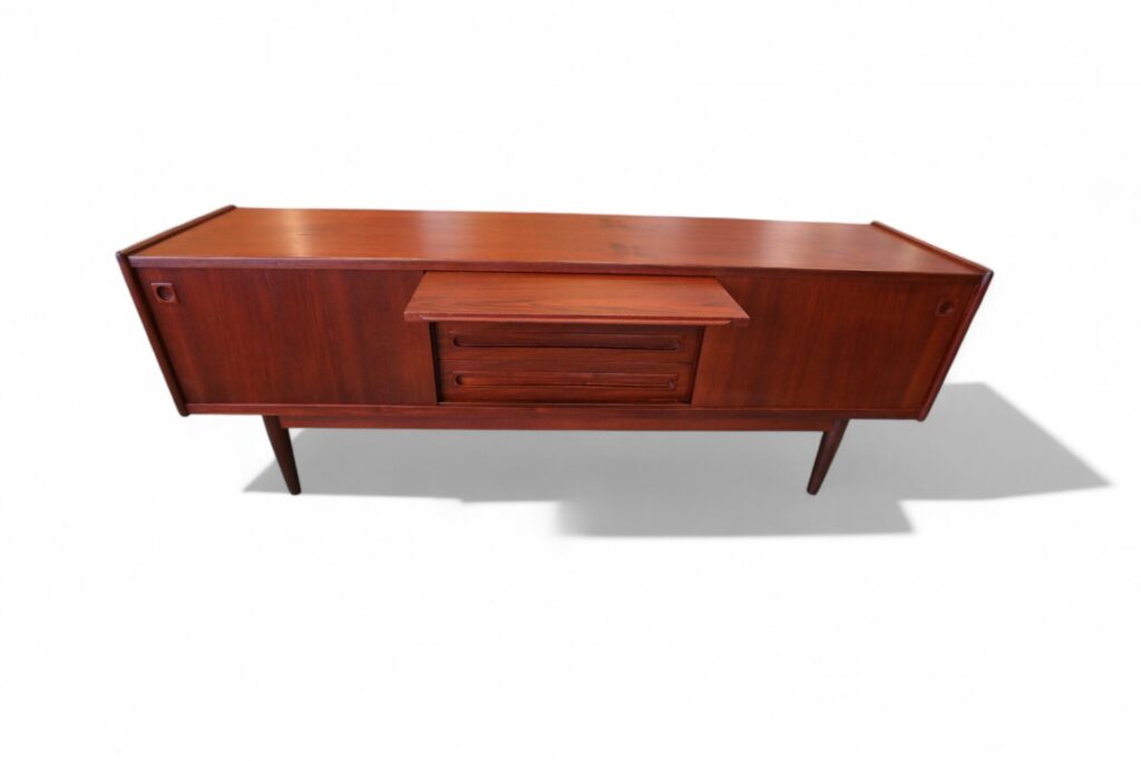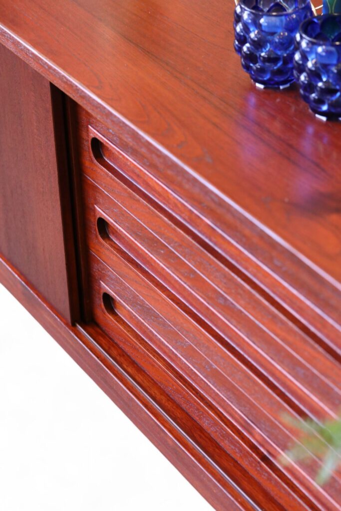 Ett makalöst vackert och smakfullt sidebord av allra högsta kvalité! Sideboardet är formgivet av Johannes Andersen för Uldum Møbler i Danmark och har långa eleganta linjer i en teak i en något mörkare ton. Ådringen på alla ytor är mycket vacker och även inredningen i skåpet är i ädelträ.